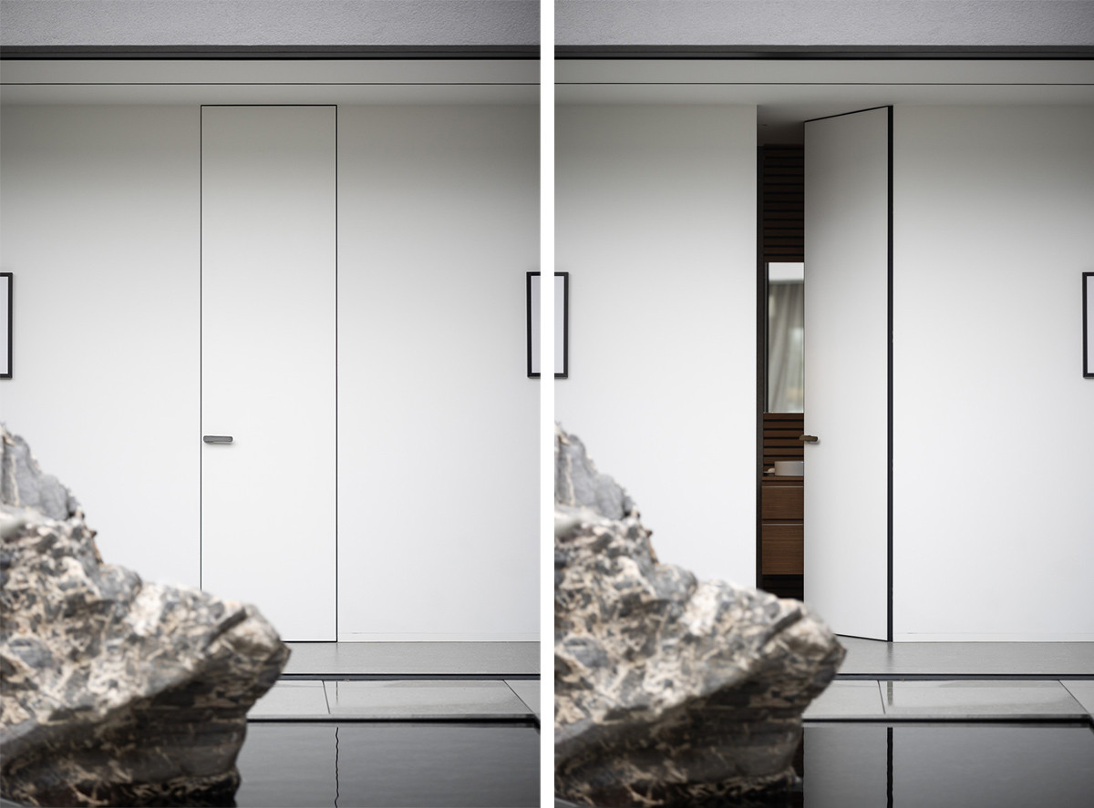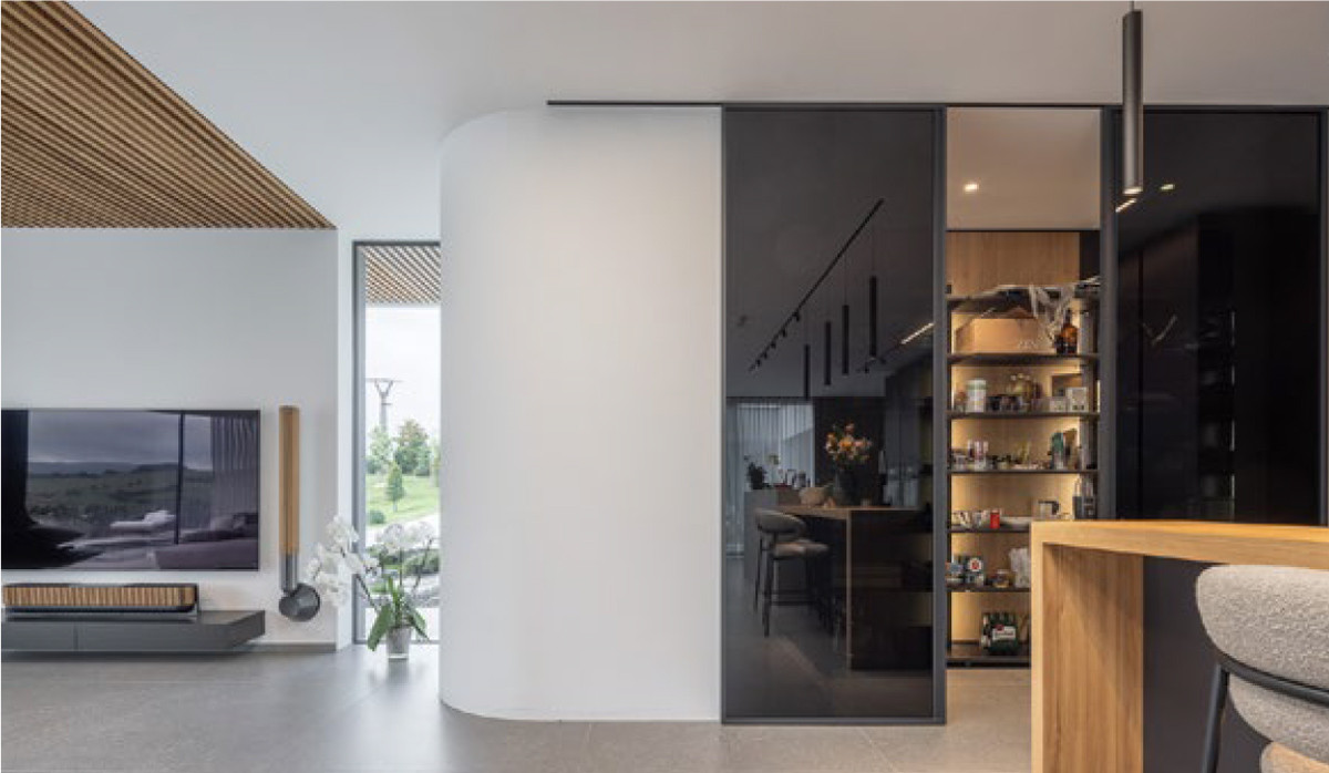 Koncepce interiéru domu je založena na rovnoběžnosti roviny podlahy a podhledu ve výšce 2800 mm. Zvolenou výšku dodržují i dveře ve skryté zárubni, které stejně jako obklad stěn EFEKTA, stínící markýzy a schodiště do suterénu, vyrobila a namontovala firma JAP. „Otočné dveře MASTER bez nadpraží ve skryté zárubni AKTIVE nemají s touto výškou žádný problém díky unikátní konstrukci, která je tvořena hliníkovým rámem, takže se architekti nemuseli nijak omezovat. Designovou parádou je jemný kontrast mezi bílým opláštěním dveří a černou linkou hliníkového rámu,“ upřesňuje jednatel firmy JAP, Petr Paksi a doplňuje: „Myslím, že se podařilo funkčně začlenit i prosklené posuvné dveře v rámu IDEA, které přirozeně oddělují obytné a servisní místnosti. Navíc výborně doplnily minimalistický trend interiéru“.