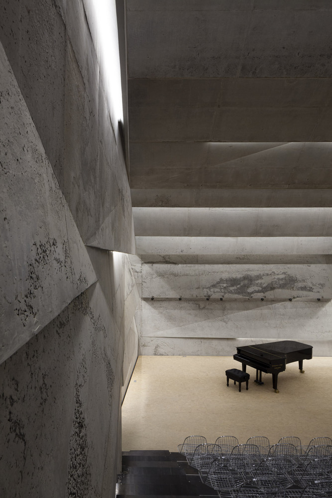 Beton v hlavní síni ponechali architekti v jeho surové podobě. Jeho živé povrchy slouží k lepší akustice, tlumení zvuku a absorpci středně vysokých tónů. Za nakloněnými hranami stěn se ukrývá potřebné osvětlení a vzduchotechnika. Skrze drobné skuliny se umělé světlo rozléhá po celém sálu. Jeviště je vybaveno moderním LED osvětlením.