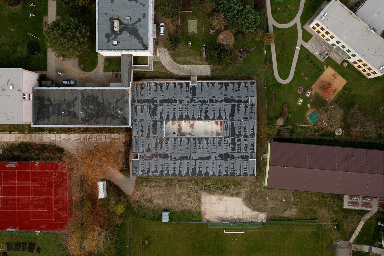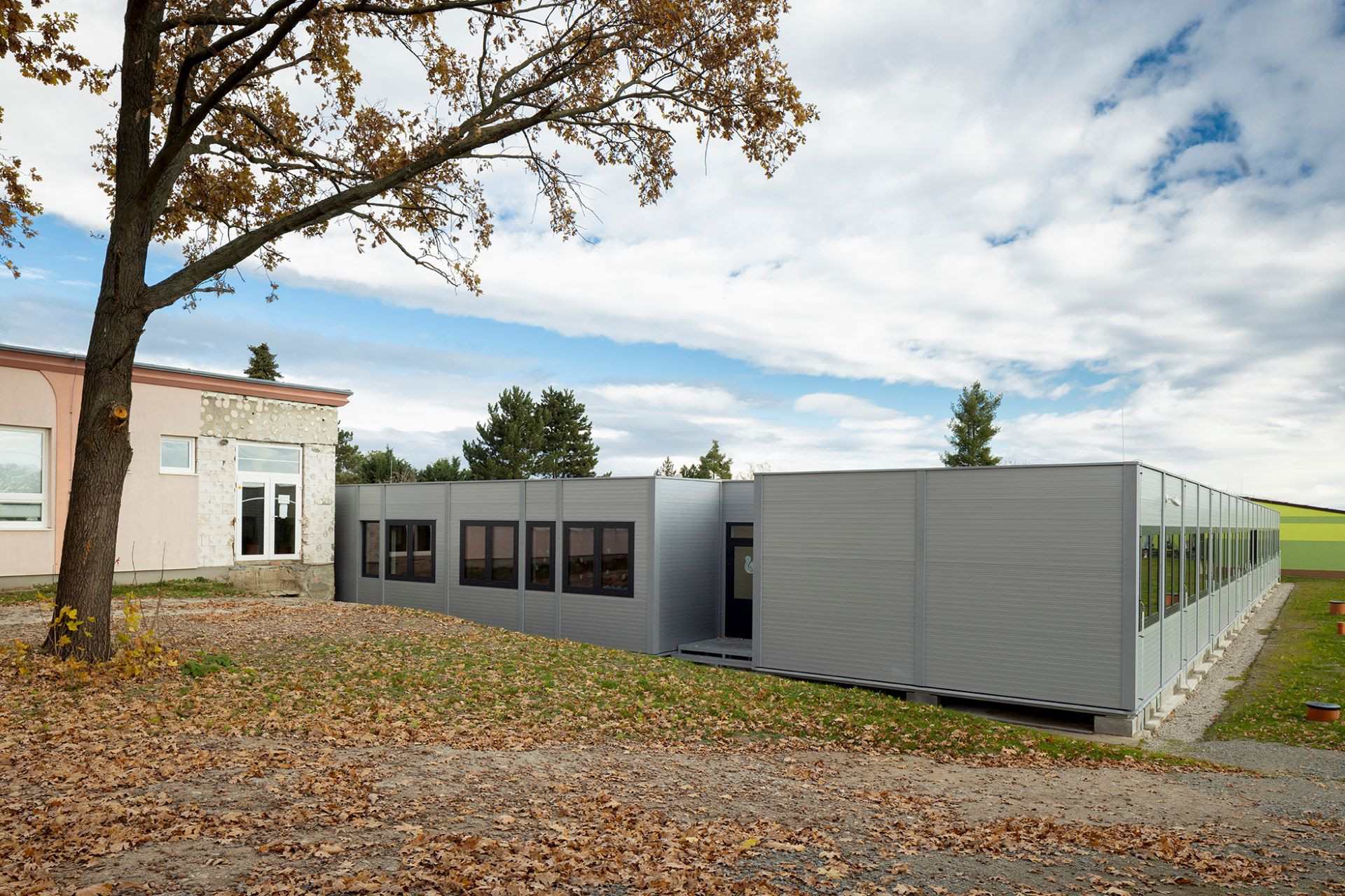 Dosavadní základní škola je téměř v havarijním stavu. Díky nestabilnímu podloží, které je částečně z jílu, škola neustále „pracuje" a vznikají v ní velké trhliny. Proto bylo nutné situaci akutně řešit. Vhodným východiskem se zdála být modulární stavba. Rychlost, ale také možnost ji následně rozebrat, hrály zásadní roli. Bylo vhodné, aby provizorní škola stála blízko areálu původní školy, kde je stále funkční budova jídelny a školní družiny. Využil se pozemek, kde stála poškozená budova tělocvičny a kde je navržena stavba nové sportovní haly.