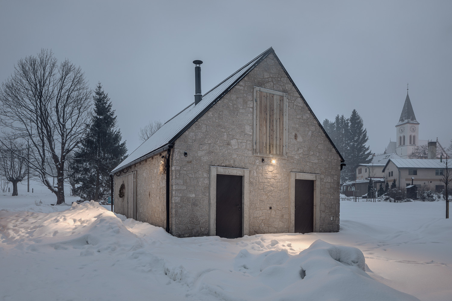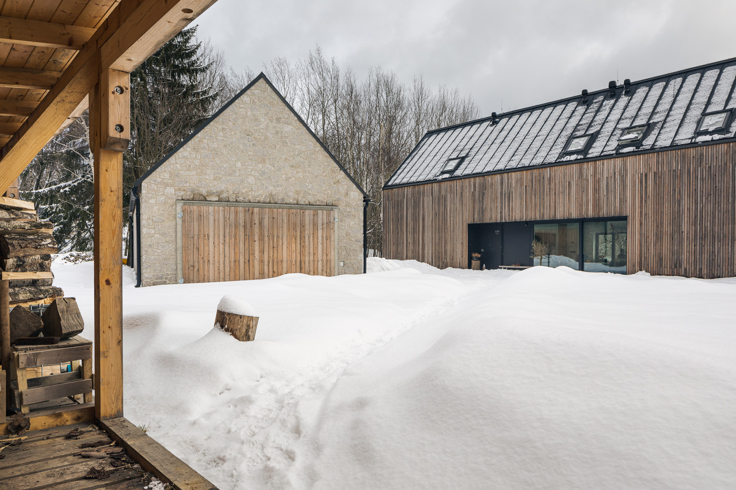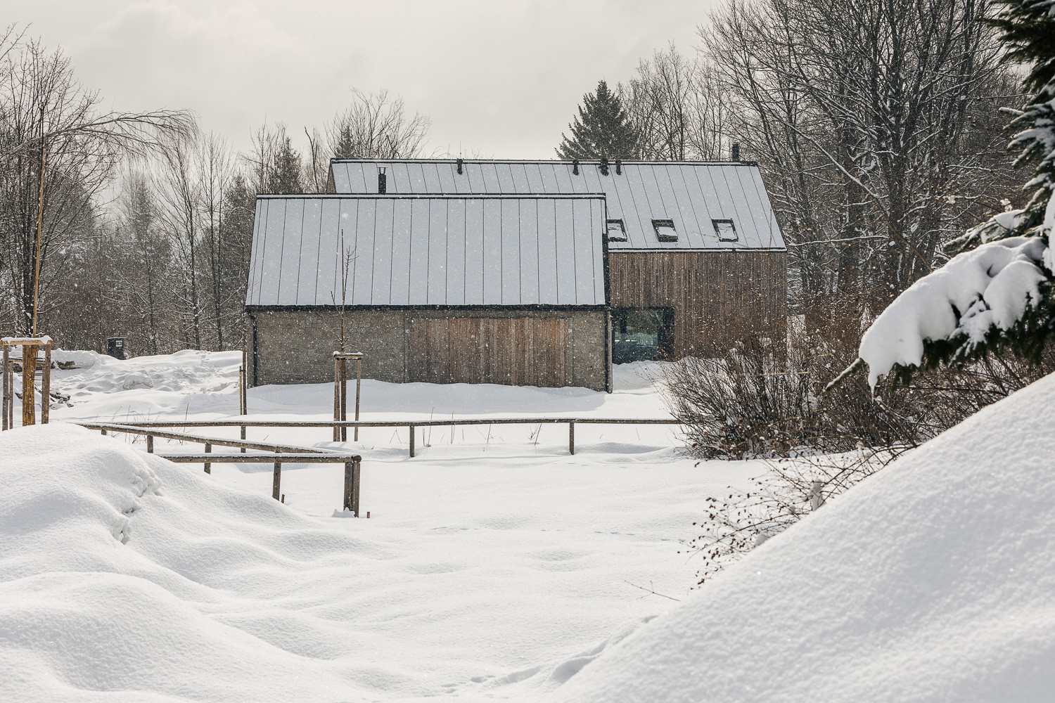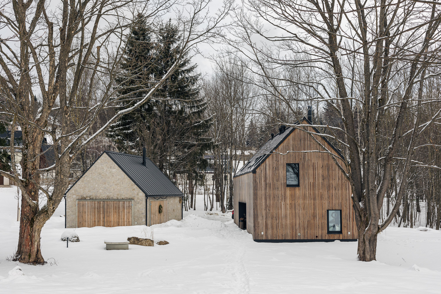 Pro stavbu obou objektů přitom autoři využili především tradiční přírodní materiály. Dvoupodlažní rodinný dům opláštili dřevěným laťováním. Protější stodola je zase postavená z lokálně těžených žulových kostek. „Stodola je zcela utilitární stavba s velkými vraty, které lze zcela otevřít a propojit tak vnitřní prostor s okolní přírodou,“ dodávají autoři realizace.