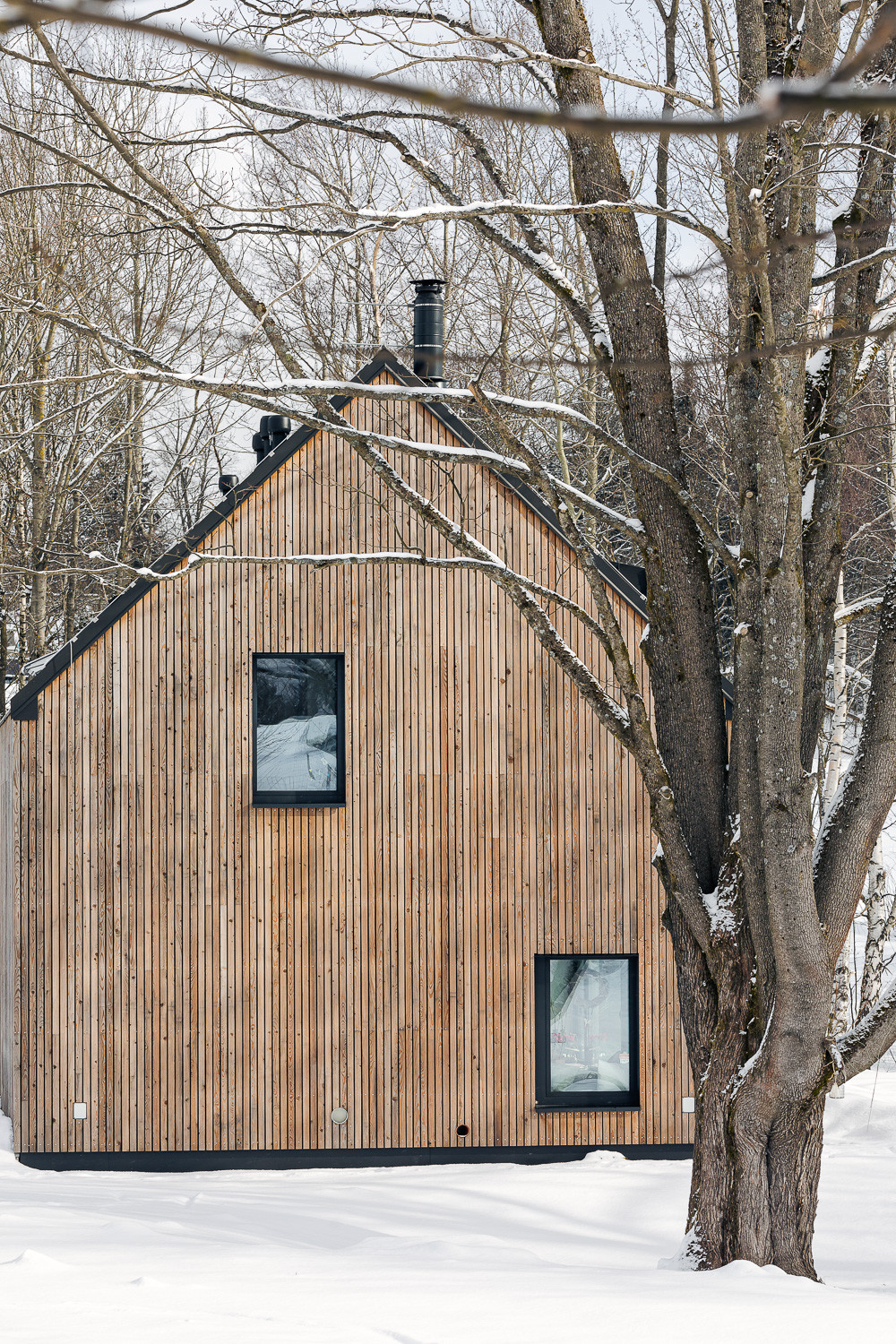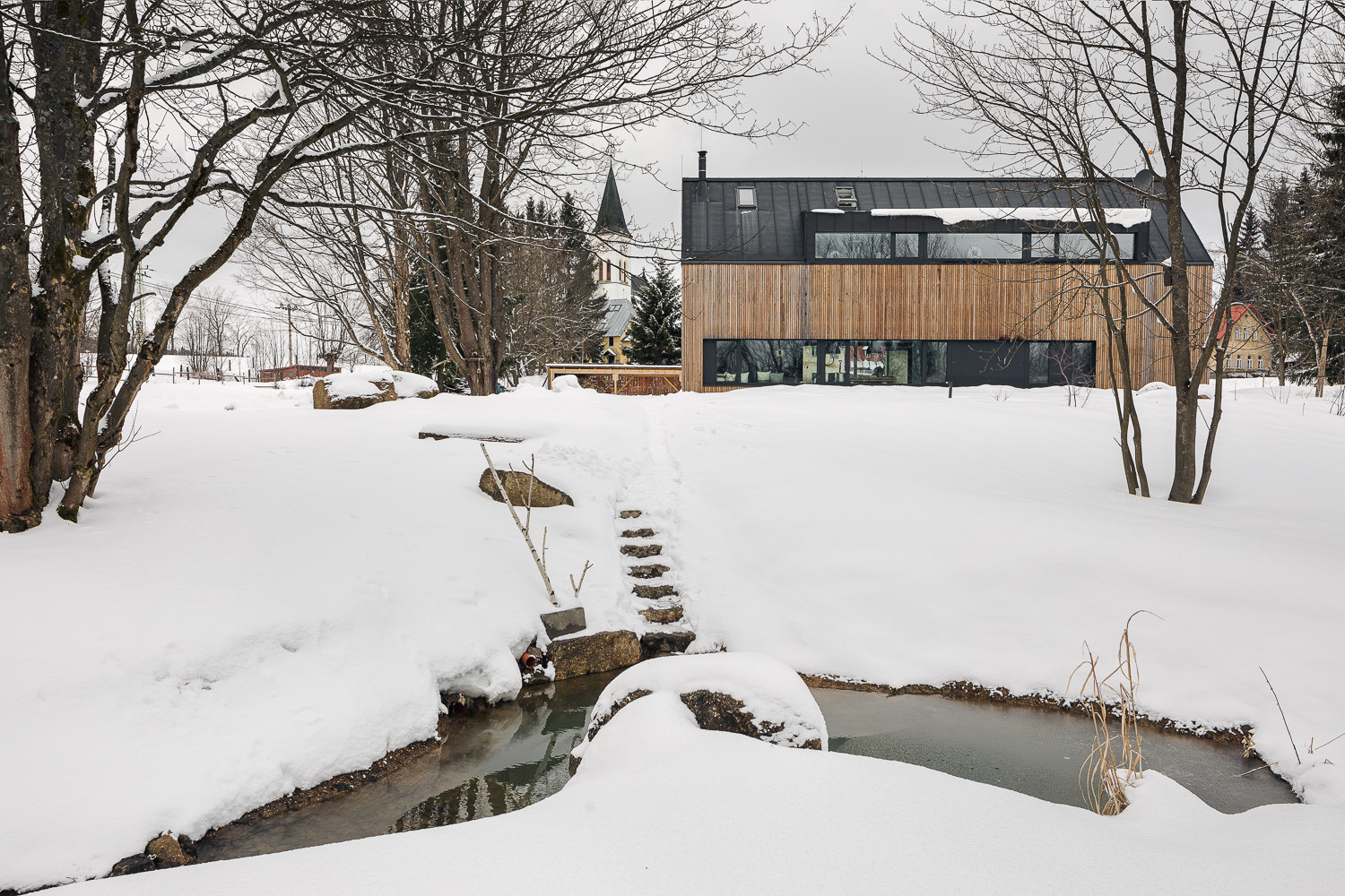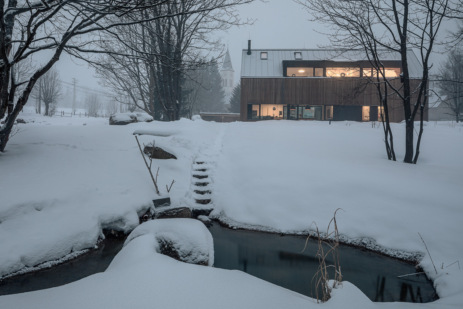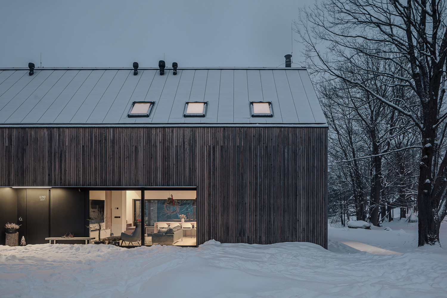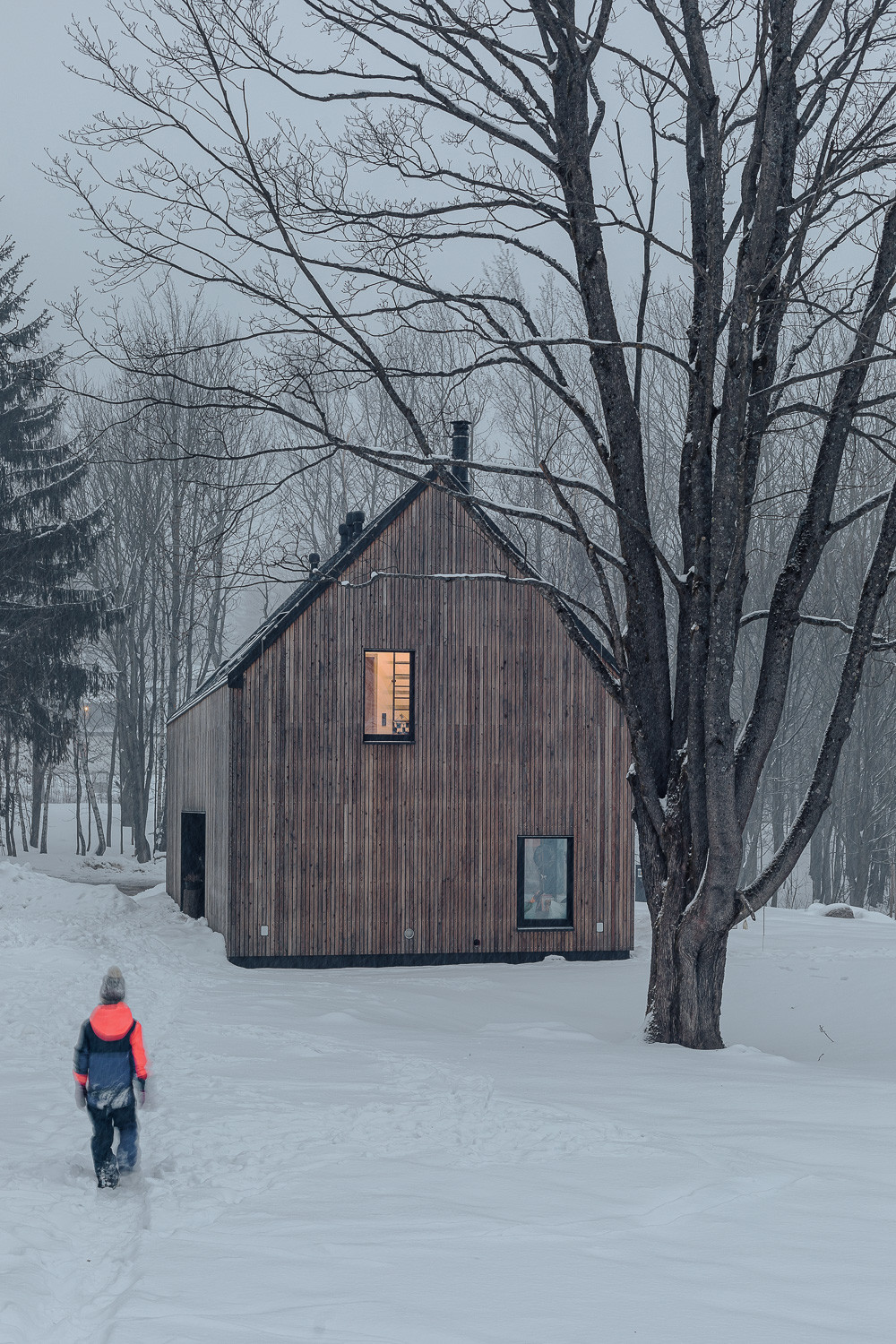 Pro stavbu obou objektů přitom autoři využili především tradiční přírodní materiály. Dvoupodlažní rodinný dům opláštili dřevěným laťováním. Protější stodola je zase postavená z lokálně těžených žulových kostek. „Stodola je zcela utilitární stavba s velkými vraty, které lze zcela otevřít a propojit tak vnitřní prostor s okolní přírodou,“ dodávají autoři realizace.