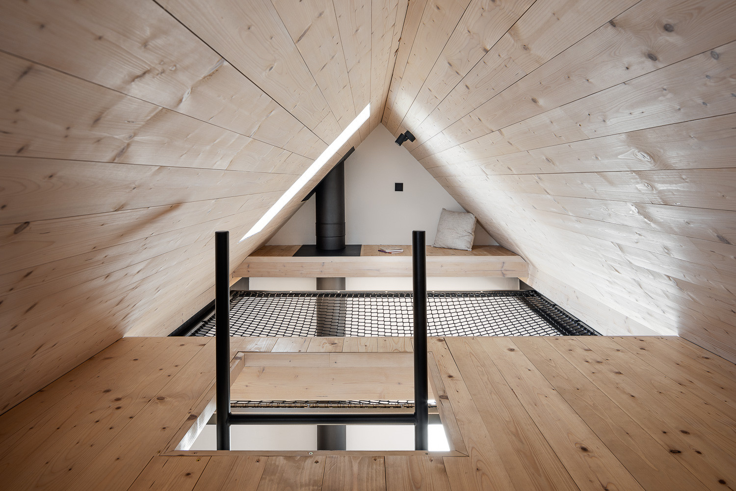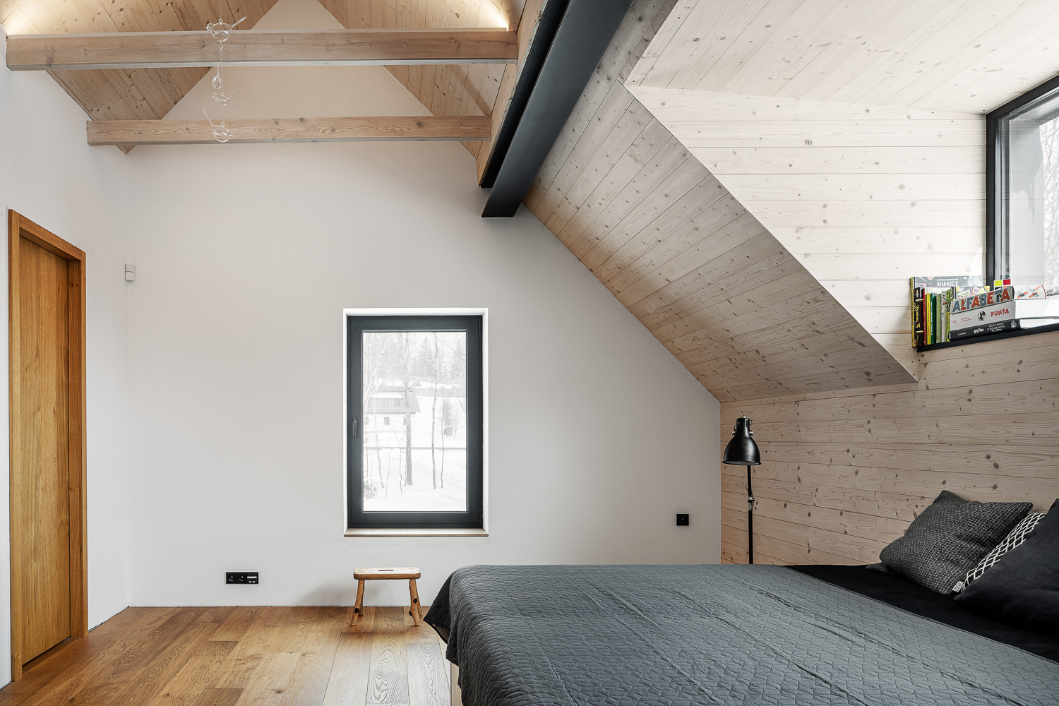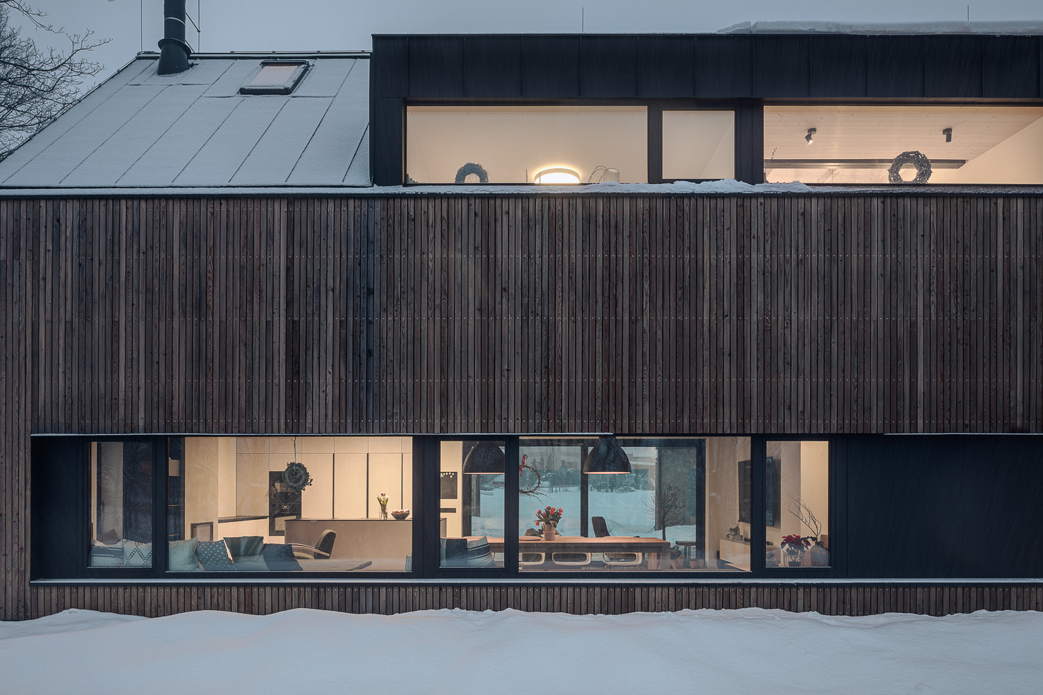 Právě jednoduchá až utilitární forma a archetypální tvarosloví prostupují celou realizací. Stavby se navenek tváří, jako by na místě stály od nepaměti. Až bližší pohled odhalí, že jde o moderní novostavby. Rodinný dům se po stranách se otevírá velkými posuvnými okny, skrze něž do interiéru proudí dostatek světla. Obývací pokoj tak navíc lze bezprostředně propojit s venkovní terasou. Obytné podkroví zase osvětluje široký vikýř.