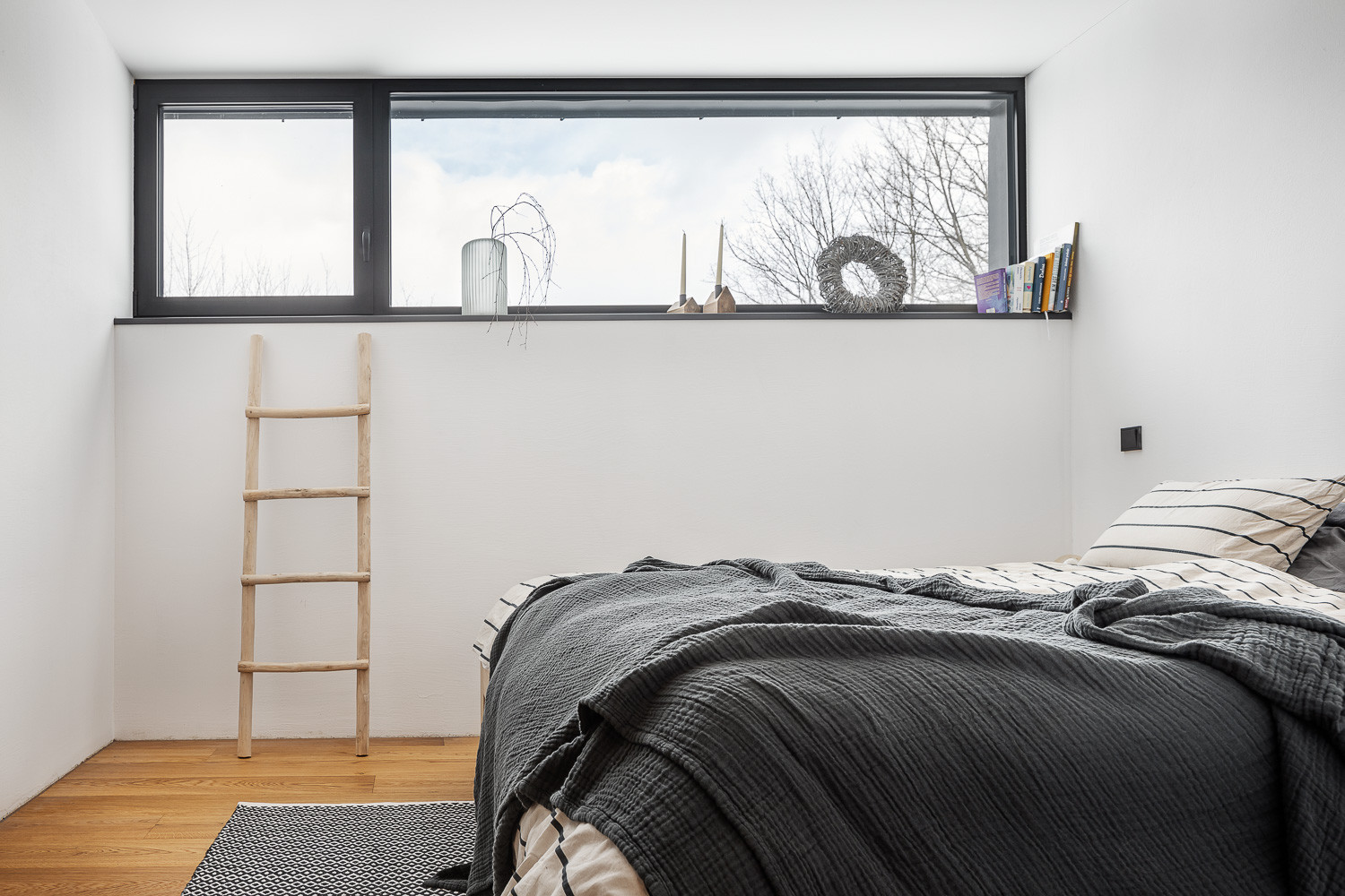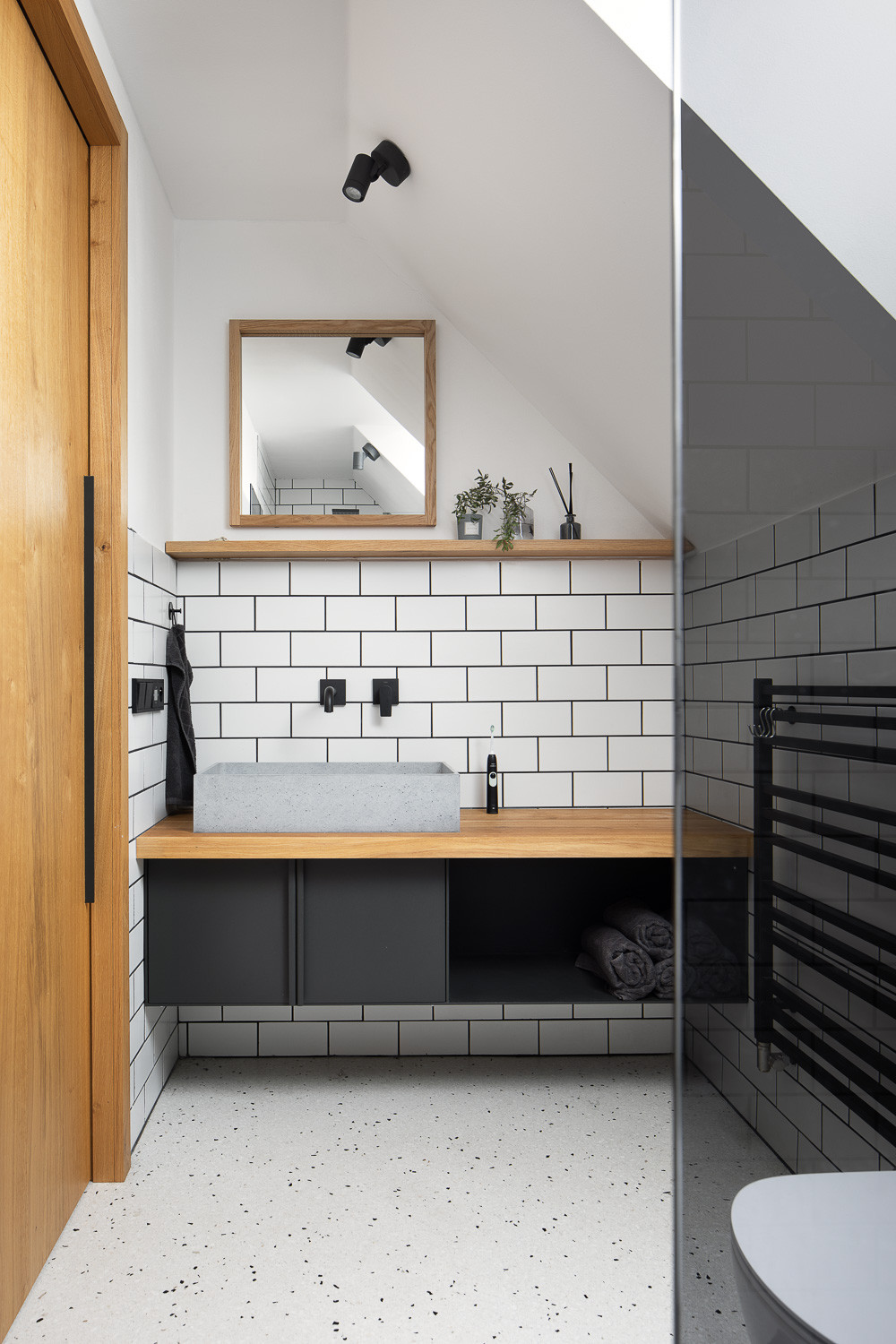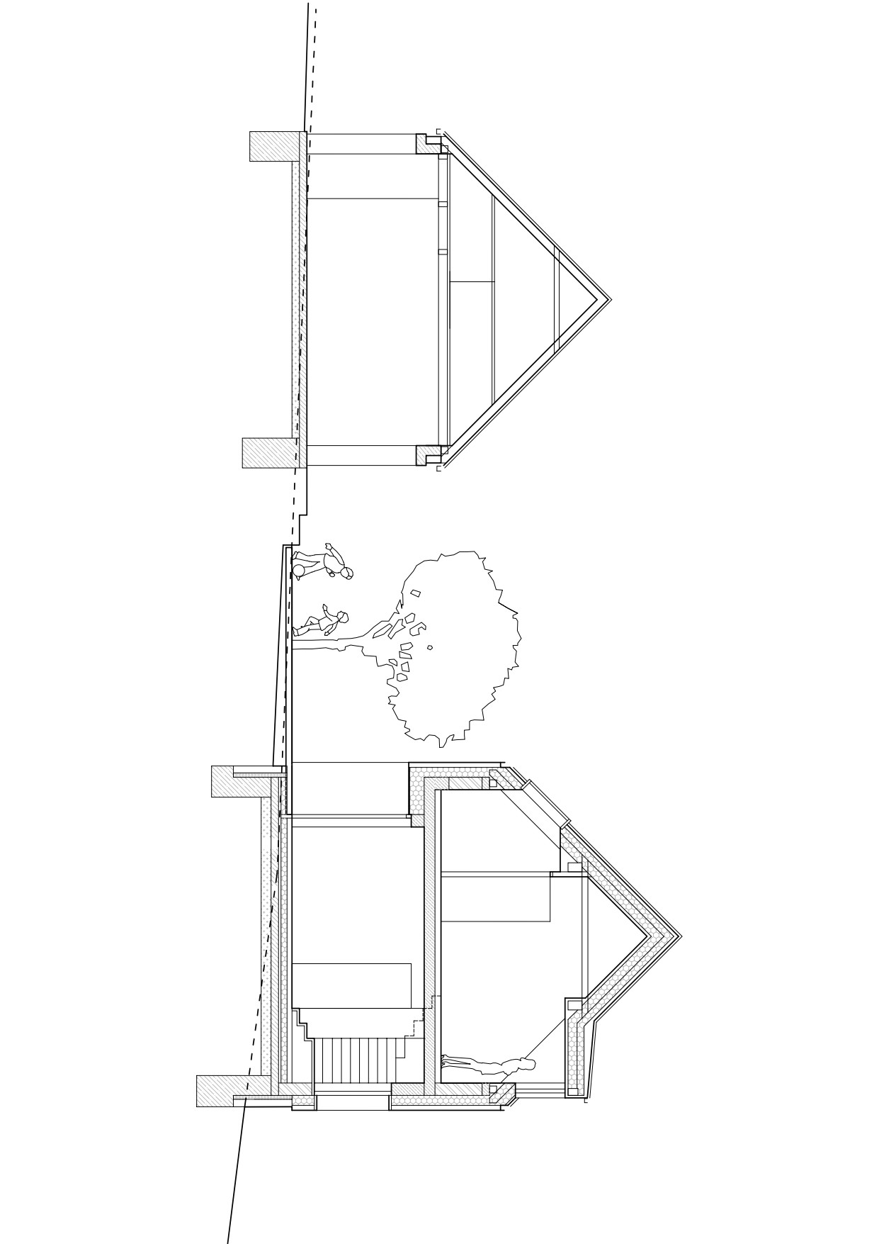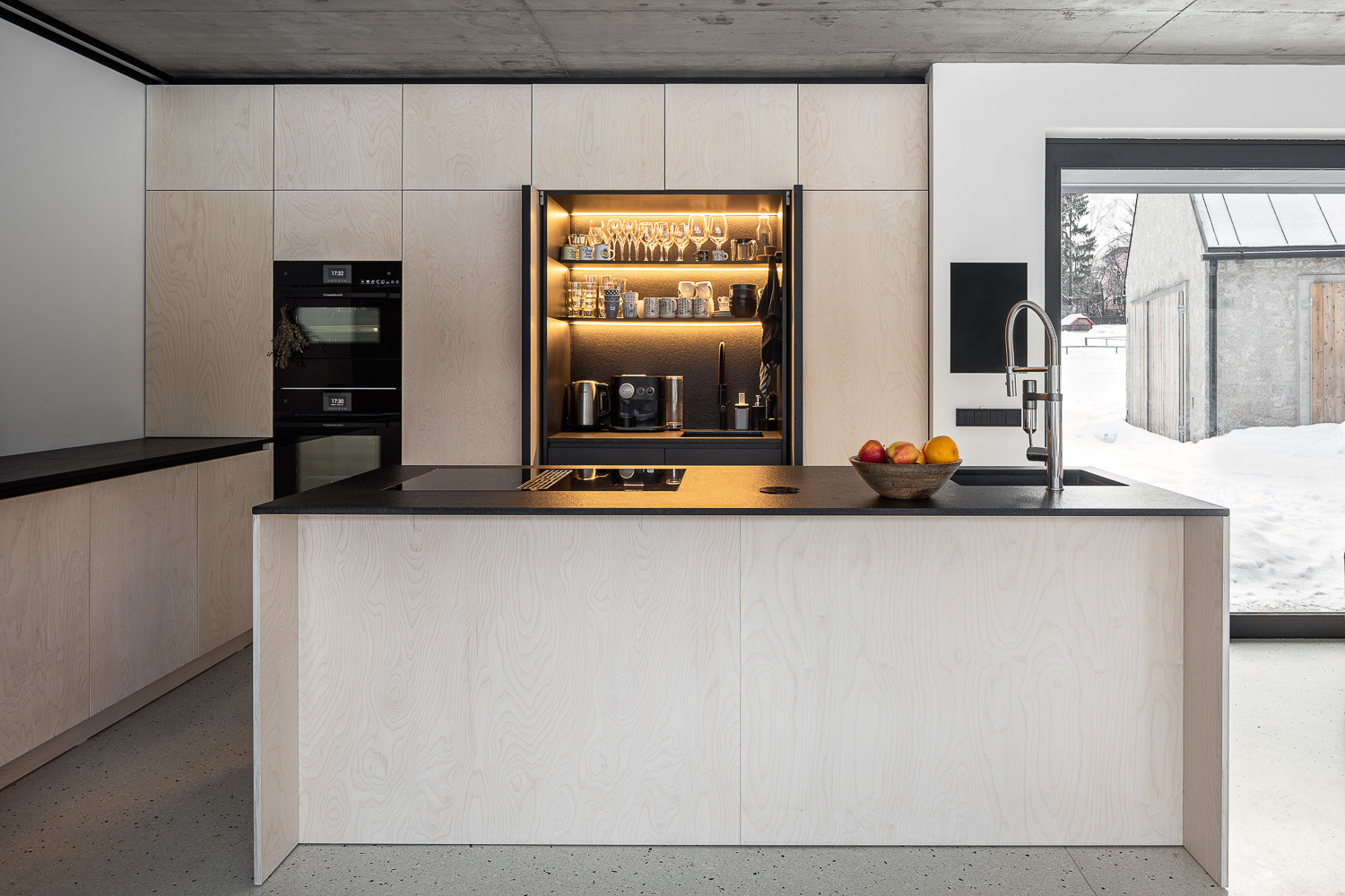Právě jednoduchá až utilitární forma a archetypální tvarosloví prostupují celou realizací. Stavby se navenek tváří, jako by na místě stály od nepaměti. Až bližší pohled odhalí, že jde o moderní novostavby. Rodinný dům se po stranách se otevírá velkými posuvnými okny, skrze něž do interiéru proudí dostatek světla. Obývací pokoj tak navíc lze bezprostředně propojit s venkovní terasou. Obytné podkroví zase osvětluje široký vikýř.