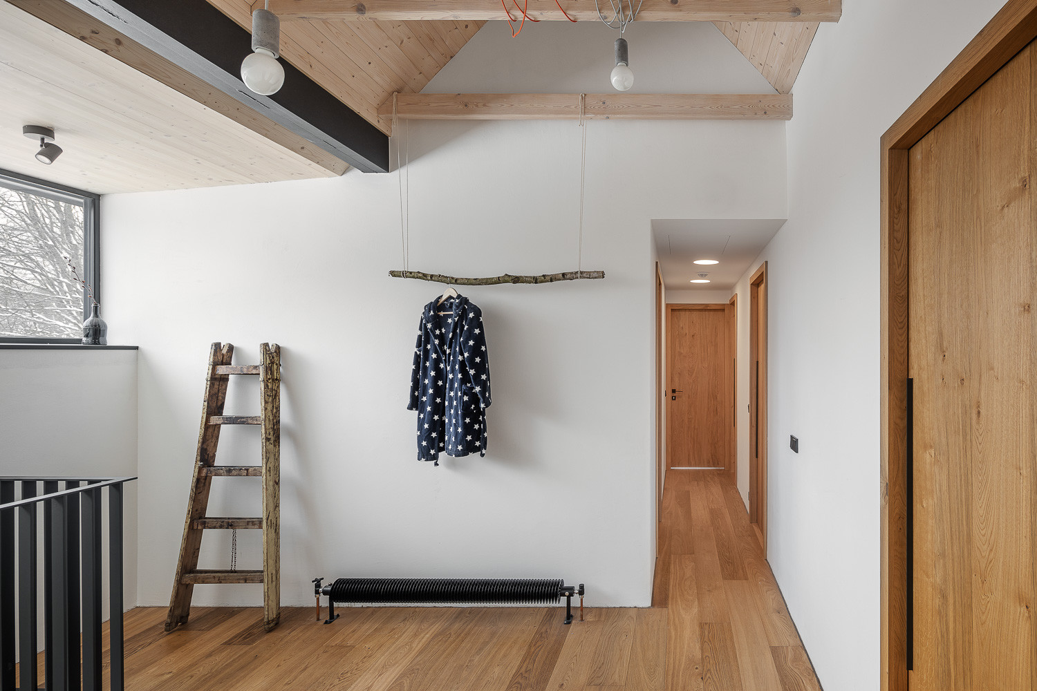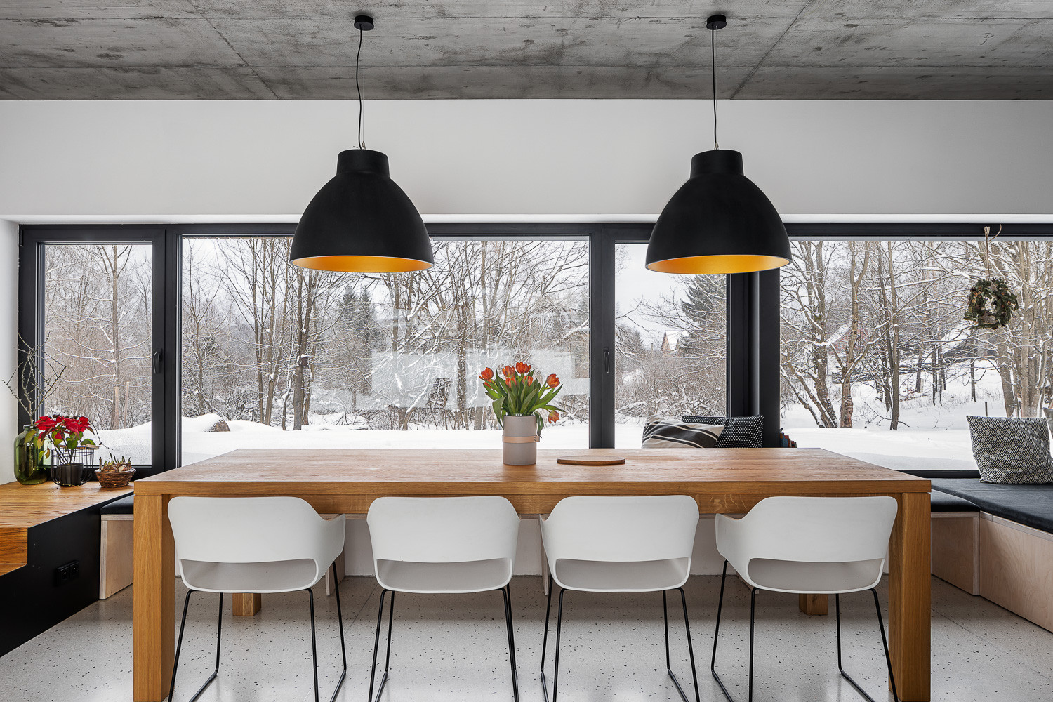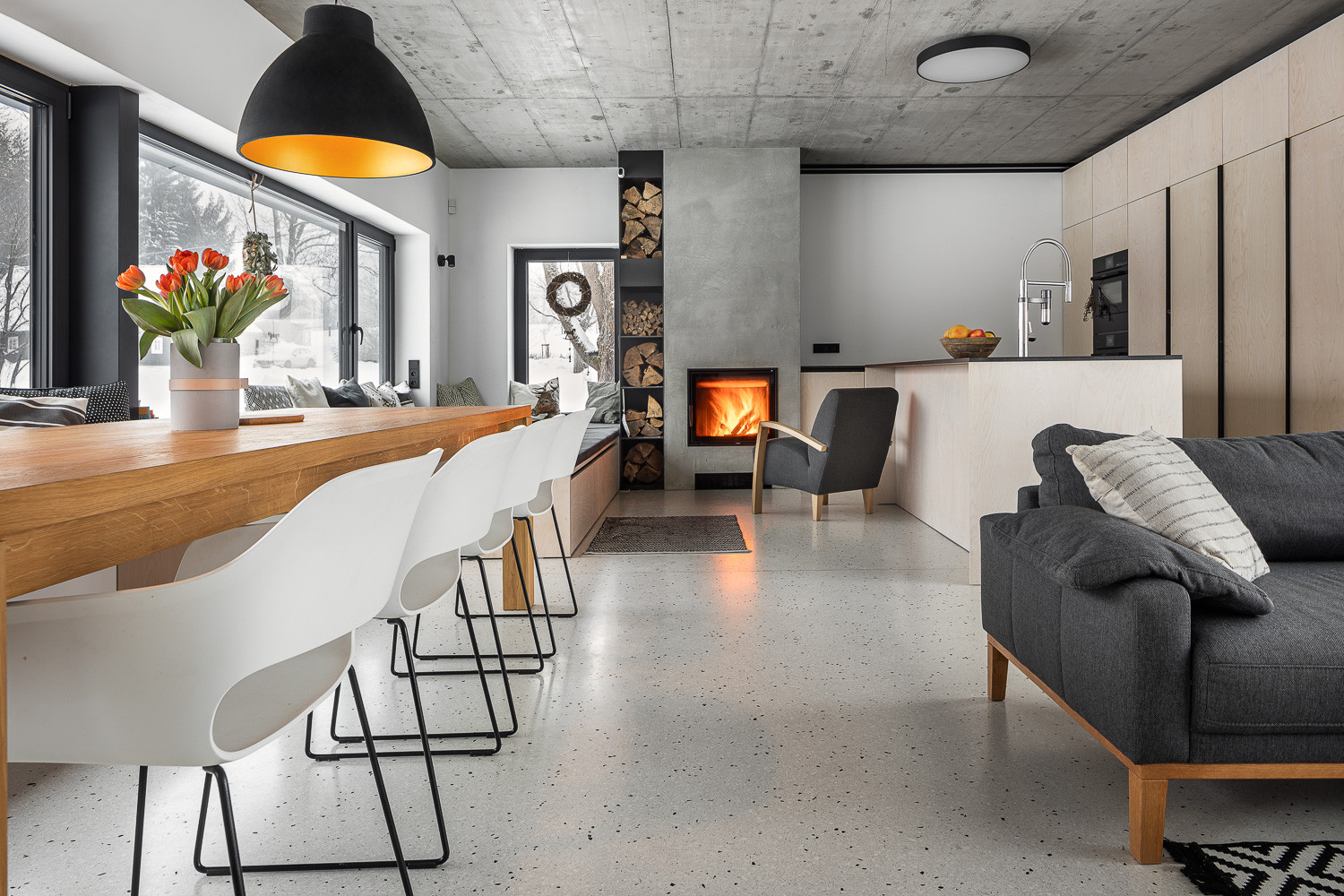Barvy a materiály z exteriéru se přirozeně přelévají i do interiéru domu. Hlavní roli zde hraje opět dřevo. Odhalený betonový strop pak do interiéru vnáší moderní prvek.