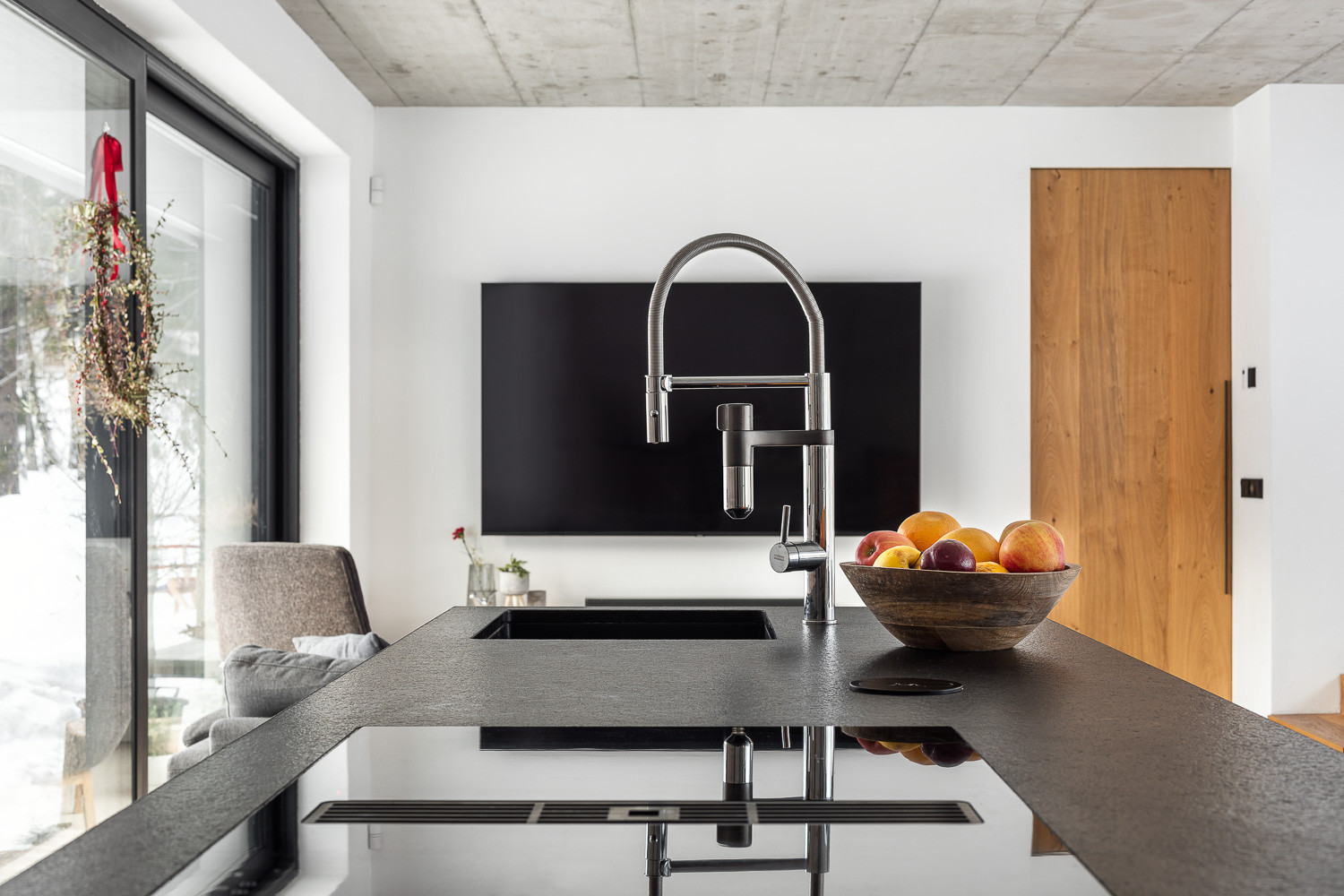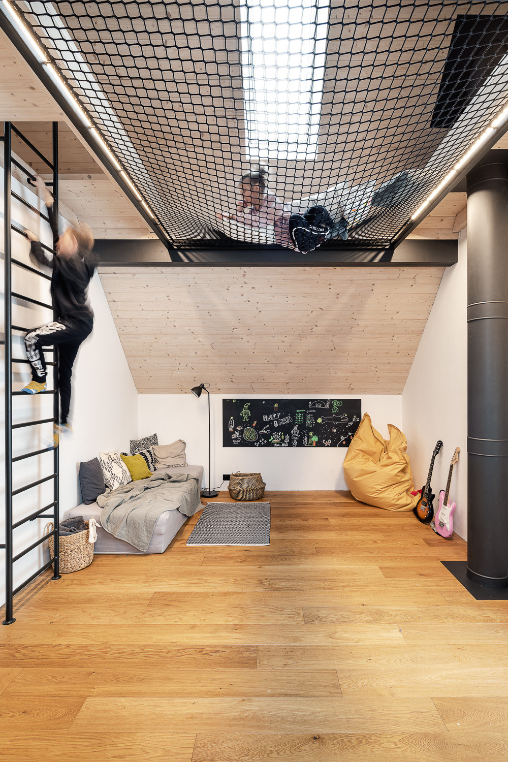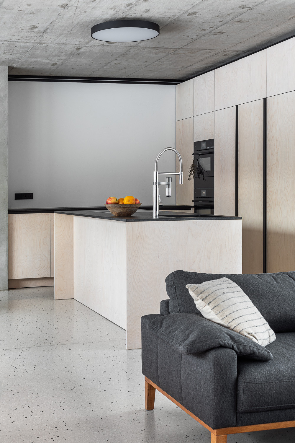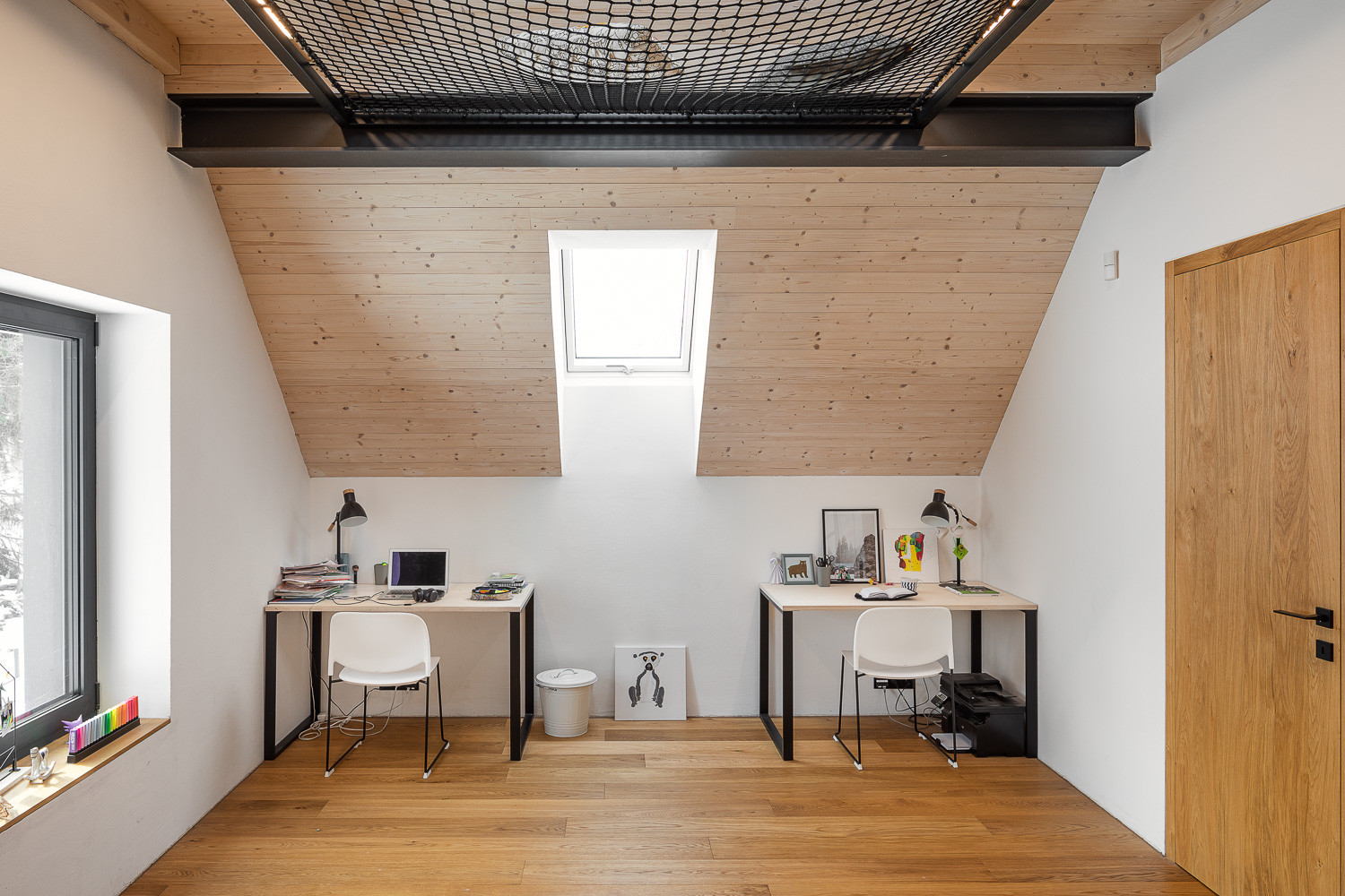 Barvy a materiály z exteriéru se přirozeně přelévají i do interiéru domu. Hlavní roli zde hraje opět dřevo. Odhalený betonový strop pak do interiéru vnáší moderní prvek.