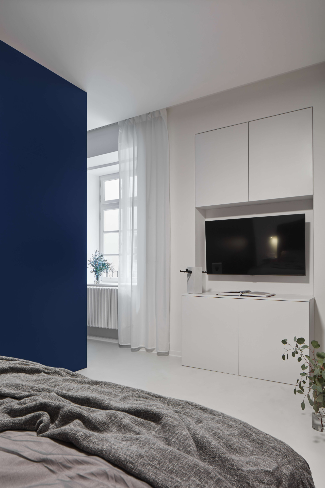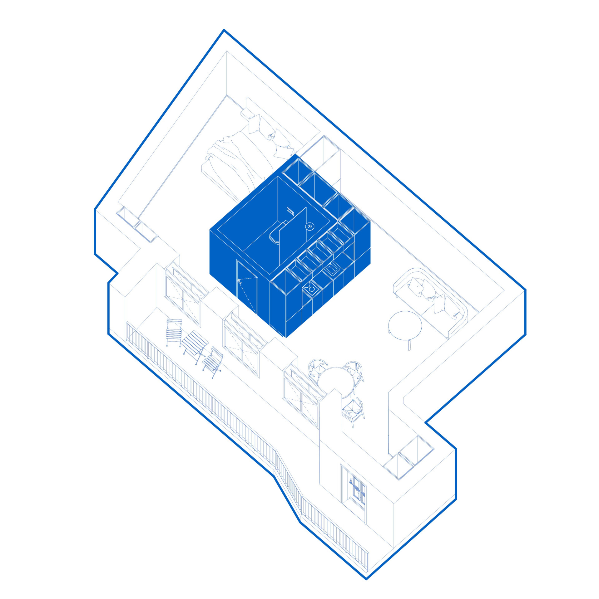 Původní členitou a uzavřenou dispozici nahradil jeden box. Celý byt nyní tvoří jeden pokoj o 54 m². Hlavním aktérem obytného prostoru je královsky modrá krychle, která je centrálním a dominantním prvkem. Ten rozděluje celý interiér na obytnou část bytu s obývacím pokojem od části soukromé, kde je umístěna ložnice.