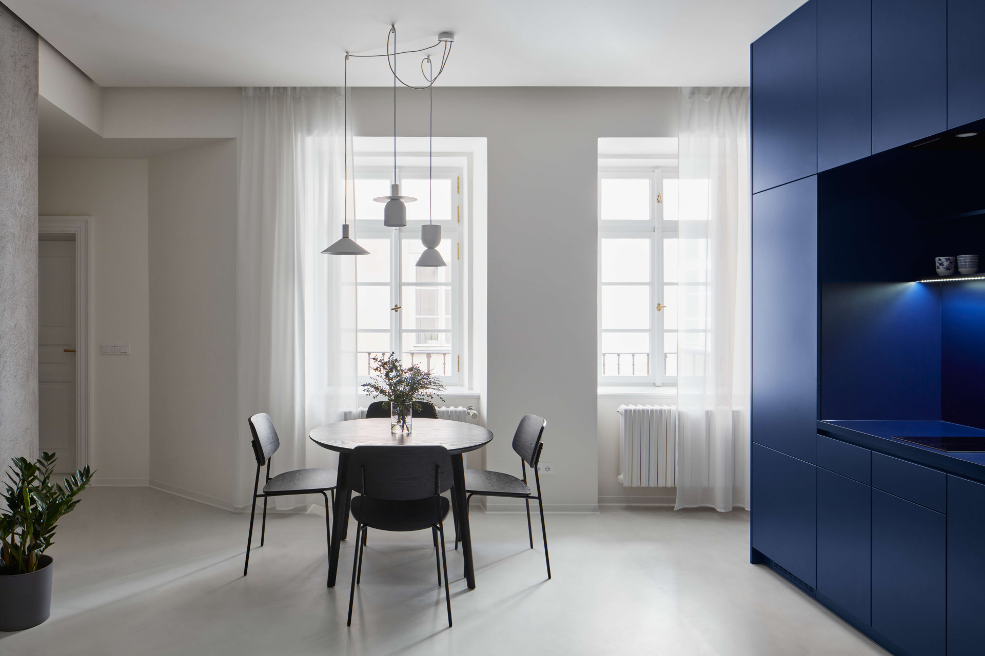 Modrý box není jen estetická záležitost. Je praktický. Technicky obsluhuje celý, jinak volný, prostor. Uvnitř najdete minimalistickou koupelnu, úklidovou část s pračkou a úložné prostory. Ale také kuchyňskou linku, která je orientována směrem do obývacího pokoje.