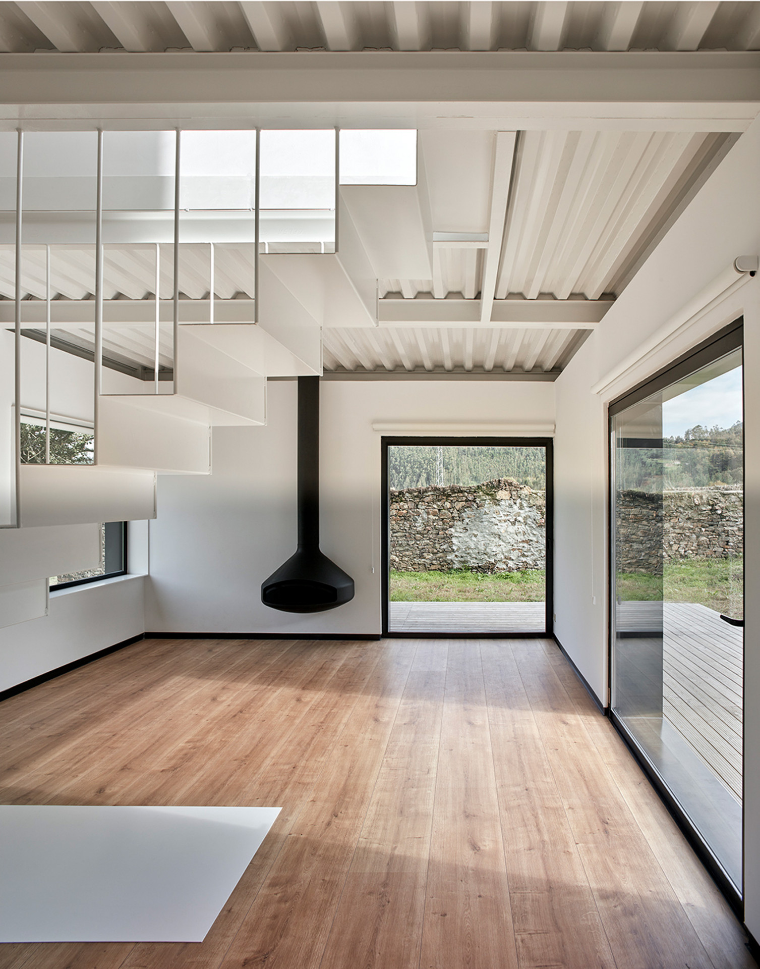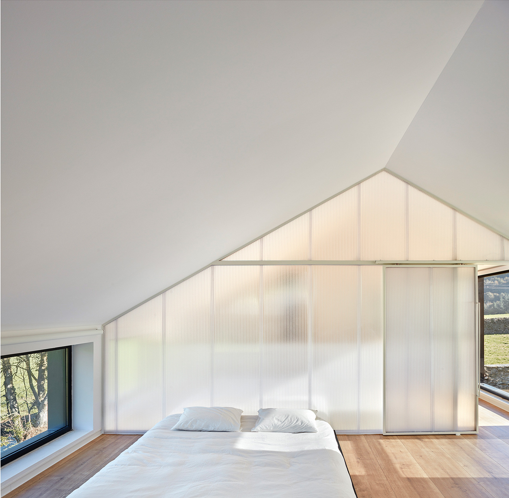 Přízemí je koncipováno jako jeden velký otevřený prostor obývacího pokoje a kuchyně, které rozděluje ocelové schodiště. V patře najdeme dvě ložnice oddělené průsvitnou polykarbonátovou stěnou, která zajišťuje dostatek soukromí, zároveň ale umožňuje šíření přirozeného světla do všech koutů.
