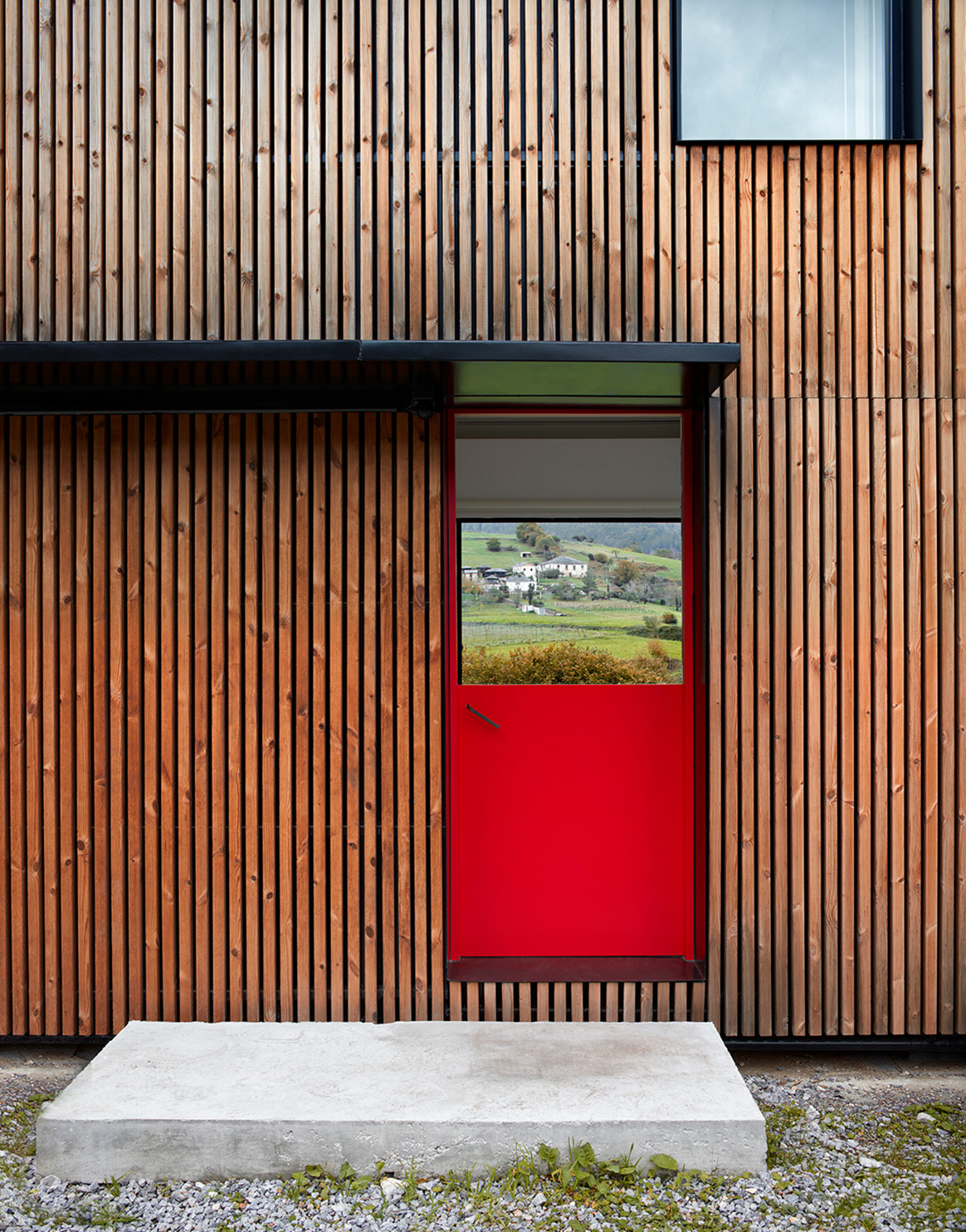 Přízemí domu tvoří čtyři kvádrovité moduly, na které navazují další čtyři ve tvaru trojbokého hranolu, které svým tvarem vytváří sedlovou střechu domu. Moduly jsou vyrobené z takzvané galvanické oceli a svařené na místě. Galvanizování je proces pokovování oceli, které výrazně zvyšuje odolnost tohoto materiálu. Plášť modulů pak tvoří vertikálně kladené dřevěné latě. Aby architekti přiblížili stavbu svému okolí, navrhli její střechu a část fasády pokrýt břidlicí, což zrealizoval místní řemeslník.