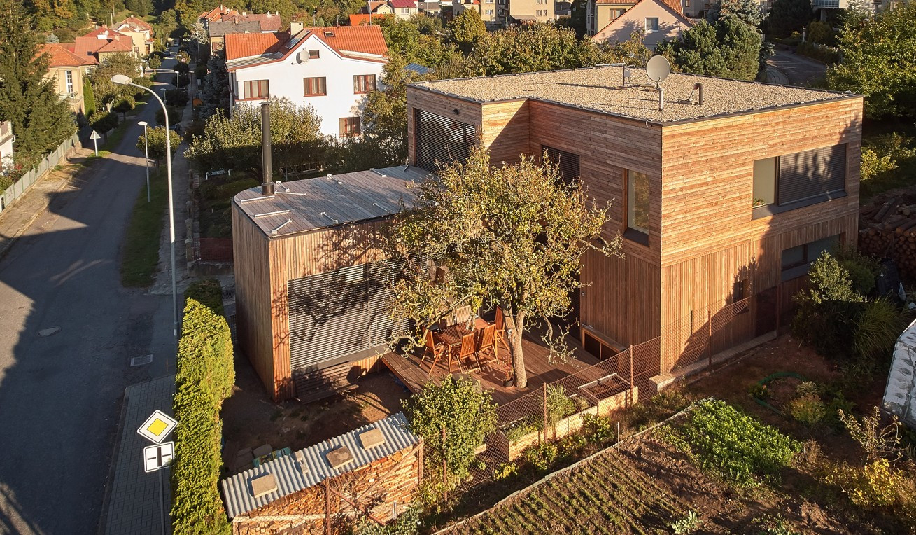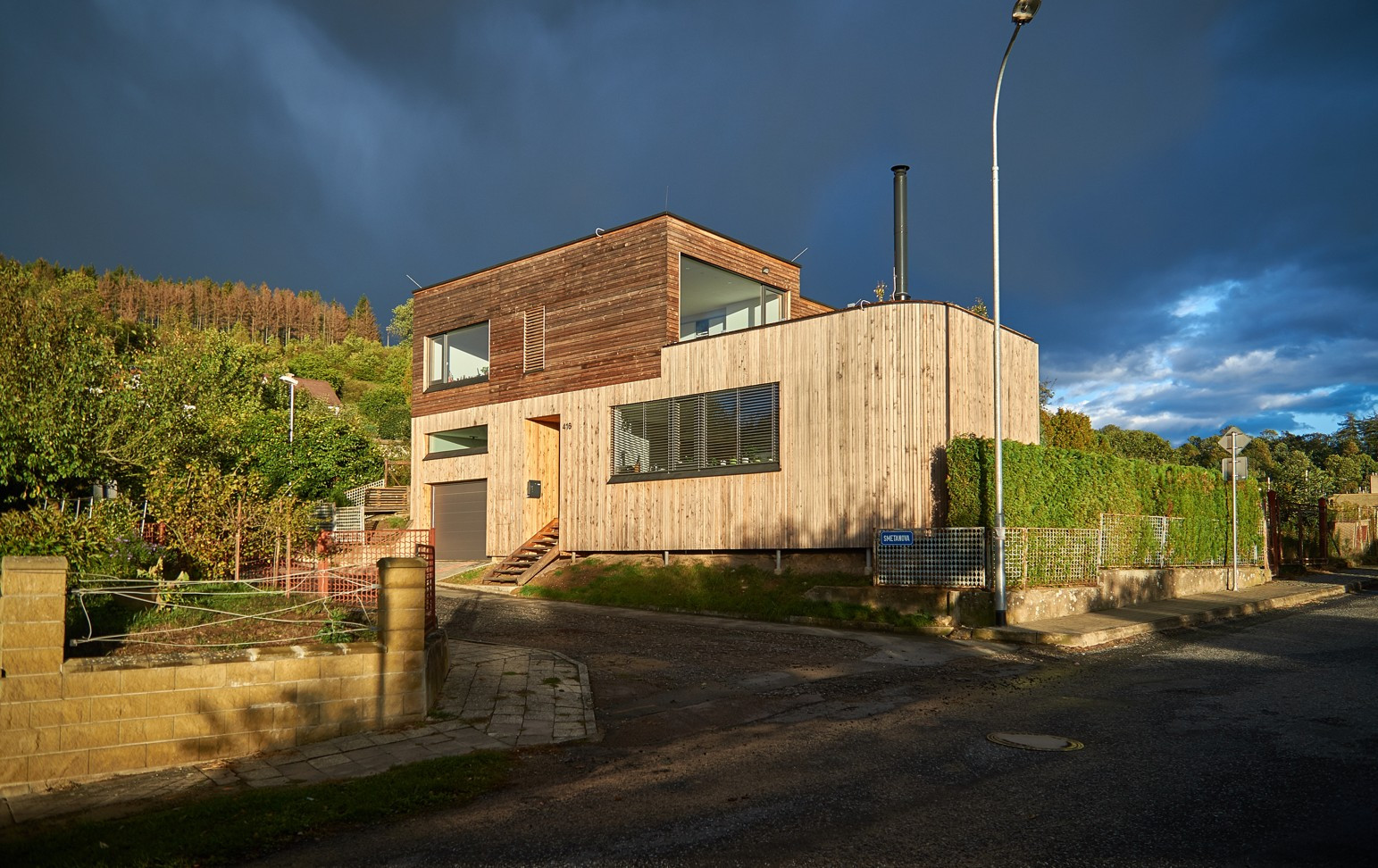 Na rohovou parcelu v Brandýsu nad Orlicí navrhlo studio molo architekti rodinný dům, který je v celé ploše fasád obalen do modřínových prken. Kontrastní barva i různé kladení obkladu odděluje přízemní hmotu od patra. Architekti dům navrhli jako kompozici jednoduchých kubických hmot, které se navršily kolem původní garáže a vytvořily tak bariéru pro soukromou terasu v jihozápadní části pozemku.
