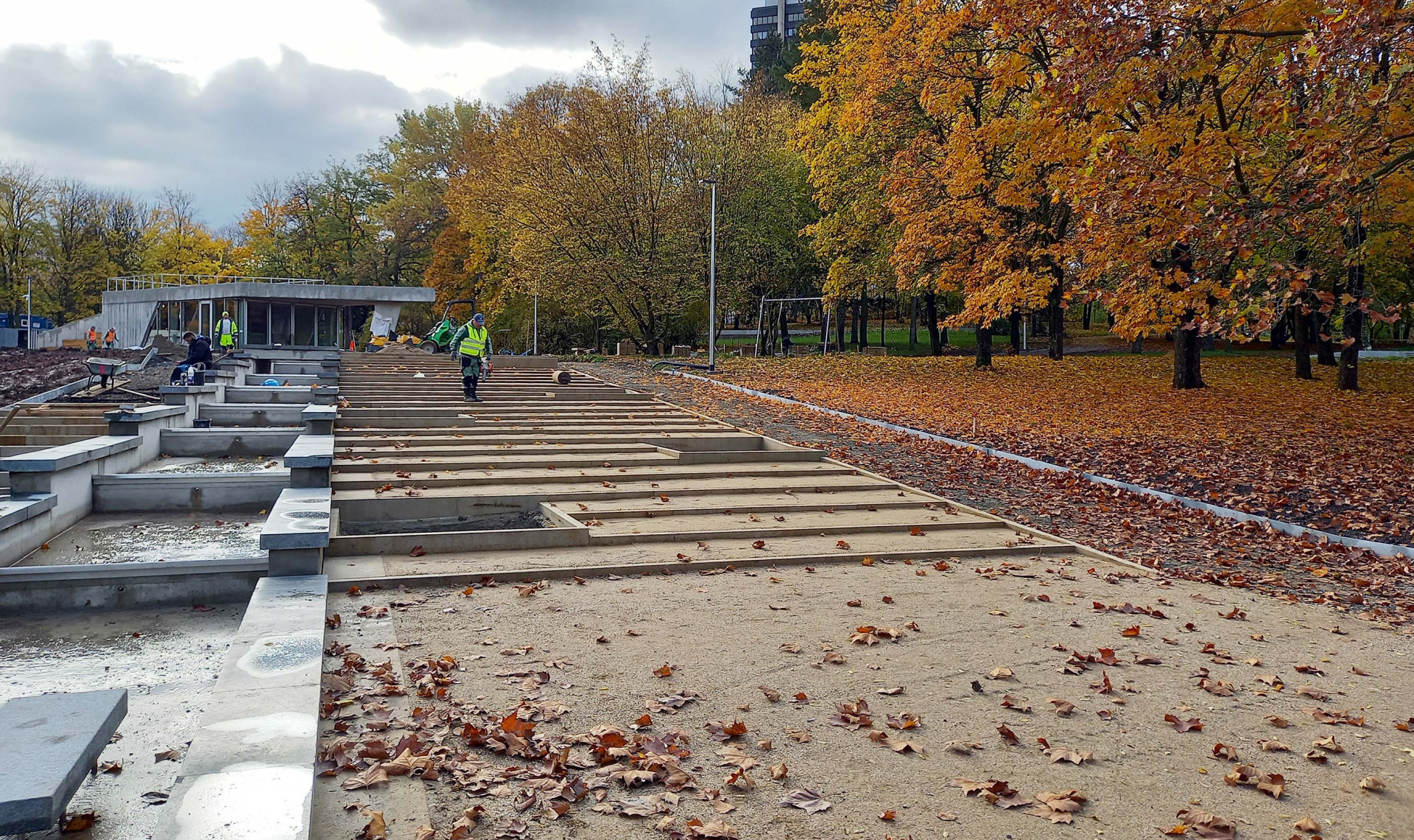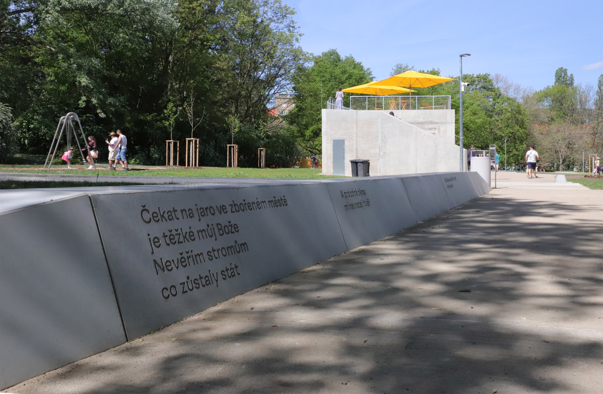 Z betonu jsou i tři nové objekty: kavárna s vyhlídkovou střechou, domek správce se zázemím pro sportoviště a pódium určené pro kulturní akce. Největší z nich, kavárna, se stala novým středobodem parku. Nabízí rozhled na jeho plochu i na obnovenou vodní nádrž s kaskádou a fontánou – část původního vodního díla, kterou pamětníci považují za nejkrásnější. „Ze tří oceněných soutěžních návrhů se ten náš nacházel přesně mezi dvěma extrémy. Konzervativní návrh zachovával celý původní vodní prvek, radikální naopak zcela přepisoval podobu parku. My jsme se rozhodli ponechat jen tu nejhodnotnější část – osu s bazénem směřující na Hněvín – a odstraněné části fontány nahradit stavbami kavárny a pódia,“ dodává architekt Tomáš Černý z Rehwald Landscape Architect.