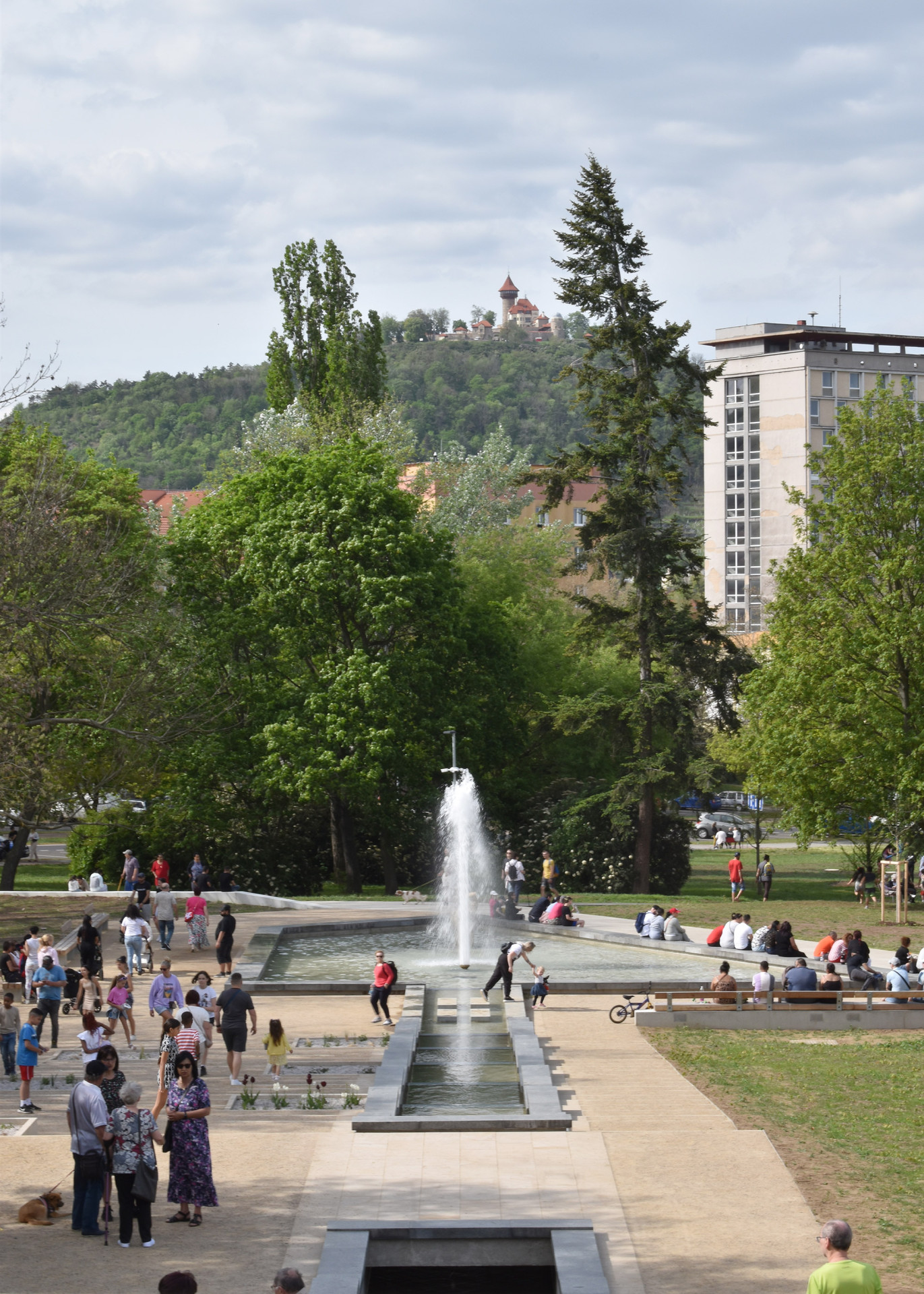 Nejen do kavárny, ale i na hřiště a sportoviště to dnes táhne velké množství lidí – v tomto ohledu je park po rekonstrukci k nepoznání. Přesto se tu z původního prostředí zachovalo mnoho. Třeba umělecká díla nebo vzrostlá zeleň, která jen potřebovala usměrnit. Nově se ale lépe hospodaří s dešťovou vodou: park ji dokáže zasakovat a vodotrysk už není napojený na městský vodovod, ale na podzemní vrt.