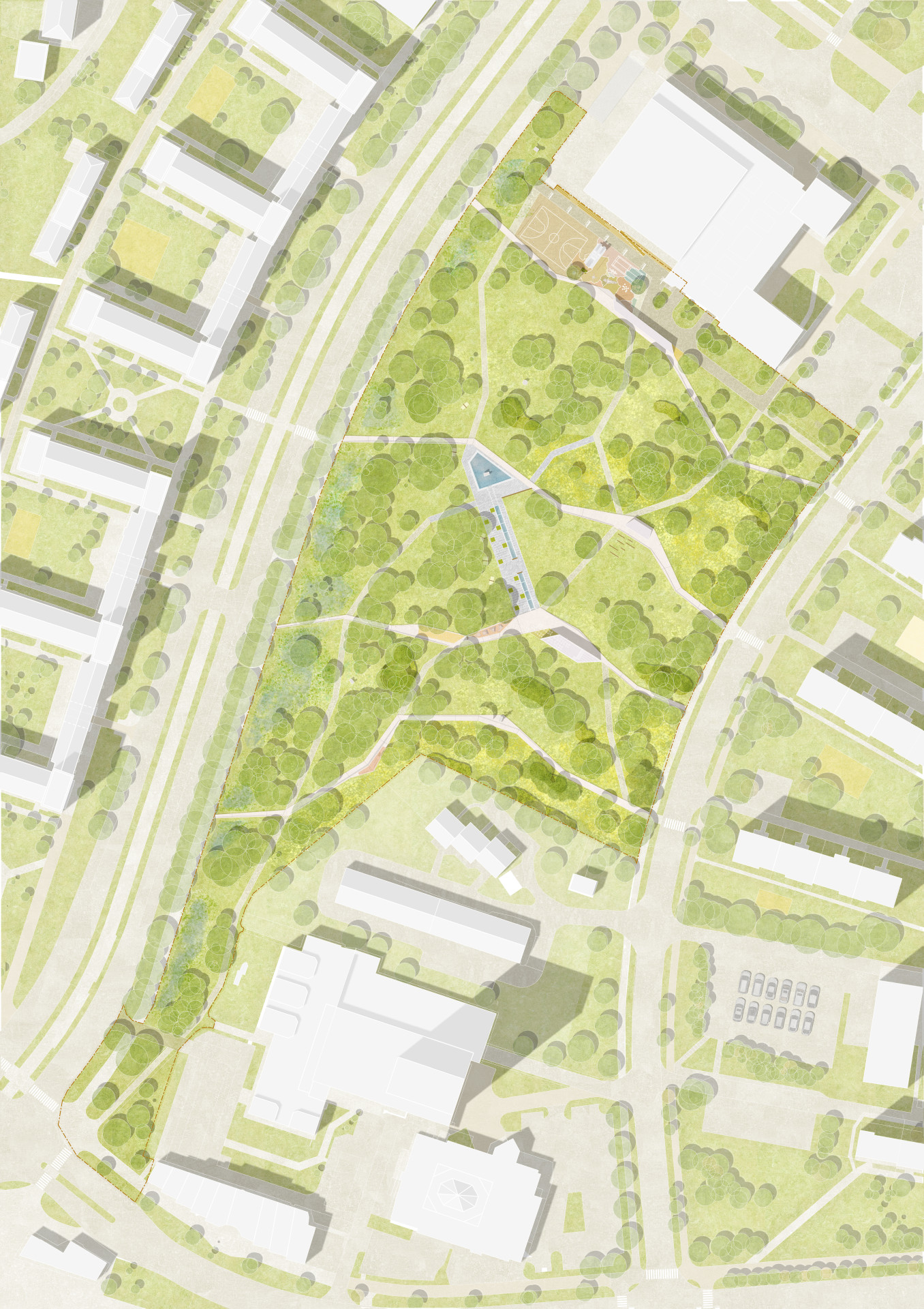 Původní koncept parku stál na jediném centru – vodních prvcích uprostřed. Jinak v něm nebylo moc co dělat. Nové řešení naopak staví na decentralizaci. Herní a sportovní prvky jsou rovnoměrně rozmístěné a navázané na nové betonové terasy, které procházejí svažitým terénem. V některých místech slouží jen jako pěšiny, jinde se rozšiřují v platformy vhodné k posezení nebo pořádání menších akcí. Povrch mají kartáčovaný, aby neklouzal.