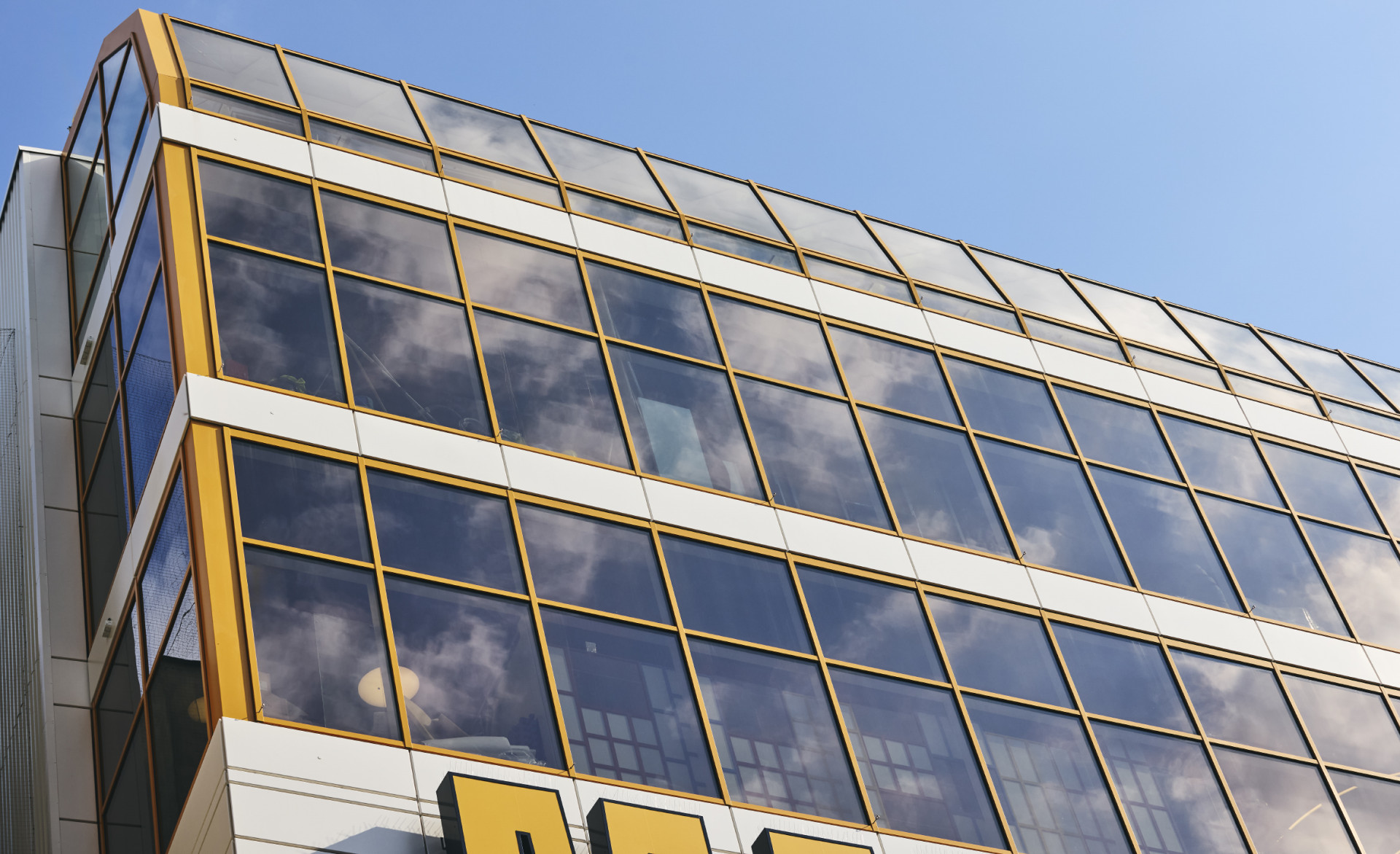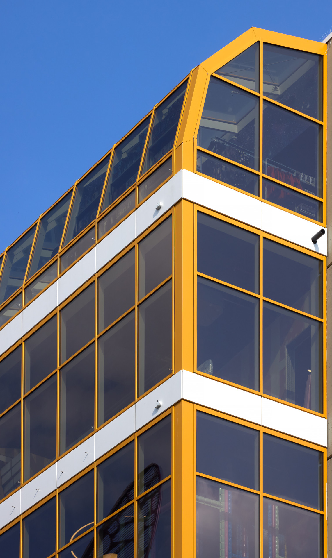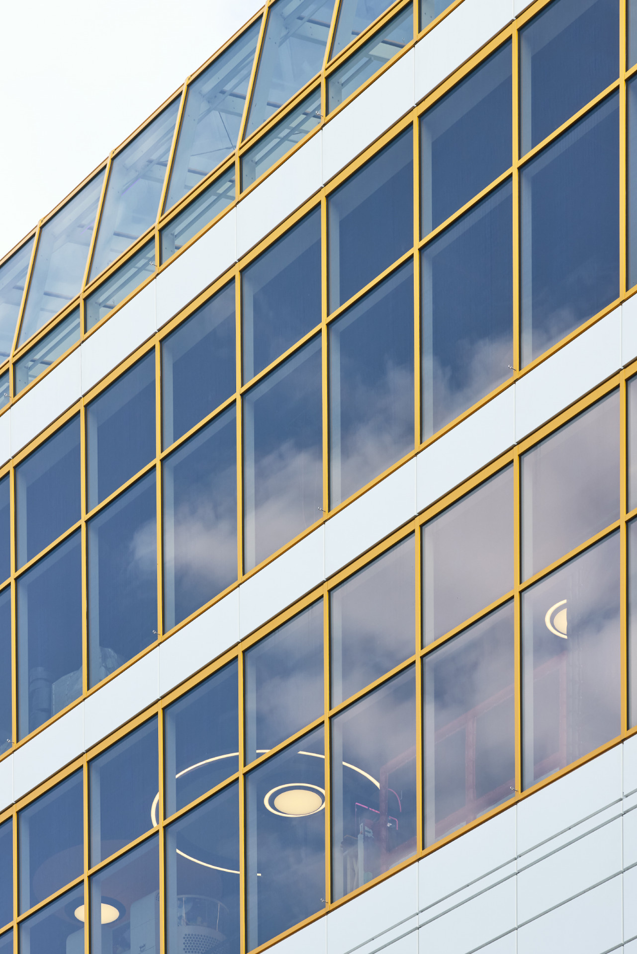 - Řešení fasádního pláště:: Sloupko-příčková fasáda systému SCHÜCO FWS 60, do kterého jsou vkládána okna a dveře sytému SCHÜCO. Výplně jsou izolační dvojskla