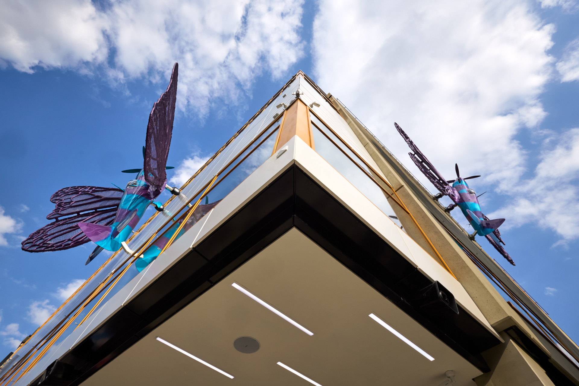 Bylo také potřeba vypořádat se se změnami projektu, které přišly až během realizace. „Na prvním podlaží, na rohu budovy, kde je nyní recepce, byla do fasády zakomponována motoricky posuvná stěna se skly bez rámů, které měly na výšku dosahovat téměř čtyř metrů, což je v podstatě na technickém limitu.“ Ingrid Pernická pak doplňuje: „V rámci instalace známých motýlů jsme například museli upravovat fasádu. Do plechové fasády musela být doplněna ocelová konstrukce s nosností několika tun.“