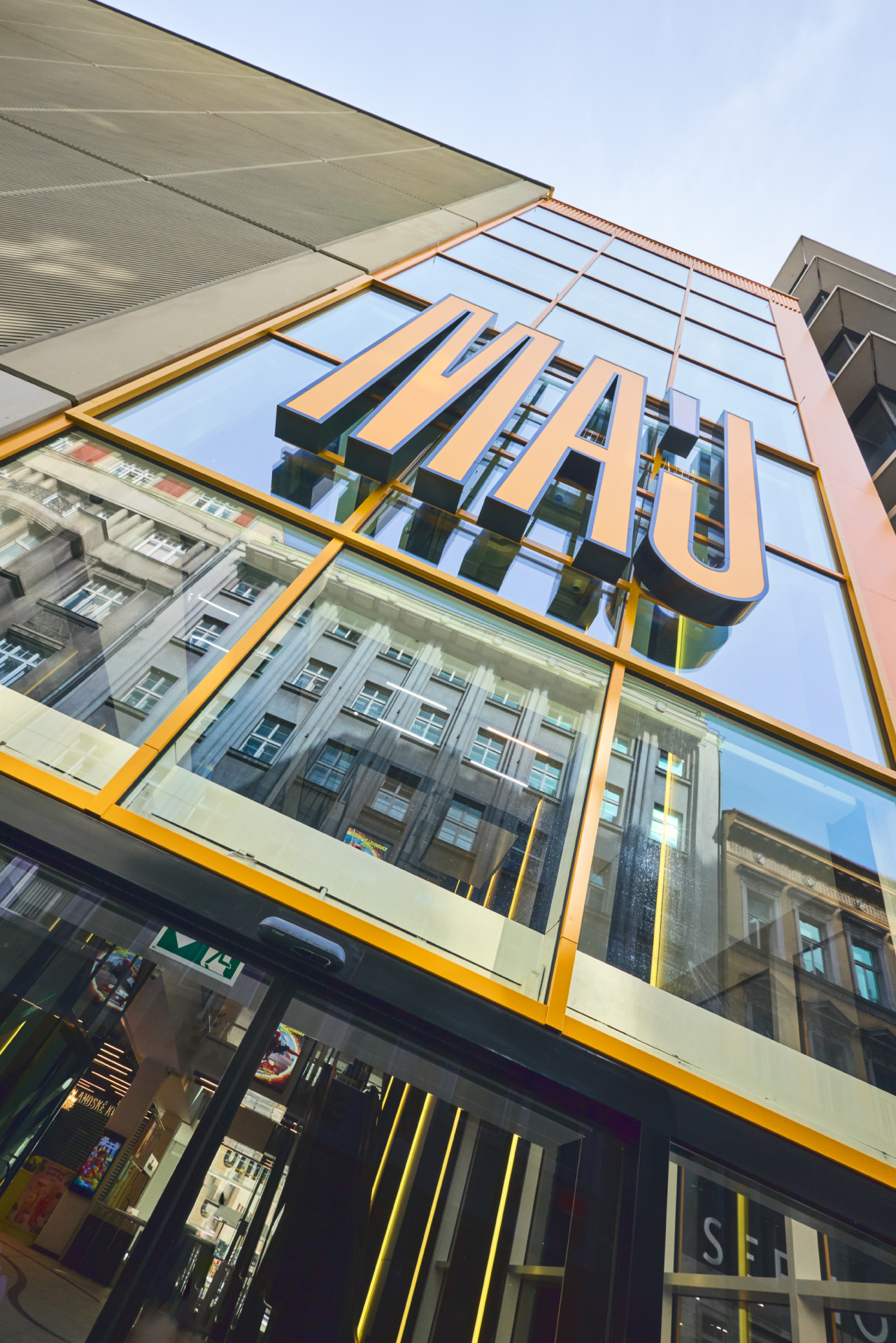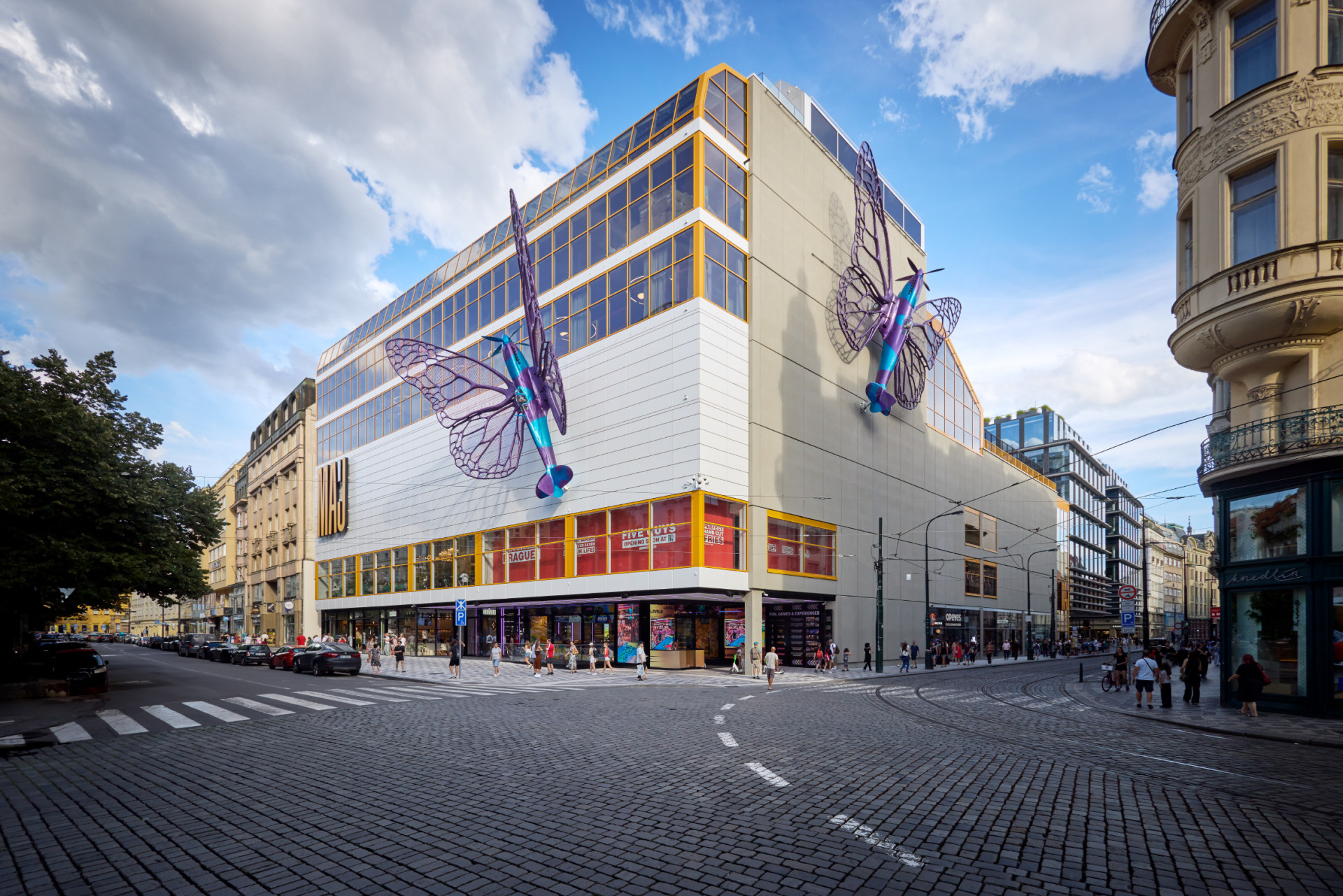 Motýli na fasádě a uvnitř herny. Takhle teď veřejnost vnímá obchodní dům Máj. Ale rekonstrukcí prošla také fasáda, která se vrátila do podoby ze 70. let - včetně odstínu skla a té správné žluté.
