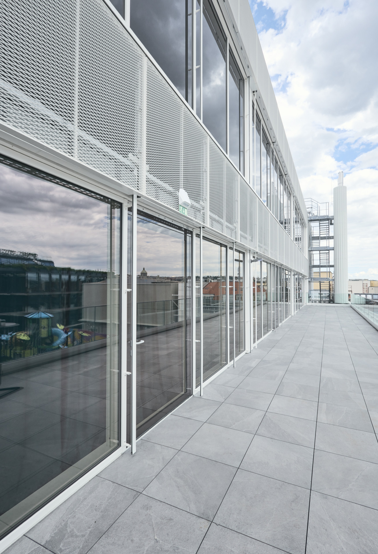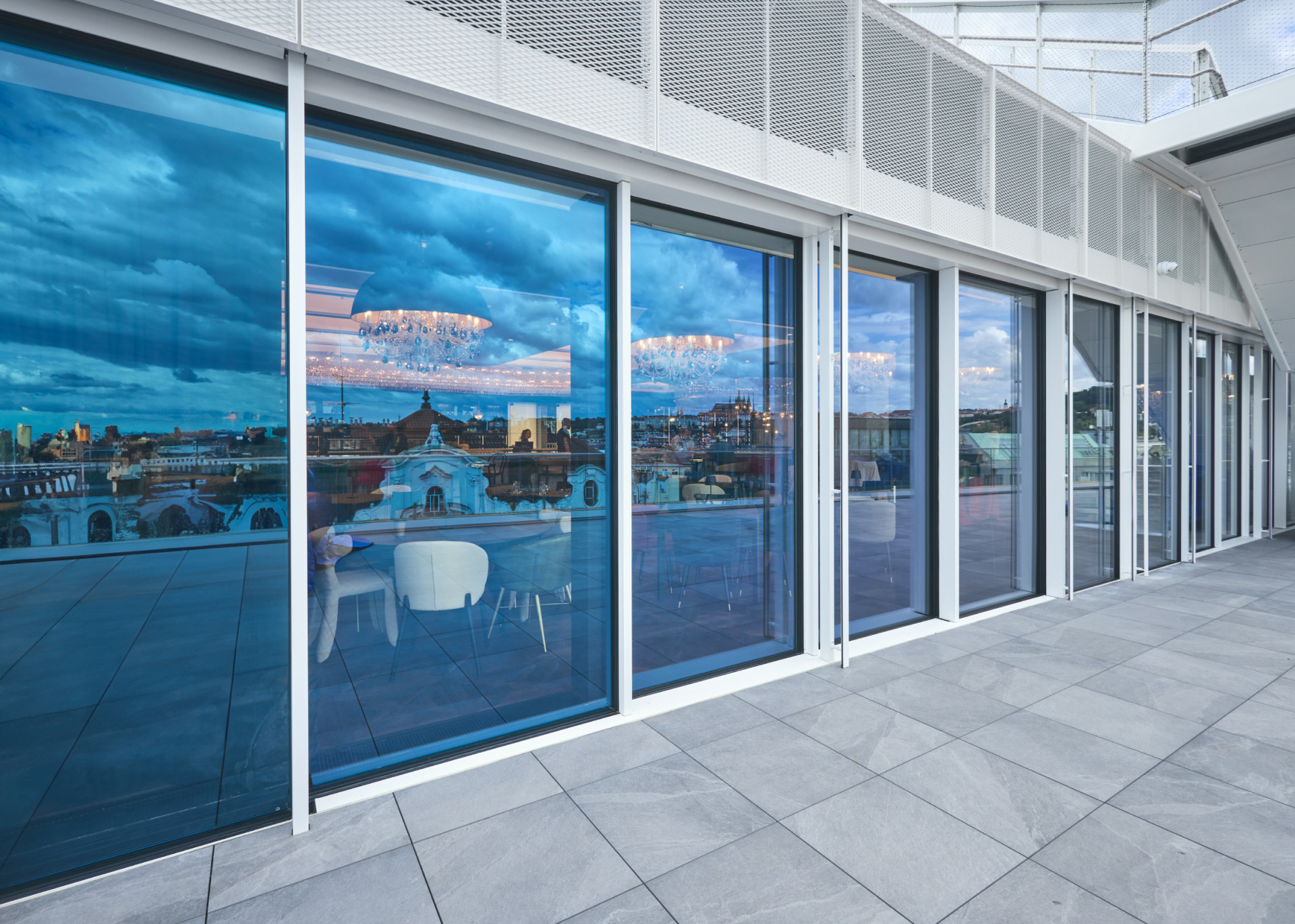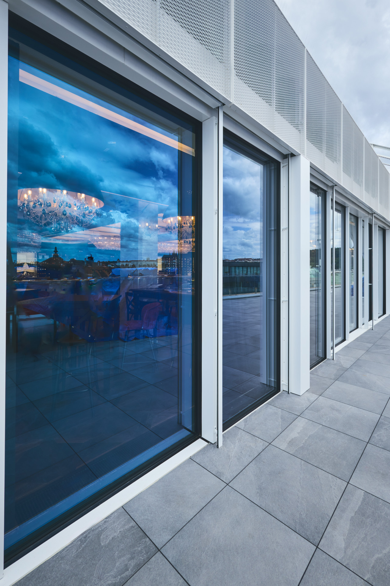Pro někoho teď budova Máje možná vypadá podobně nebo stejně jako původní realizace ze sedmdesátých let, avšak nyní jsou hliníkové fasády doplněny o řadu moderních prvků, které zvyšují možnosti využívaných prostor a dodávají budově uživatelský luxus. „Například elektricky ovládané otvíravé posuvně zdvižné čtyřkřídlé sestavy. Jejich otevřením vzniká průchod na terasy, široký na jednom posuvu přes šest metrů. Nebo automatické dveře skrytě vložené do sloupkovo-příčkových fasád, či tzv. „neviditelná“ skla pro omezení reflexe a průhledu z exteriéru do interiéru. A co je dnes už samozřejmostí - motorické stínění členěné přesně podle požadavku prostor.“ vysvětluje Martin Dimmer.