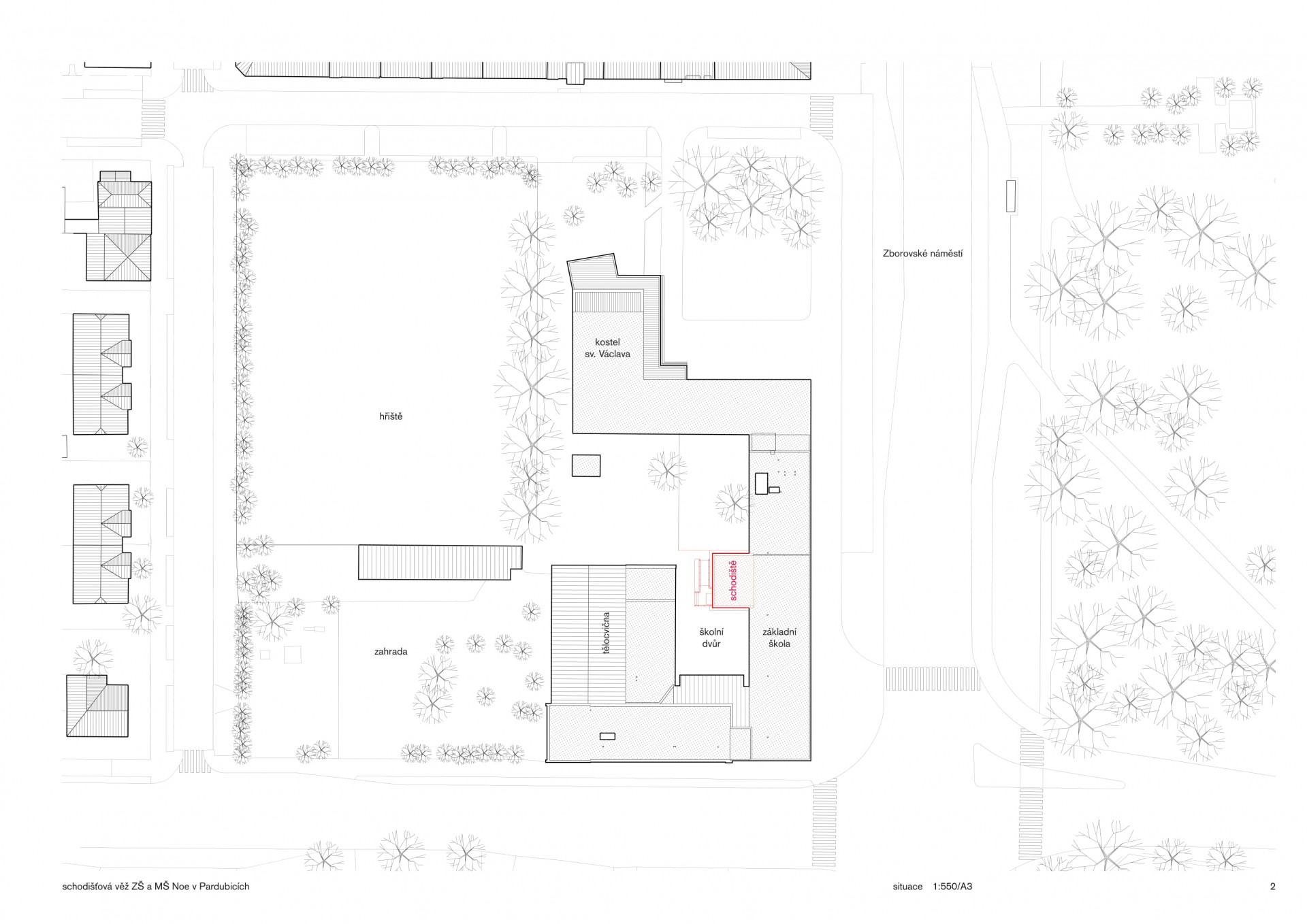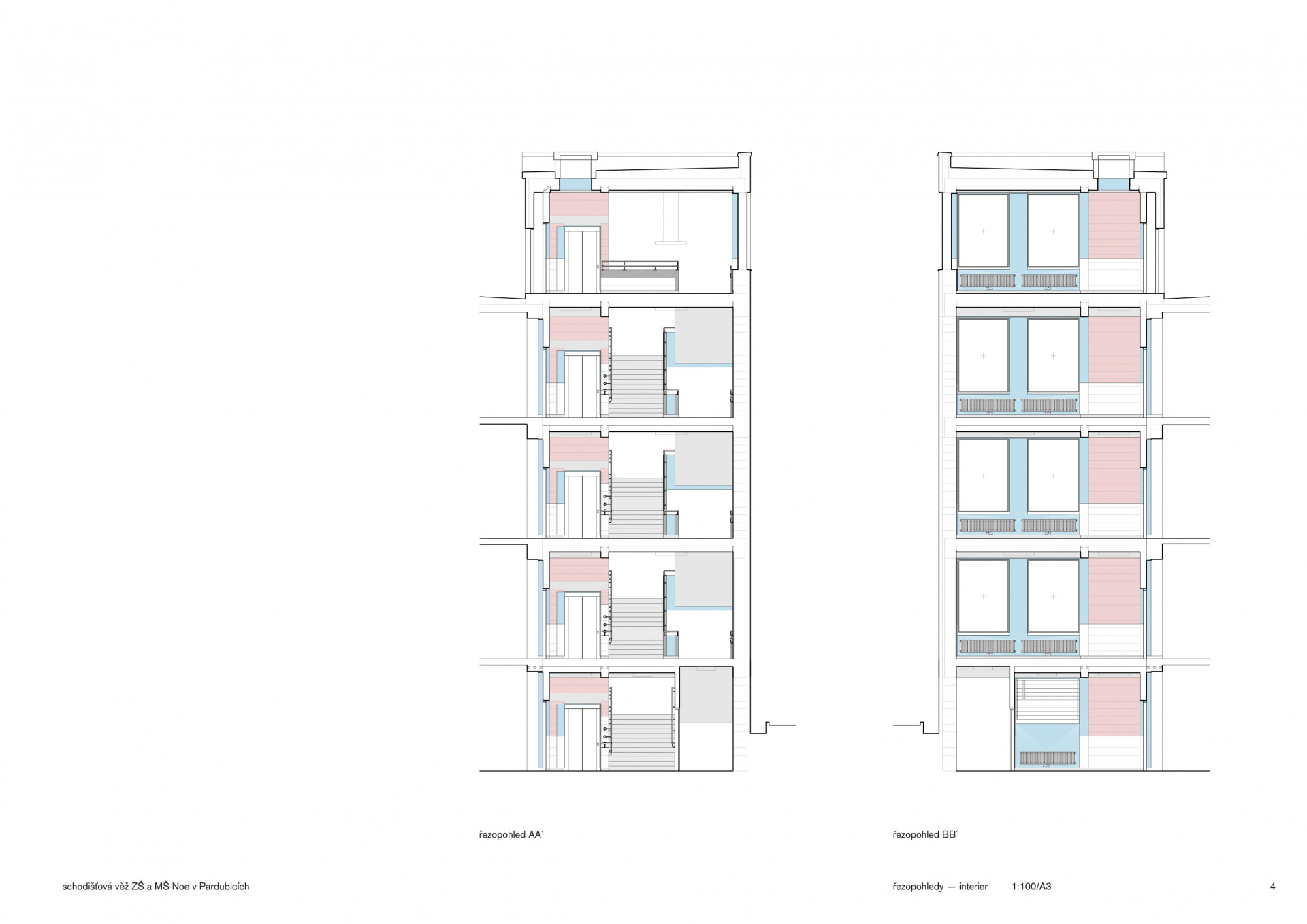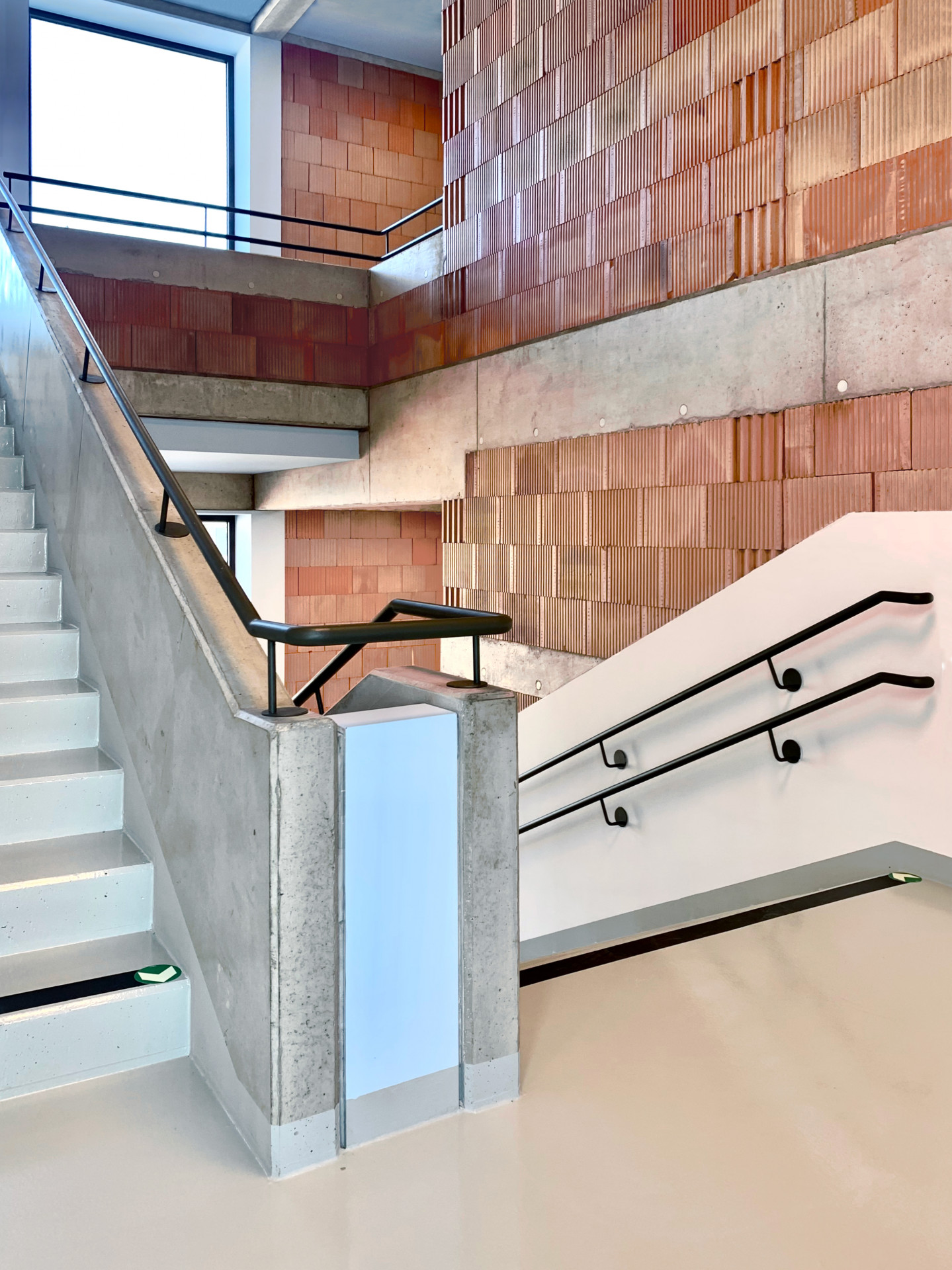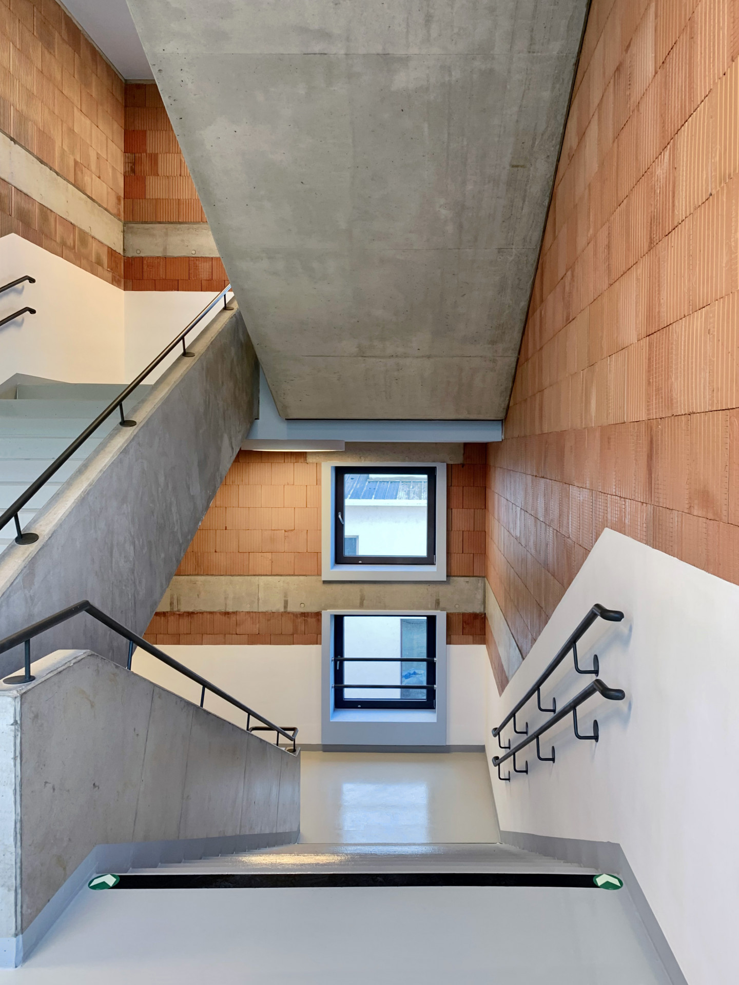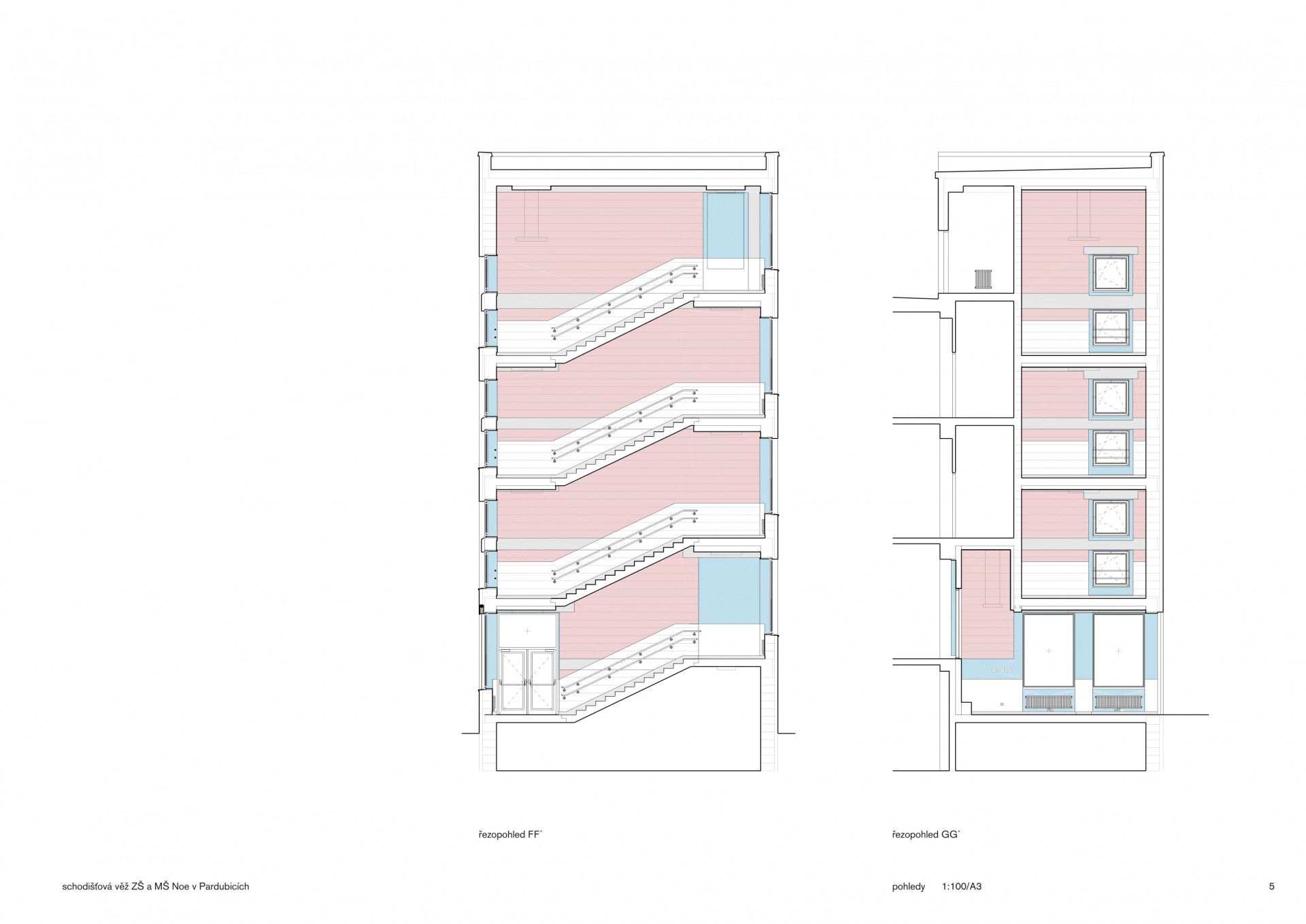 „Od začátku jsme si kladli otázku, jak udělat hlavní školní schodiště, které bude zapamatovatelné, reprezentativní, velkorysé a zároveň splní požadavky dané přísnými požárně–bezpečnostními normami, požadavky na bezbariérové řešení i na minimalizaci investičních nákladů,“ říkají architekti z ateliéru Světlík Šedý Šefl. Schodišťová věž měla být bezpečná, praktická a hravá zároveň. Vedle schodiště jí prochází i výtahová šachta. Jelikož jde o požární únikovou cestu, nemohou zde být žádné hořlavé materiály. Z bezpečnostního hlediska chybí i výtvory dětí, nástěnky a další potenciální překážky.
