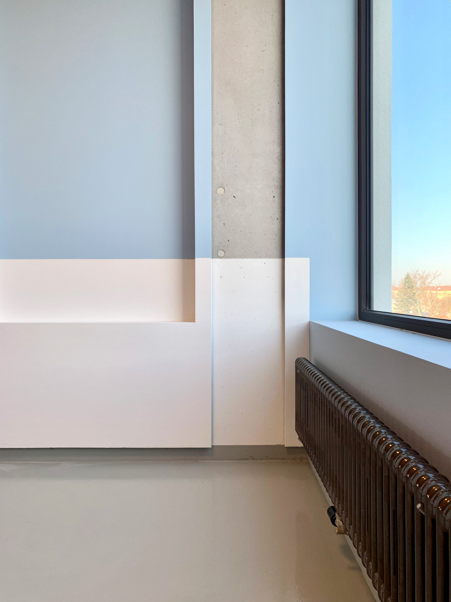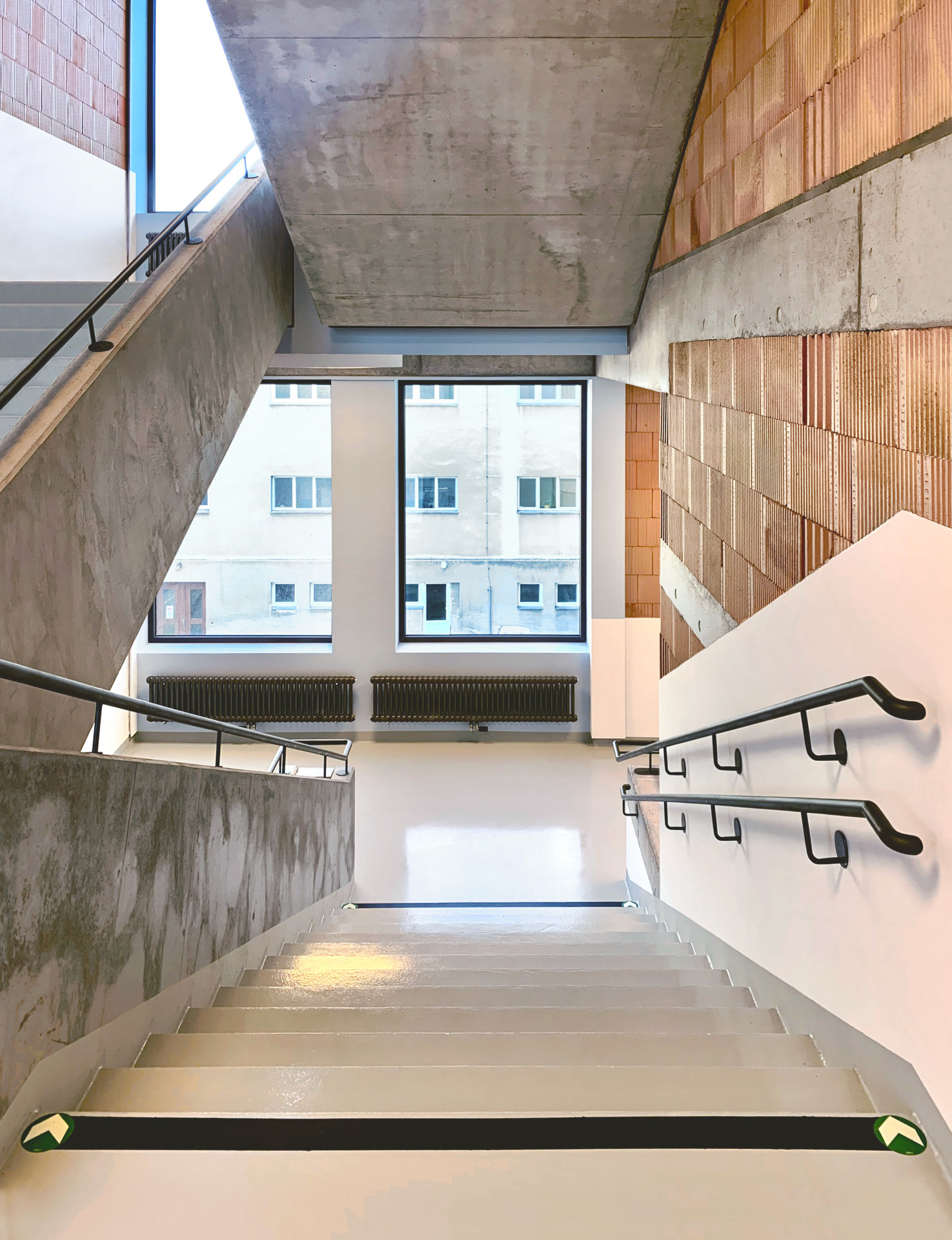 Přitažlivé interiéry musí jít ovšem ruku v ruce s jejich praktickým užíváním a údržbou. Architekti pro vytížený komunikační prostor zvolili šedé podlahy s epoxidovým nátěrem. Stěny jsou v místech náchylných ke špinění opatřené bílým nátěrem, který je možné obnovovat. „Údržba prostorů, zejména podlah, je bezproblémová. Jenom mytí velkých oken z plošiny je náročnější,“ dodává Markéta Chmelová. Okna, která věž prosvětlují, jsou zasazená do tmavých rámů, ladí ke všem dveřím i tmavému trubkovému zábradlí.