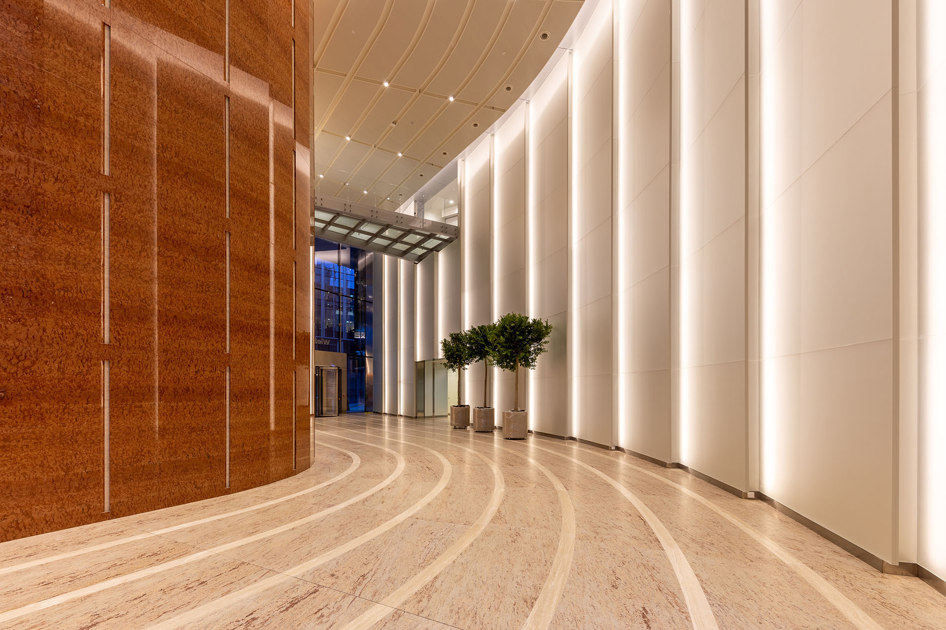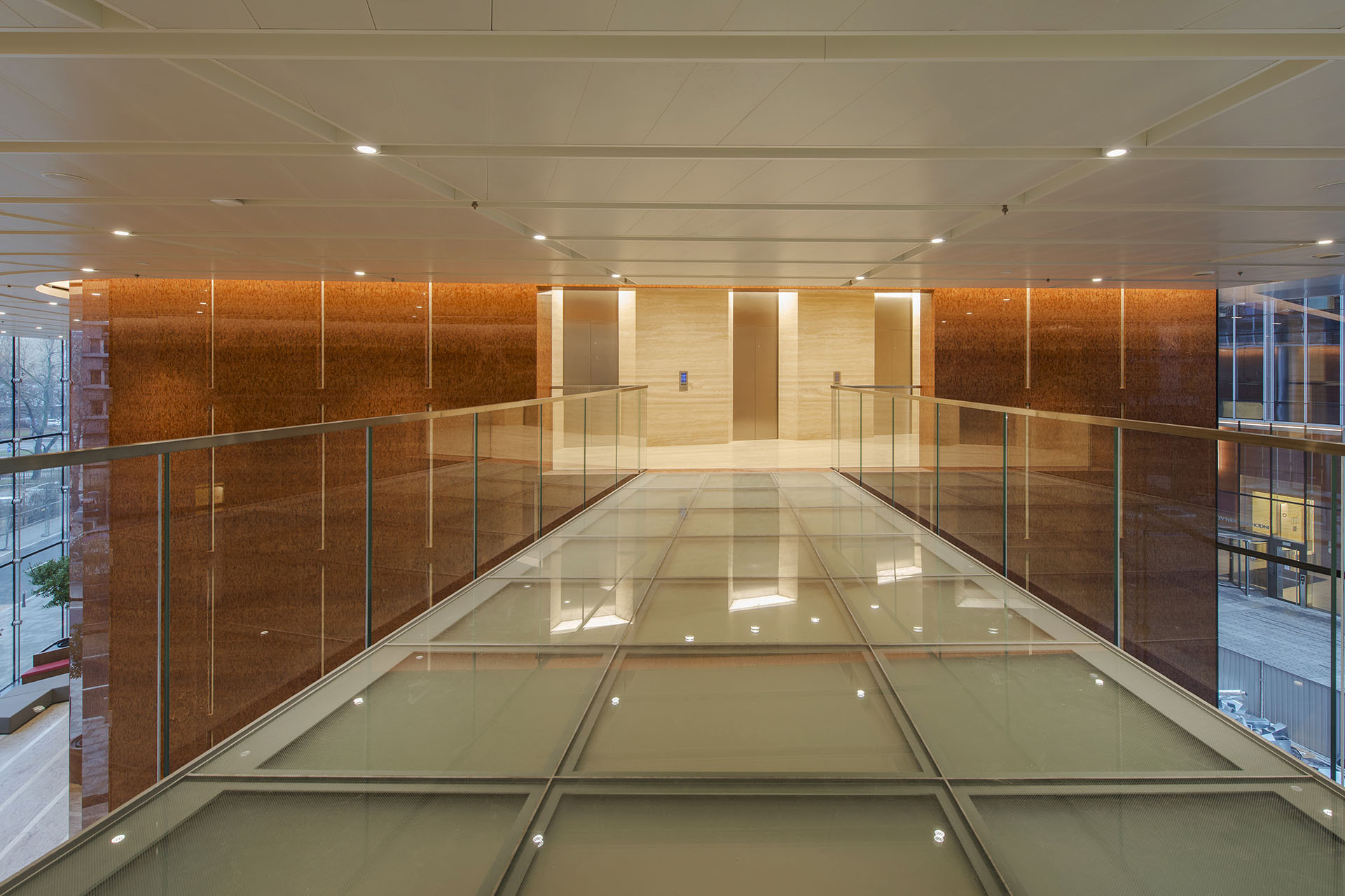 Vnitřní prostory lobby zdobí leštěný mramor a stěny výtahových šachet jsou obloženy travertinem, který vytváří v kontrastu se sametovým povrchem použitých matovaných skel Matelux a stříbřitě matných lakovaných skel Matelac Silver na stěnách, uživatelům vstřícné prostory.