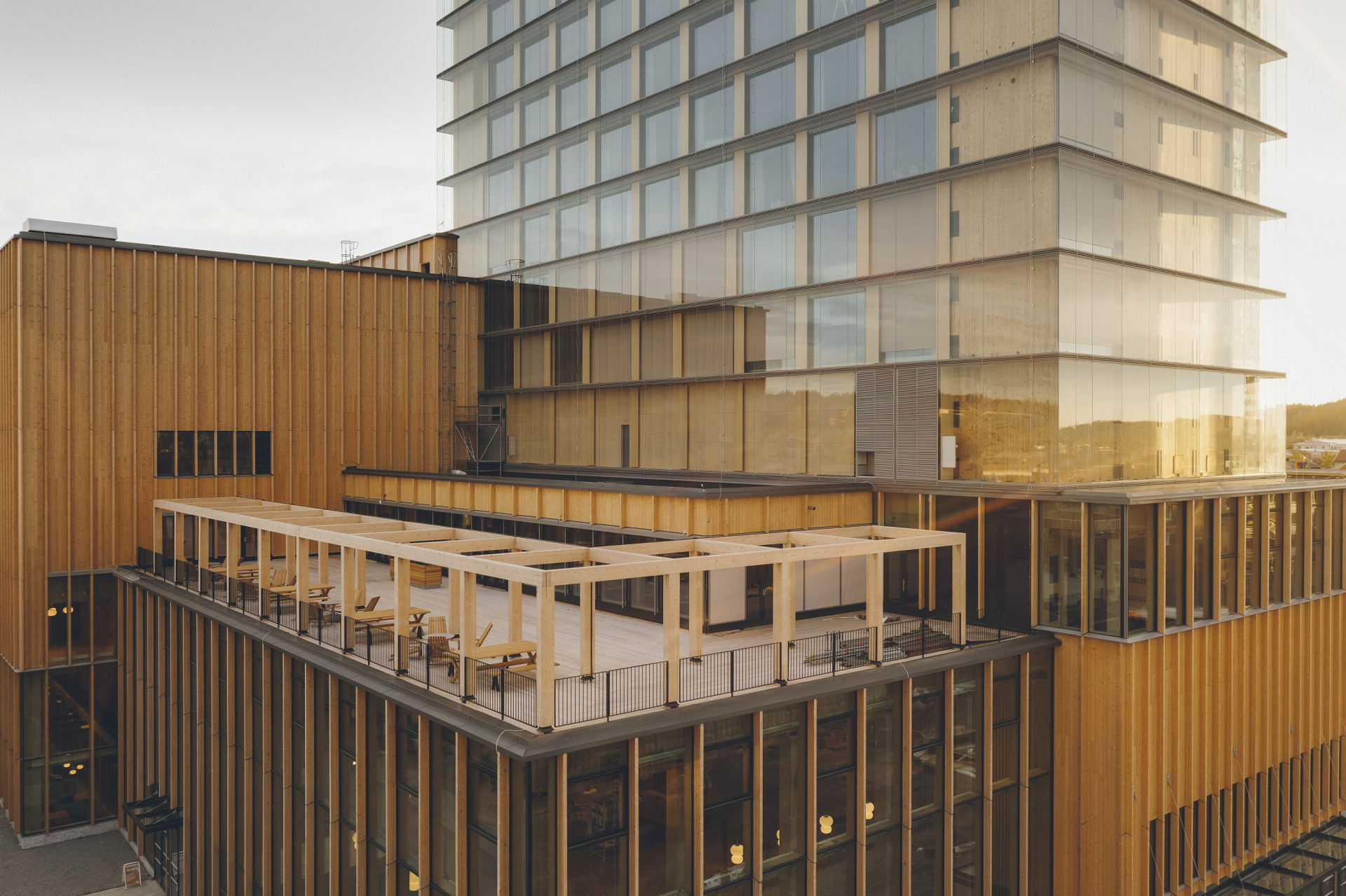 V nižších patrech architekti použili celoprosklené fasády v systému ALUPROF MB-SR50N, který umožňuje použít velkoformátová skla do hmotnosti až 1100 kilogramů. Zbytek výškové budovy je obalen provětrávanou dvouplášťovou fasádou MB-SW55, která byla na míru vyvinuta právě pro tuto stavbu. Díky velkým proskleným plochám se tak odhaluje struktura dřevěného jádra stavby.