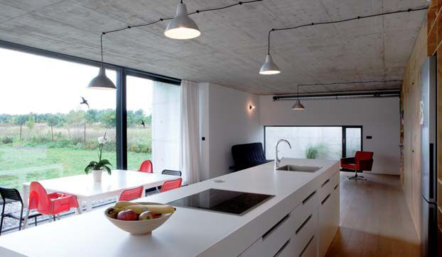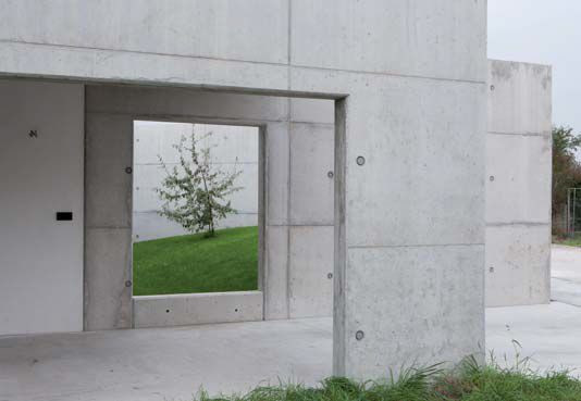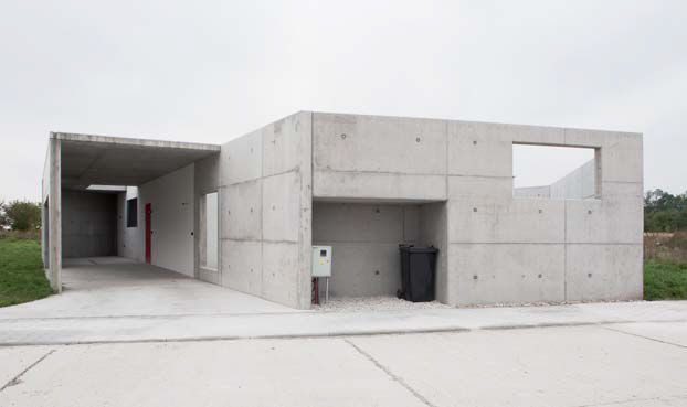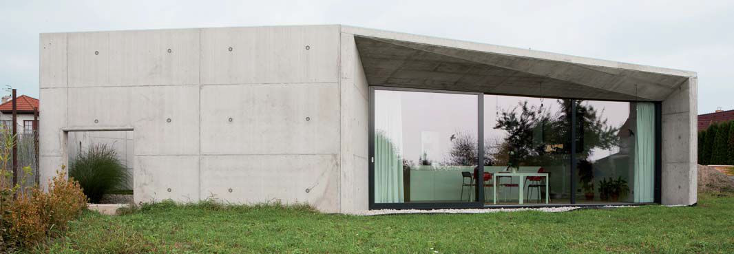 Dům postavený na okraji malé obce nedaleko Bratislavy je příkladem použití surového pohledového betonu pro jeho estetické kvality. Zvnějšku se dům na první pohled jeví jako betonový hrad, železobetonové stěny vymezují soukromou část chráněnou před zraky kolemjdoucích, avšak samotný jednopodlažní dům o čtvercovém půdoryse je cihlový.