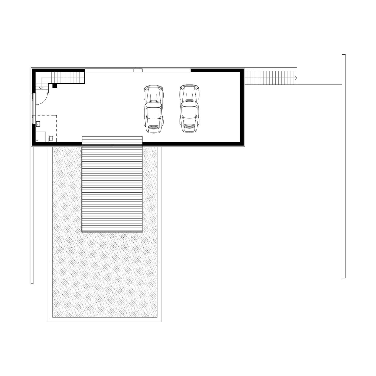Svažitá parcela se nachází v lokalitě nového satelitu města Nový Jičín s různorodými domky. Naším záměrem bylo se od těchto domečků oprostit a pro zajištění soukromí a pohledové izolace vůči okolí jsme dům navrhli do terénního zářezu. „Zakopali” jsme tak obytnou část o 3 m níže než vede vstupní komunikace, vytvořili atrium na bydlení s výhledem na hrad Starý Jičín a také na panorama města Nový Jičín. Vstupní objekt je pouze garáží a dílnou majitele, prostory pro bydlení rodiny se nachází v přízemí. Podobný princip je u slavné vily Tugendhat v Brně (vstupní přízemí – garáž, ložnice, po schodech se jde dolů do obytné části a terasy…).