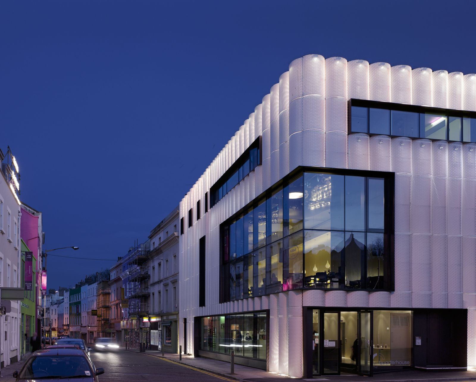 Quarterhouse je první vlaštovkou, „vlajkonošem“ iniciujícím zrod nového kulturního střediska ve Folkerstone a zároveň organicky zceluje a ukončuje blok meziválečných domů, formujících stáčející se Tontine Street. Nejvýraznějším rys budovy představuje obložení vroubkovaným pletivem, které je v noci zevnitř osvětlováno. Tento motiv přitom odkazuje na blízkost moře hned dvojím způsobem: jednak na přímořskou ikonografii Folkestonu – na frontony se vzorem mušlí, na městské přístavy a pláže –, jednak na křehkou a průsvitnou texturu mušlí, které zde moře každý den vyplaví.