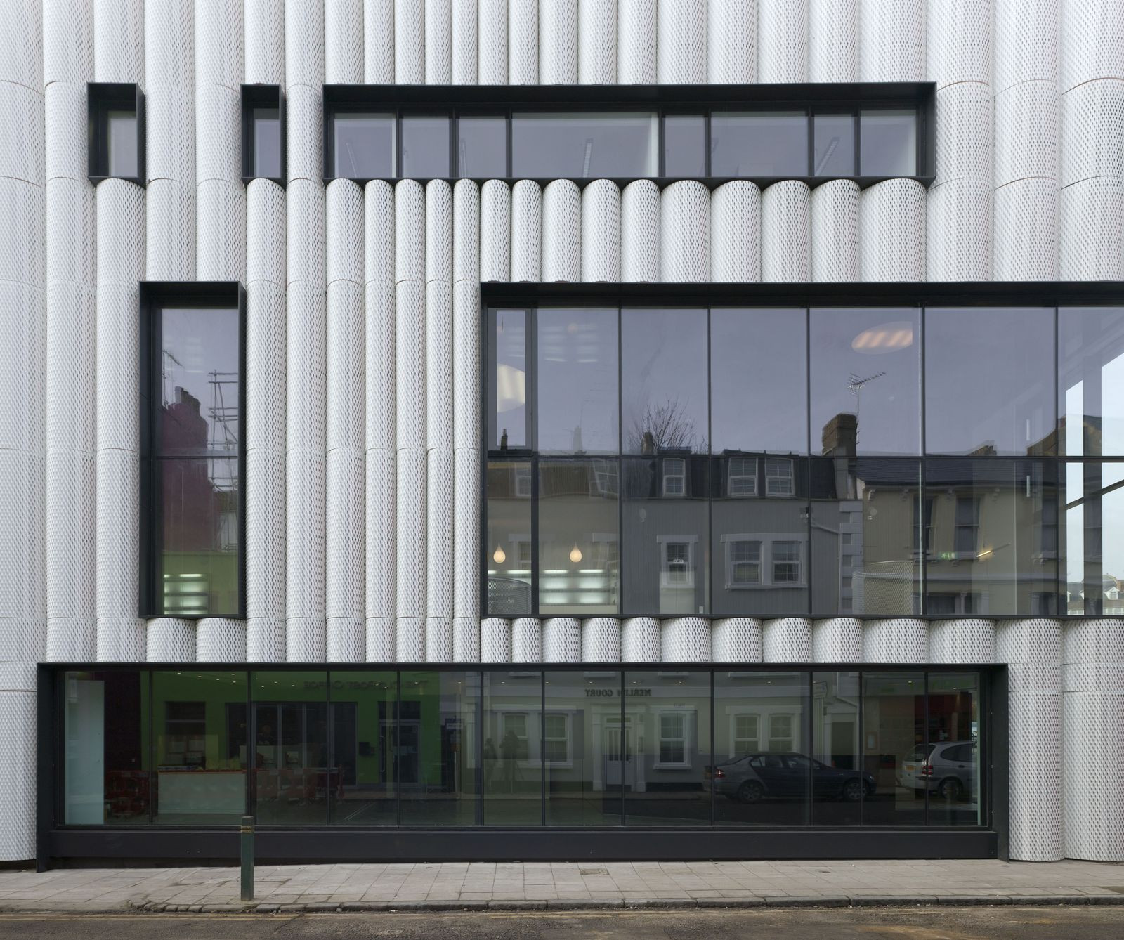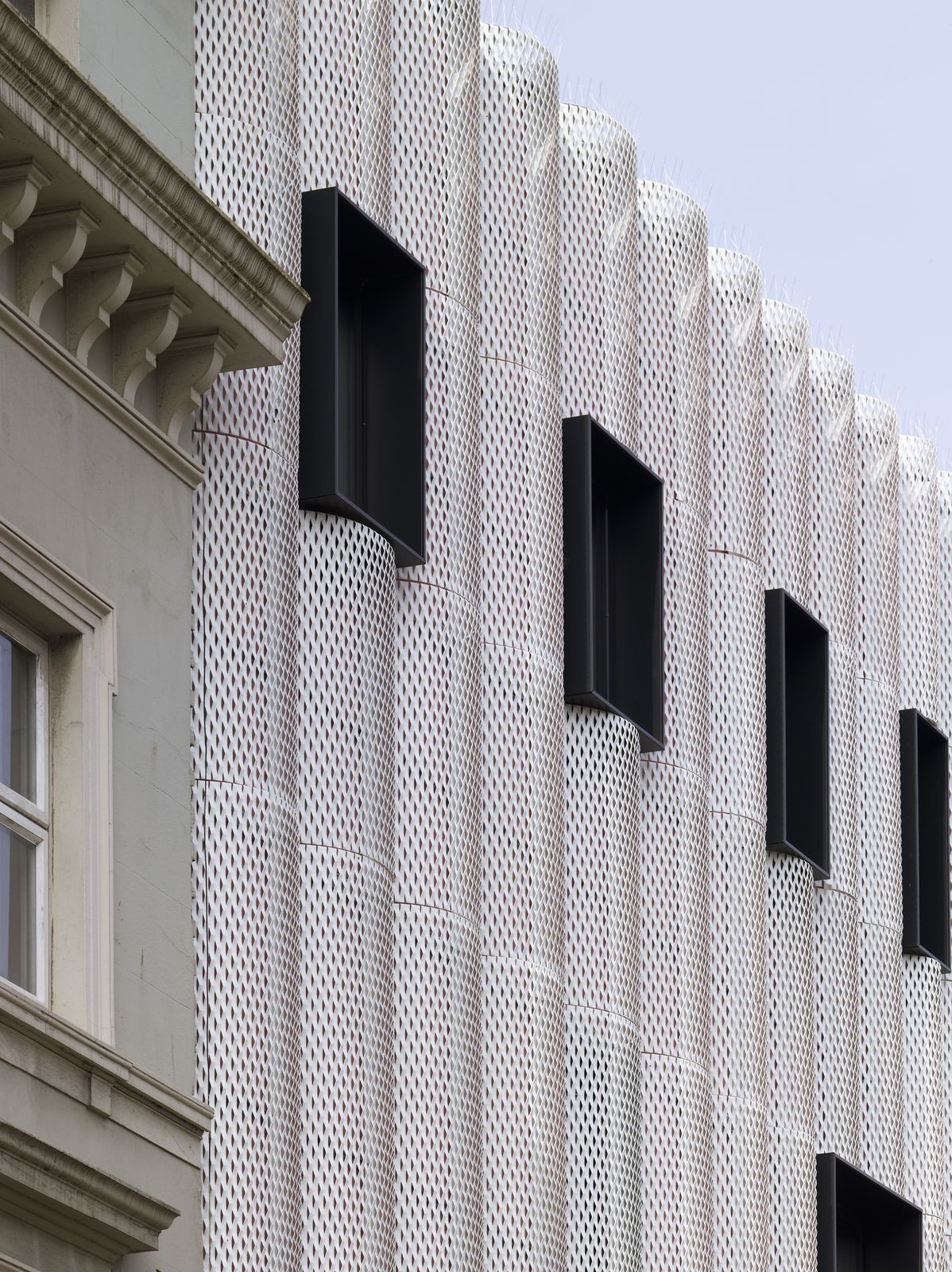 Opláštění bylo vyvinuto tak, aby budovu chránilo. Přestože je fasáda plochá, síť vytváří modulovaným rozmístěním rýh a vroubkování iluzi zakřivení – podobá se tak divadelní oponě a zároveň v závislosti na denní době a osvětlení proměňuje vizualitu budovy. Dynamické vzezření má evokovat pulzující život a radost z kreativity, jež budovu naplňují.