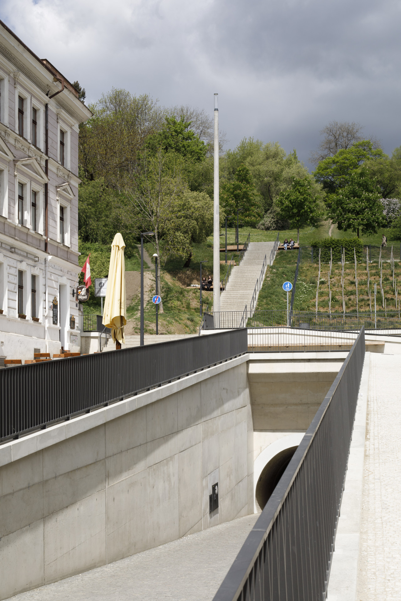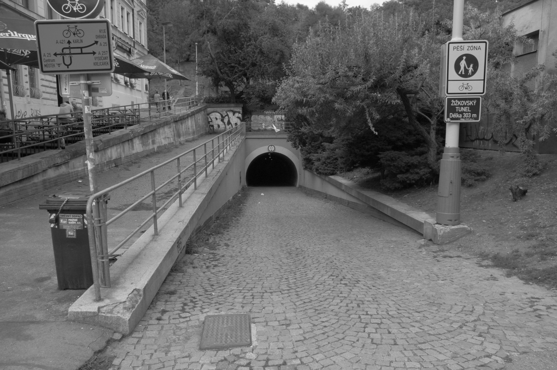 Dřív tudy proudili dělníci do tunelu a dále do karlínských továren. Dneska skrze tunel chodí lidé spíše do korporátních kanceláří. Ale jedna věc zůstala stejná – nikdy neškodí si po práci sednout na restaurační zahrádku nebo na lavičku s výhledem do zeleně.
