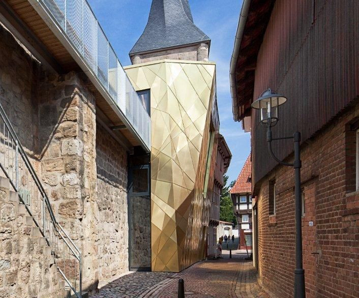 „Šikmé fasády nového křídla odkazují k podobně šikmým fasádám starých typických hrázděných domů v okolí, ale úplně jiným a novým způsobem. Zlatý povrch byl zvolen jako odkaz na lesklý kovový povrch starých zbraní, jako jsou brnění, meče a štíty.“