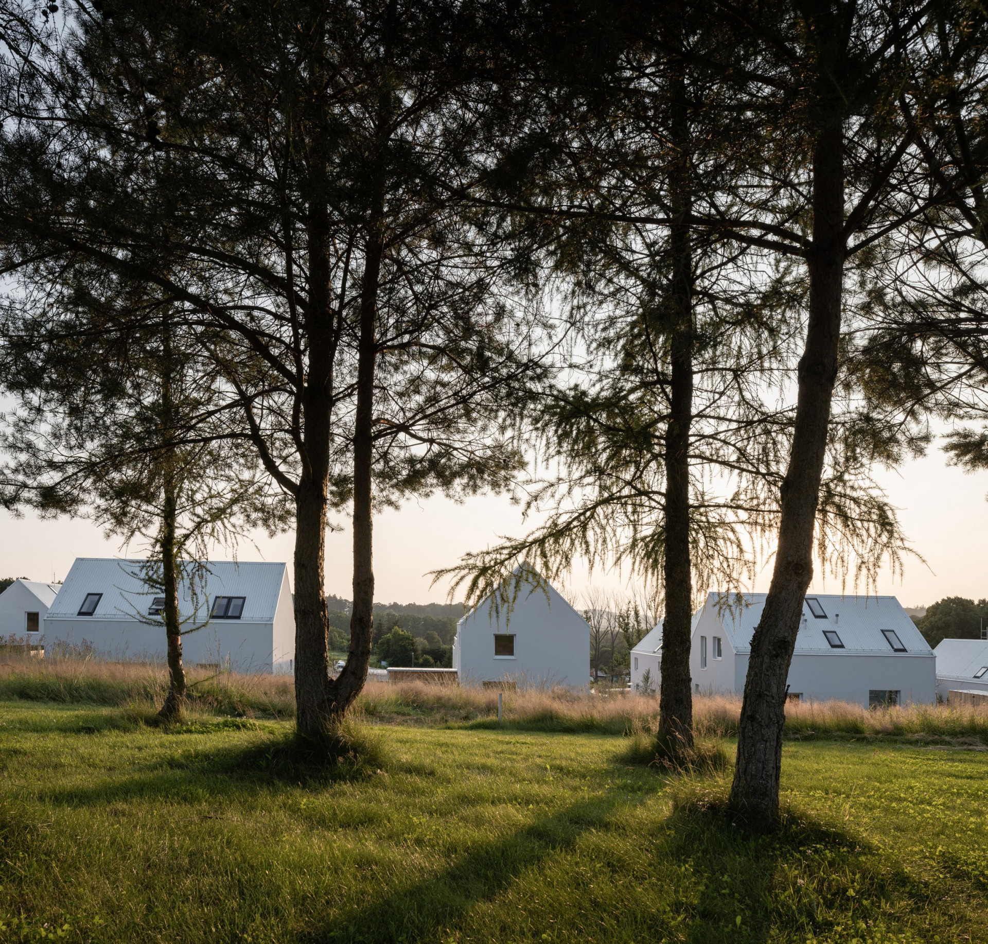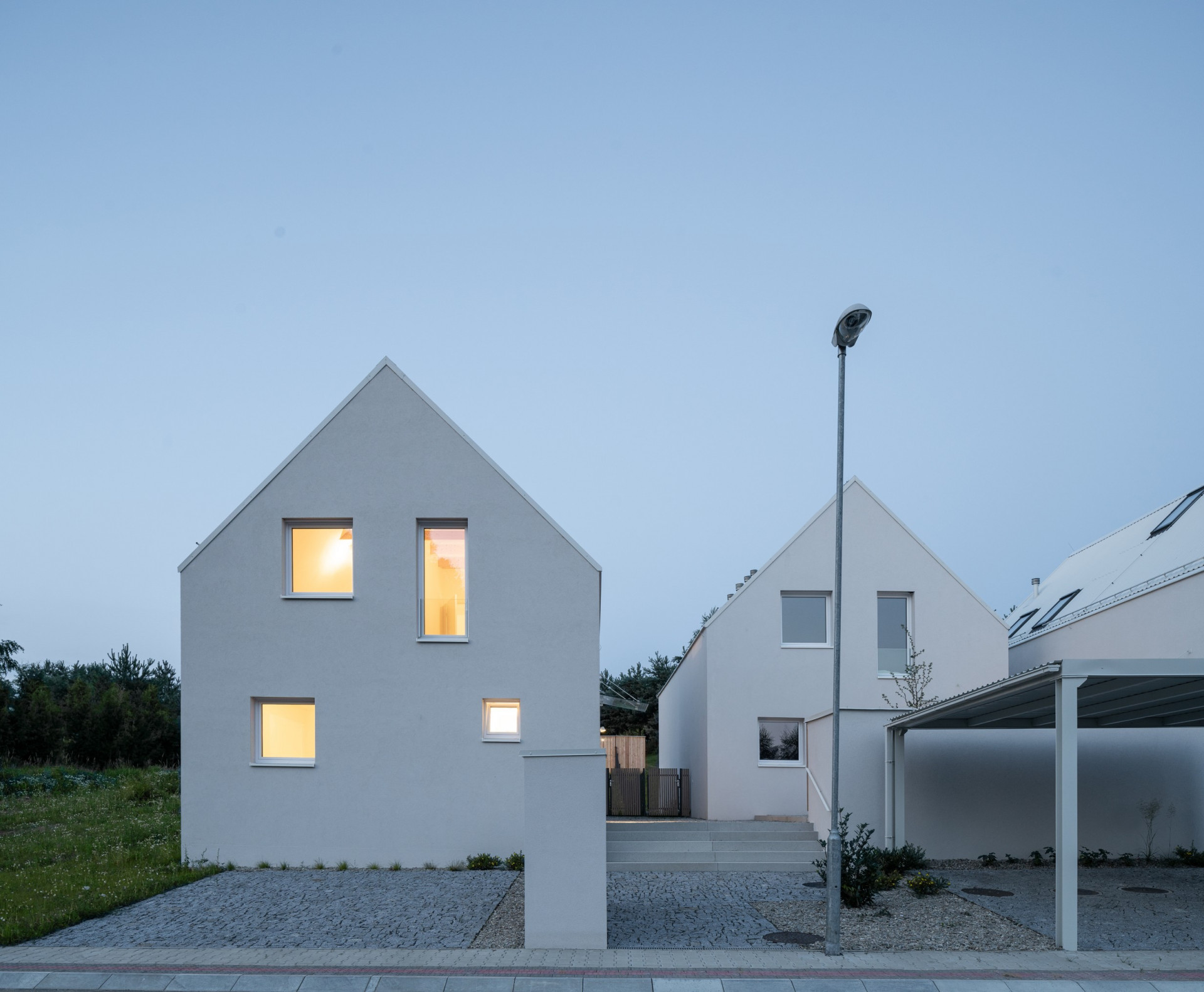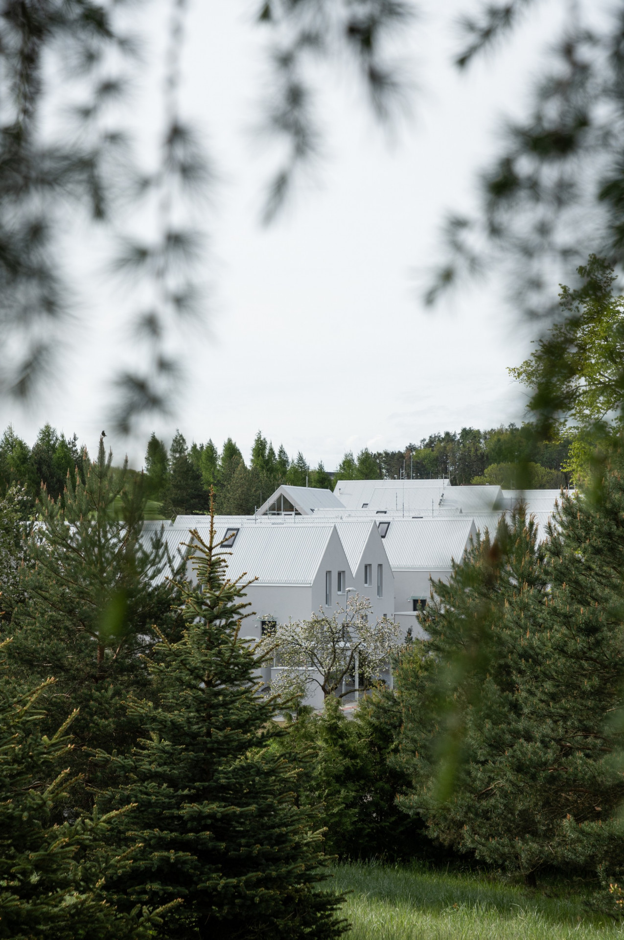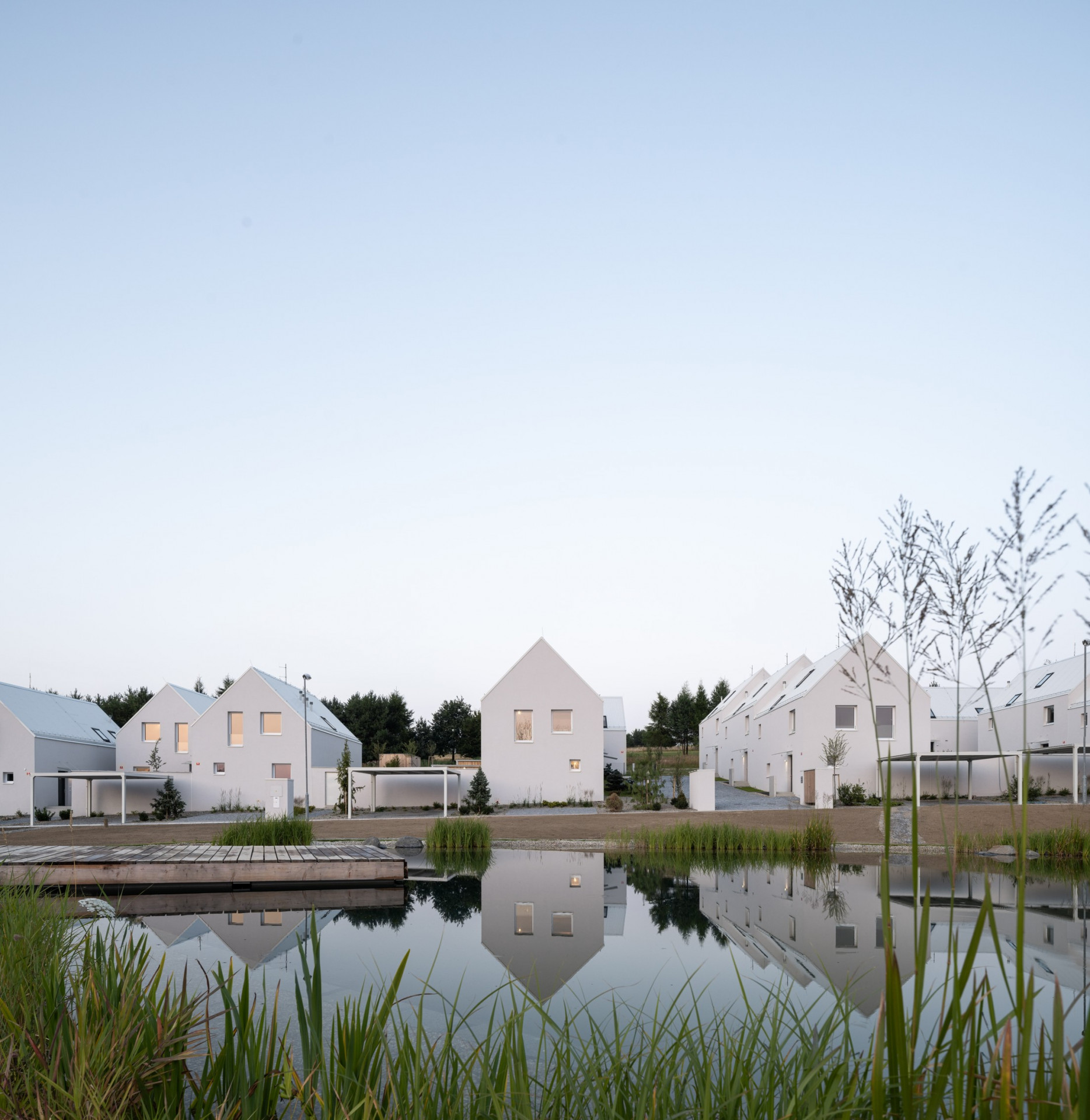 Minimalistickou podobu všech objektů scelují jednotné architektonické prvky, jako jsou sedlové střechy bez přesahu, světle šedé odstíny fasád i střešní krytiny nebo třeba velké prosklené plochy. Pozornosti architektů neunikly ani drobné přístavky k hlavním objektům včetně oplocení.