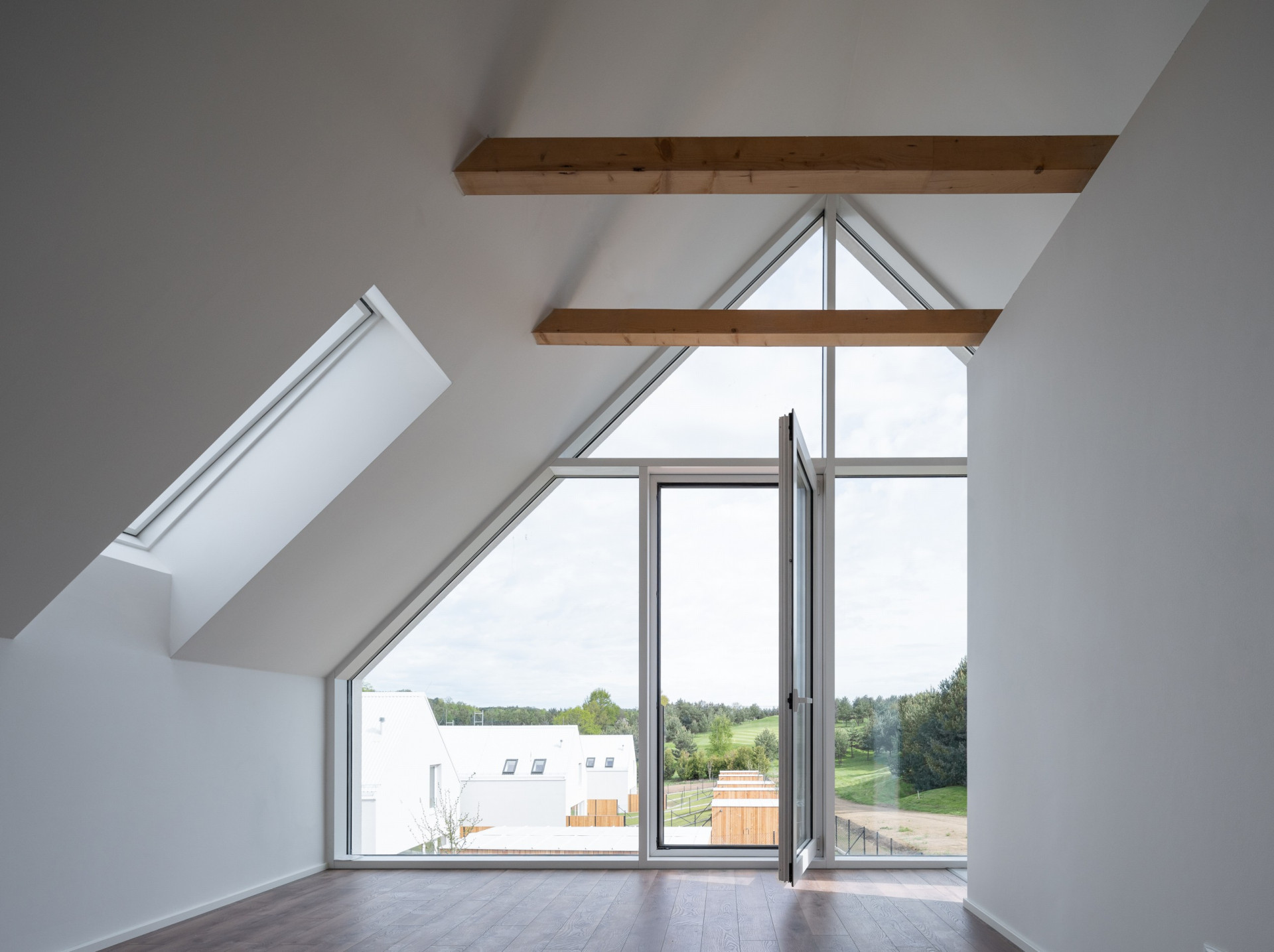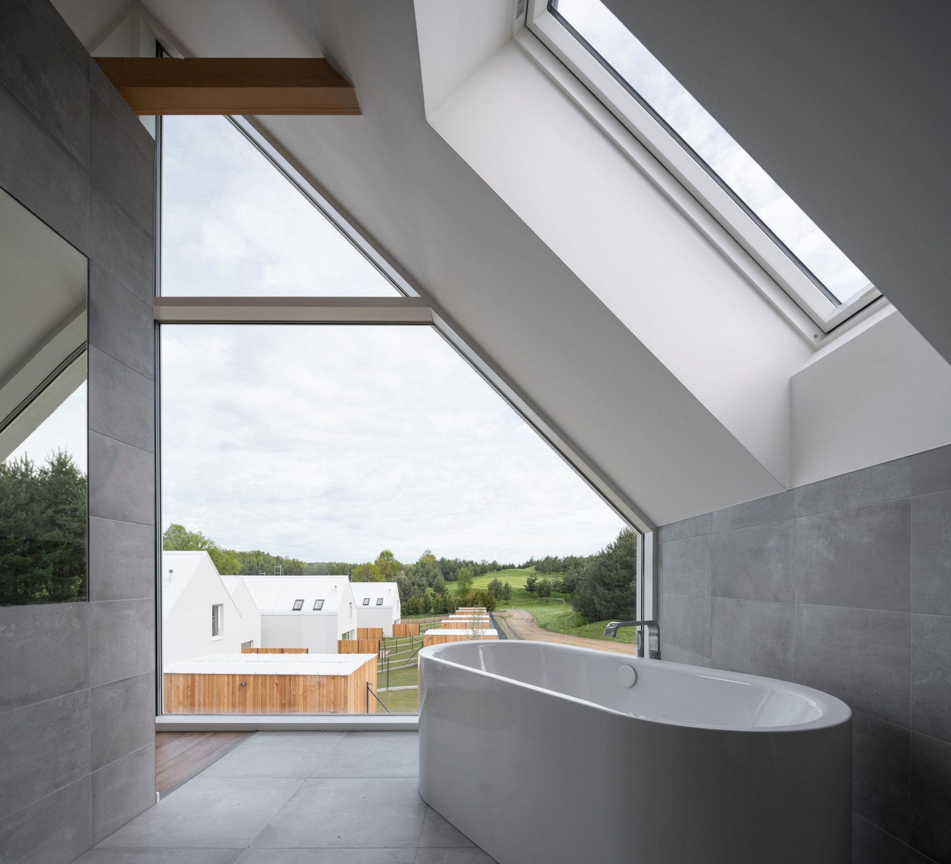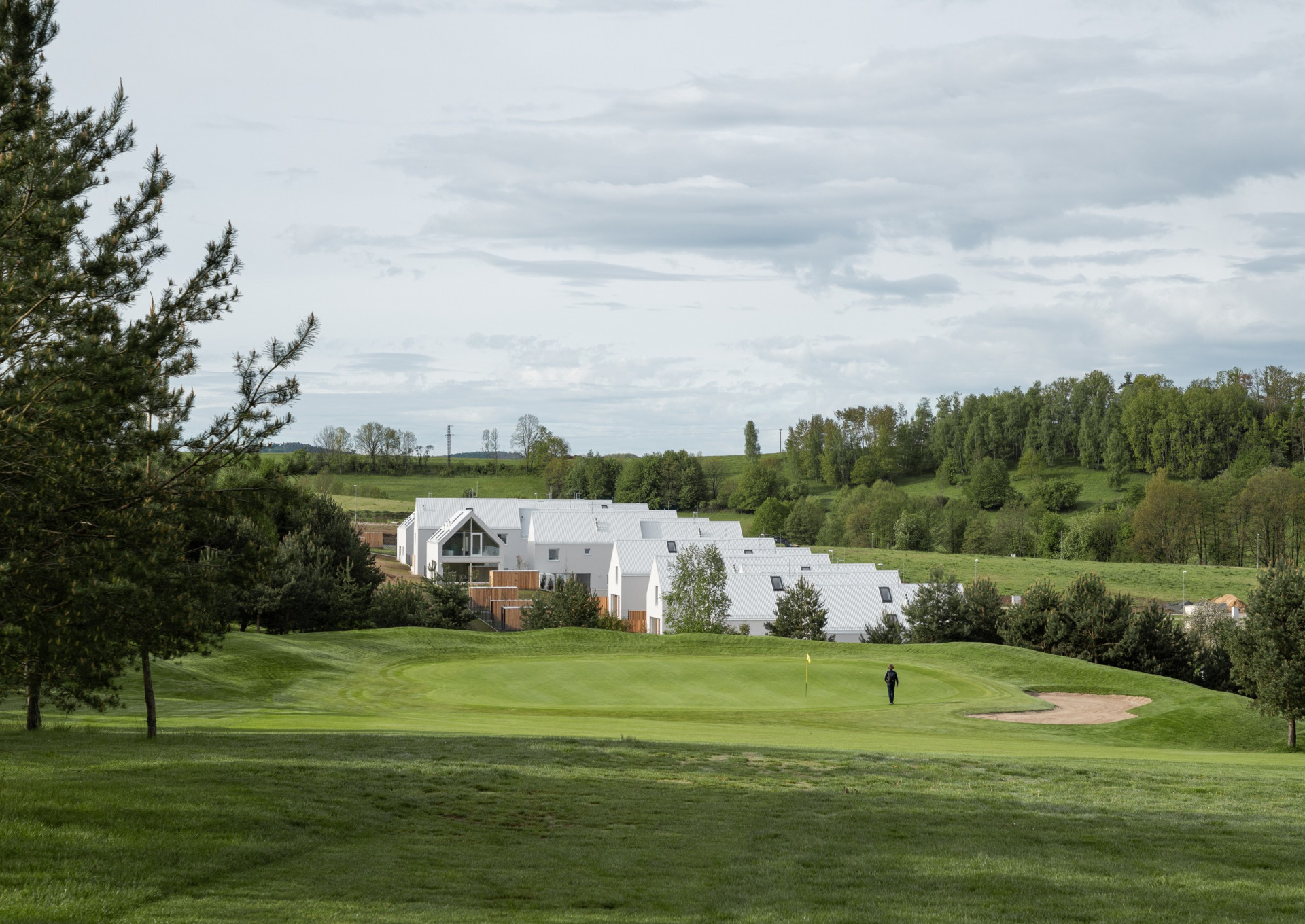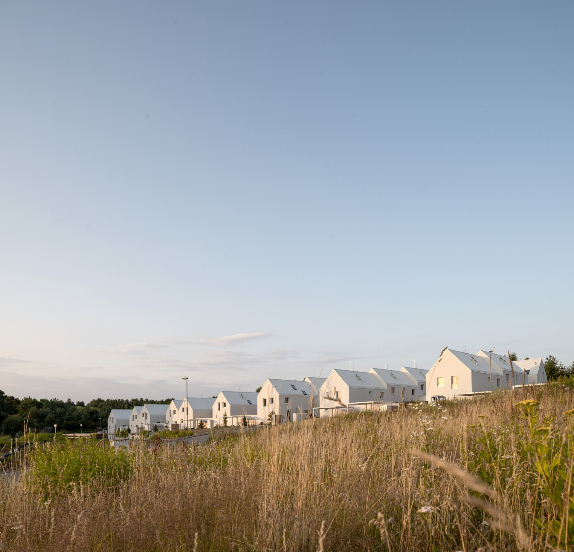 Minimalistickou podobu všech objektů scelují jednotné architektonické prvky, jako jsou sedlové střechy bez přesahu, světle šedé odstíny fasád i střešní krytiny nebo třeba velké prosklené plochy. Pozornosti architektů neunikly ani drobné přístavky k hlavním objektům včetně oplocení.