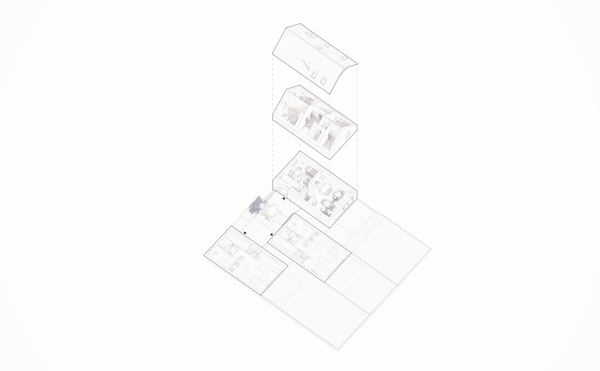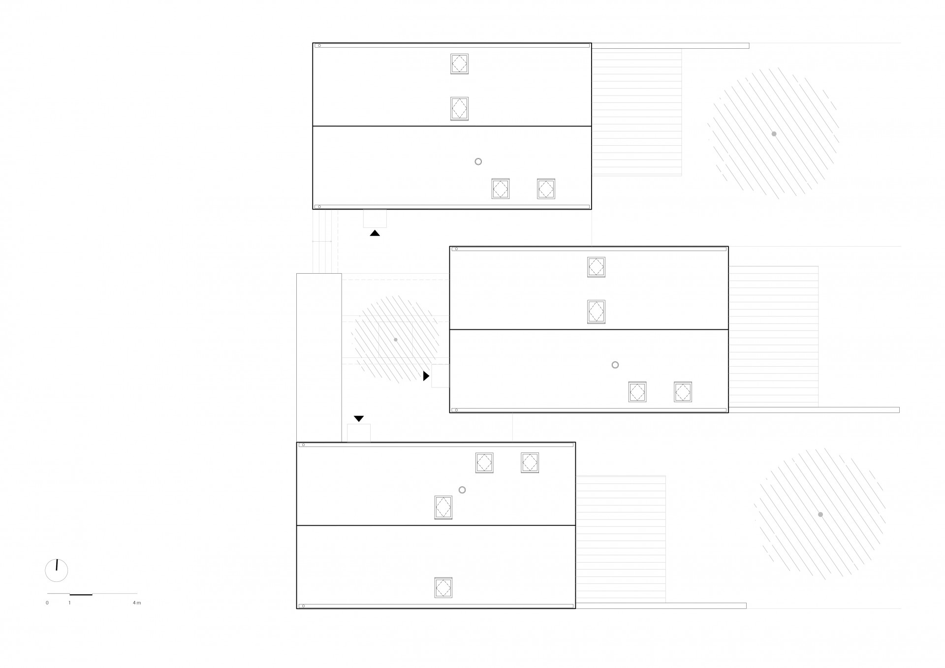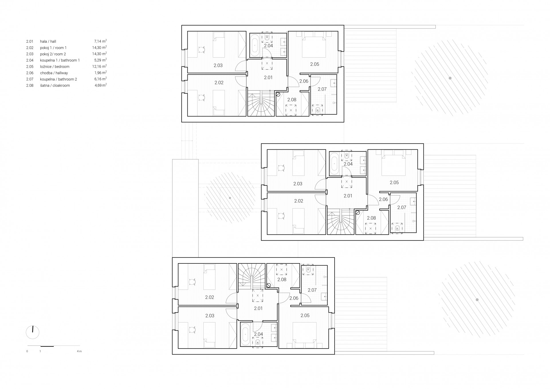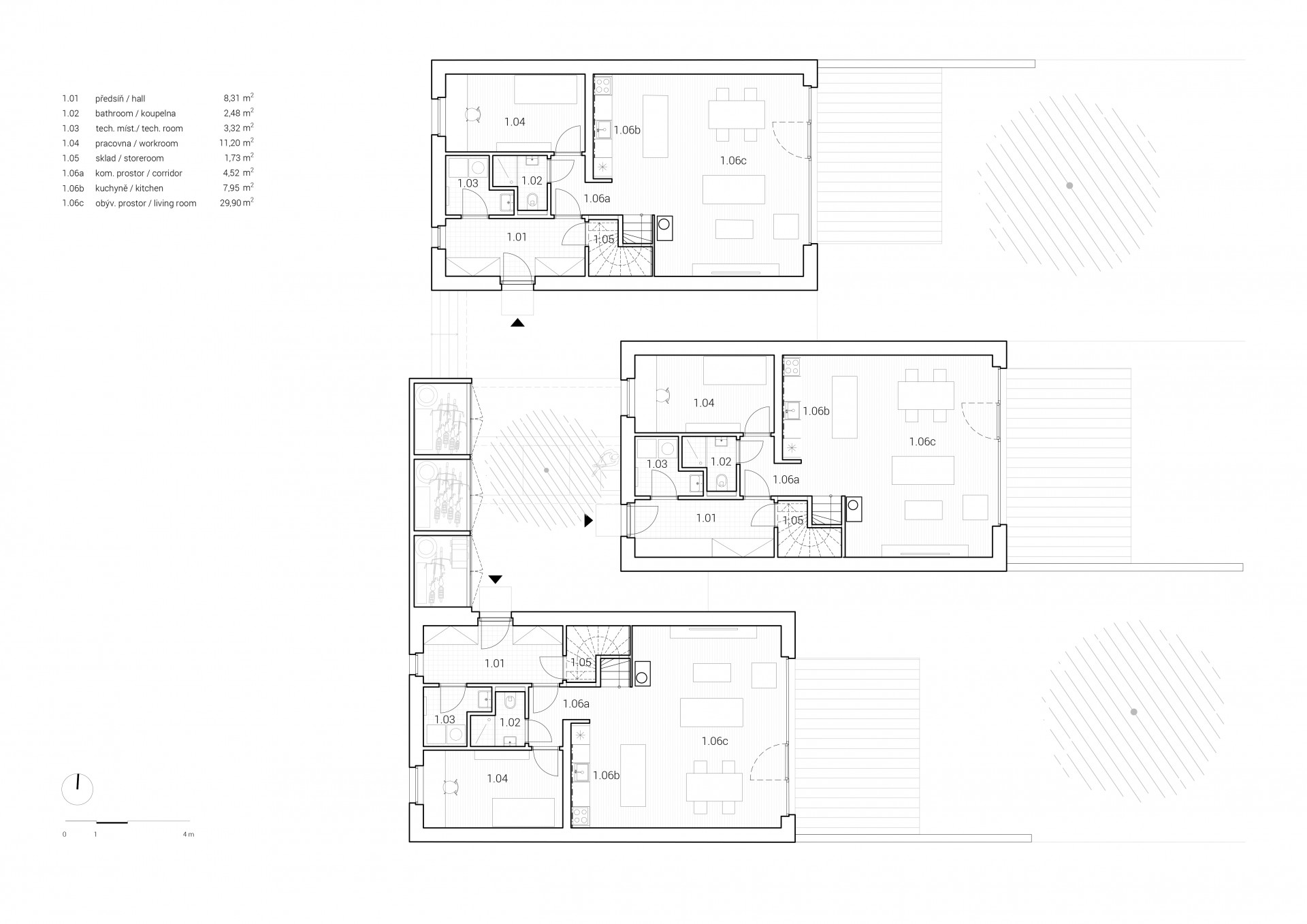 Minimalistickou podobu všech objektů scelují jednotné architektonické prvky, jako jsou sedlové střechy bez přesahu, světle šedé odstíny fasád i střešní krytiny nebo třeba velké prosklené plochy. Pozornosti architektů neunikly ani drobné přístavky k hlavním objektům včetně oplocení.