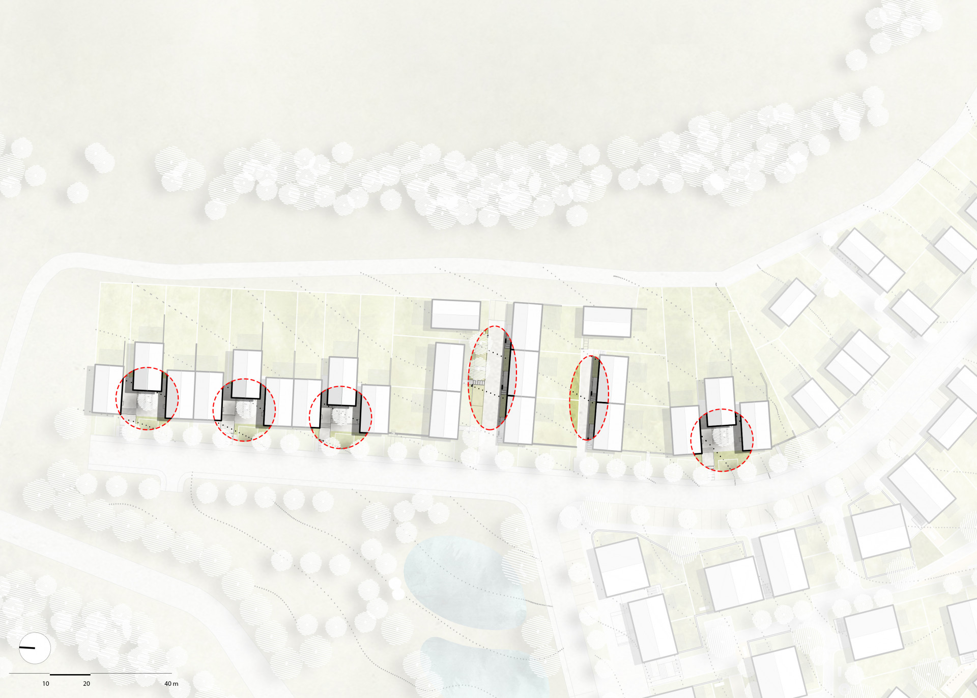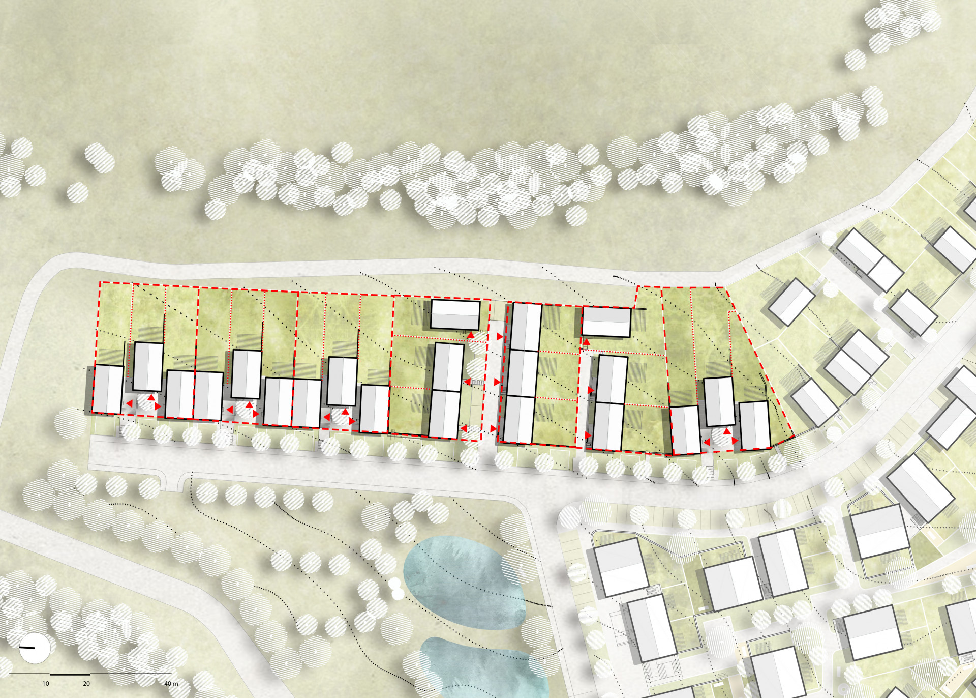 V urbanistickém řešení areálu architekti dbali na vytvoření veřejných prostranství různého charakteru – od veřejných a poloveřejných prostorů až po soukromé zahrady. „Středem řešené lokality prochází v návrhu od návsi až po vodojem cesta, jejíž charakter se se stoupáním k vodojemu mění - od urbánního prostoru po parkovou cestu mezi zahradami, až po veřejný sad,“ přibližují architekti.