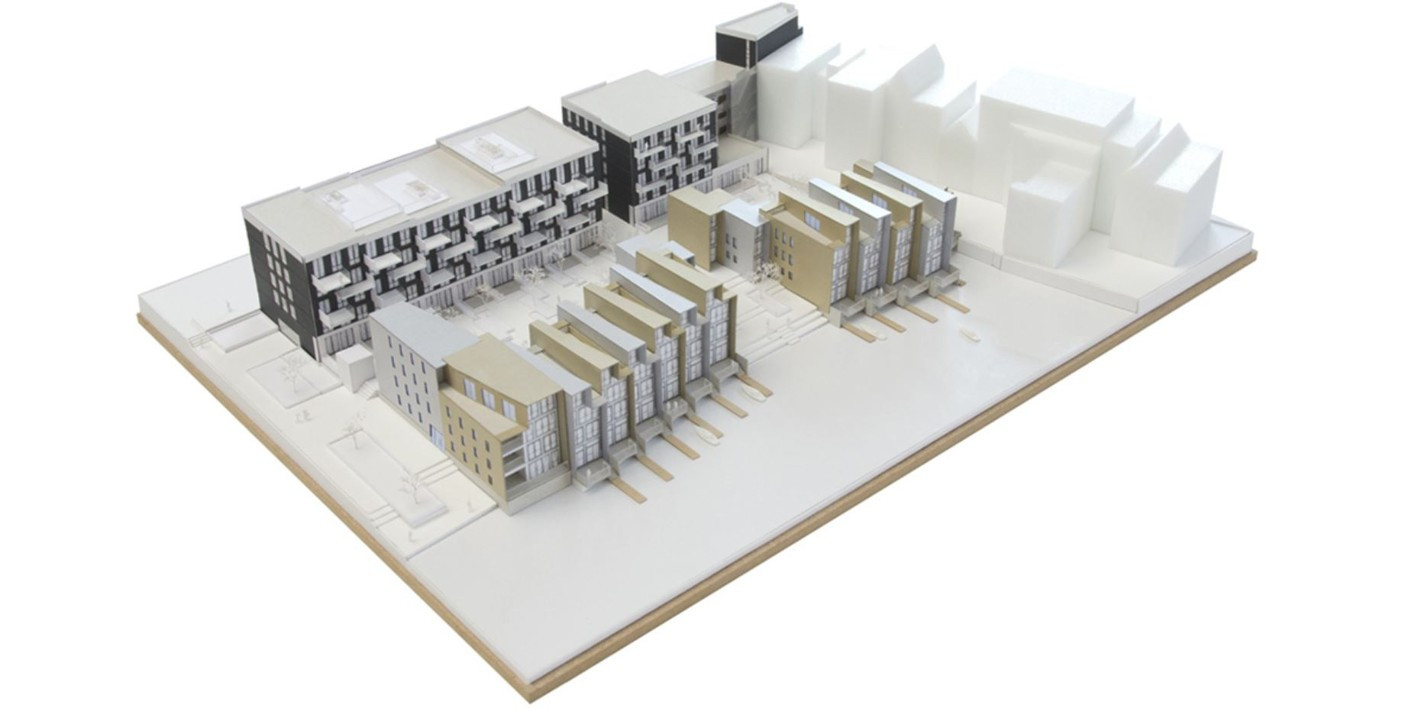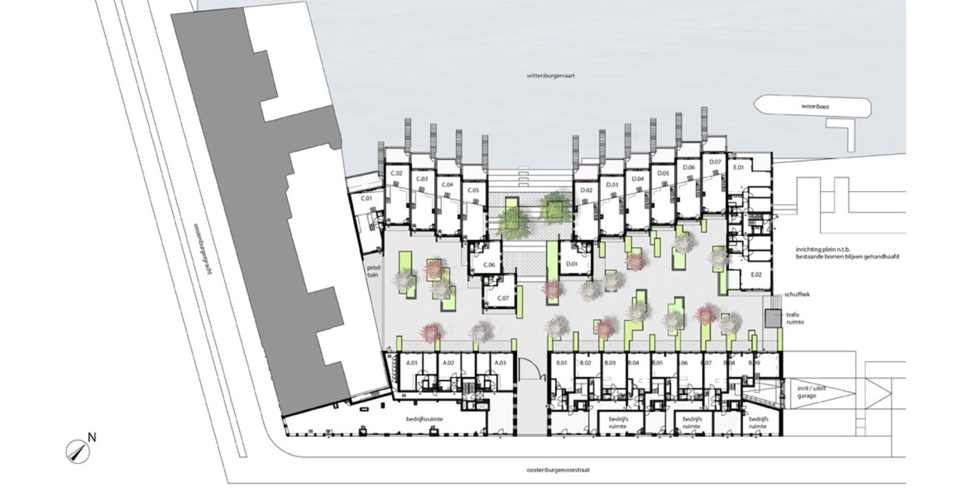 Strategicky je návrh od Arons en Gelauff architecten uspořádán do dvou skupin domů, přičemž každá má velmi odlišný charakter. Uliční průčelí definují dva tmavé cihlové bloky, které mezi sebou vytváří úzký průchod do centrálního prostoru zeleného nádvoří. Na břeh kanálu umístili architekti ustupující řadu bytových domů se zlato-stříbrným kovovým pláštěm.
