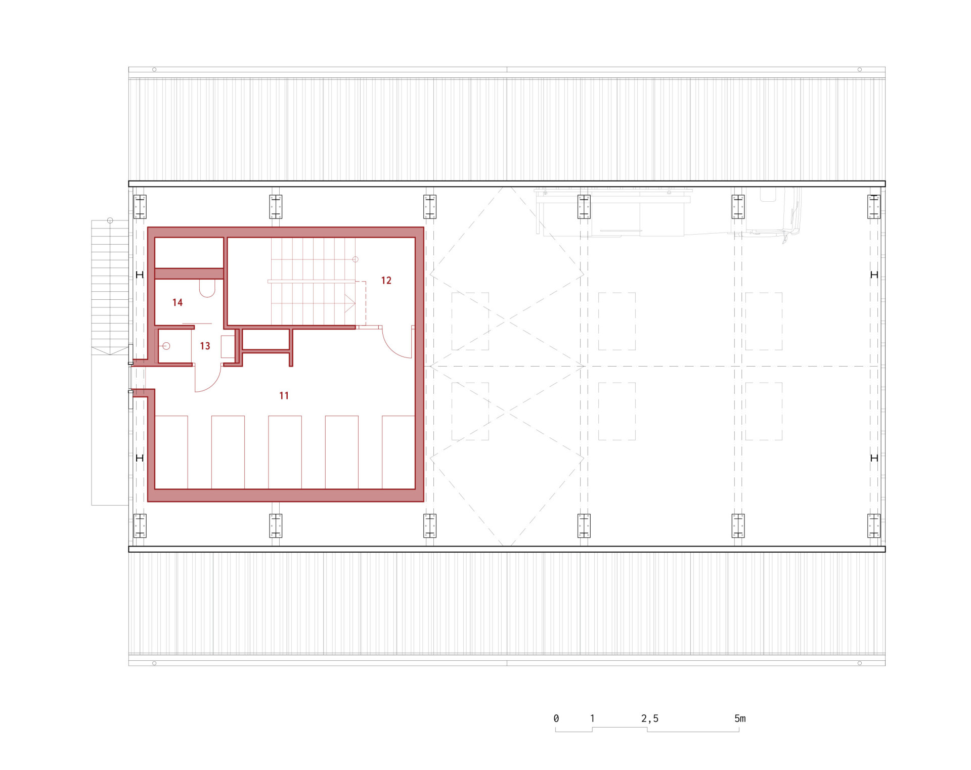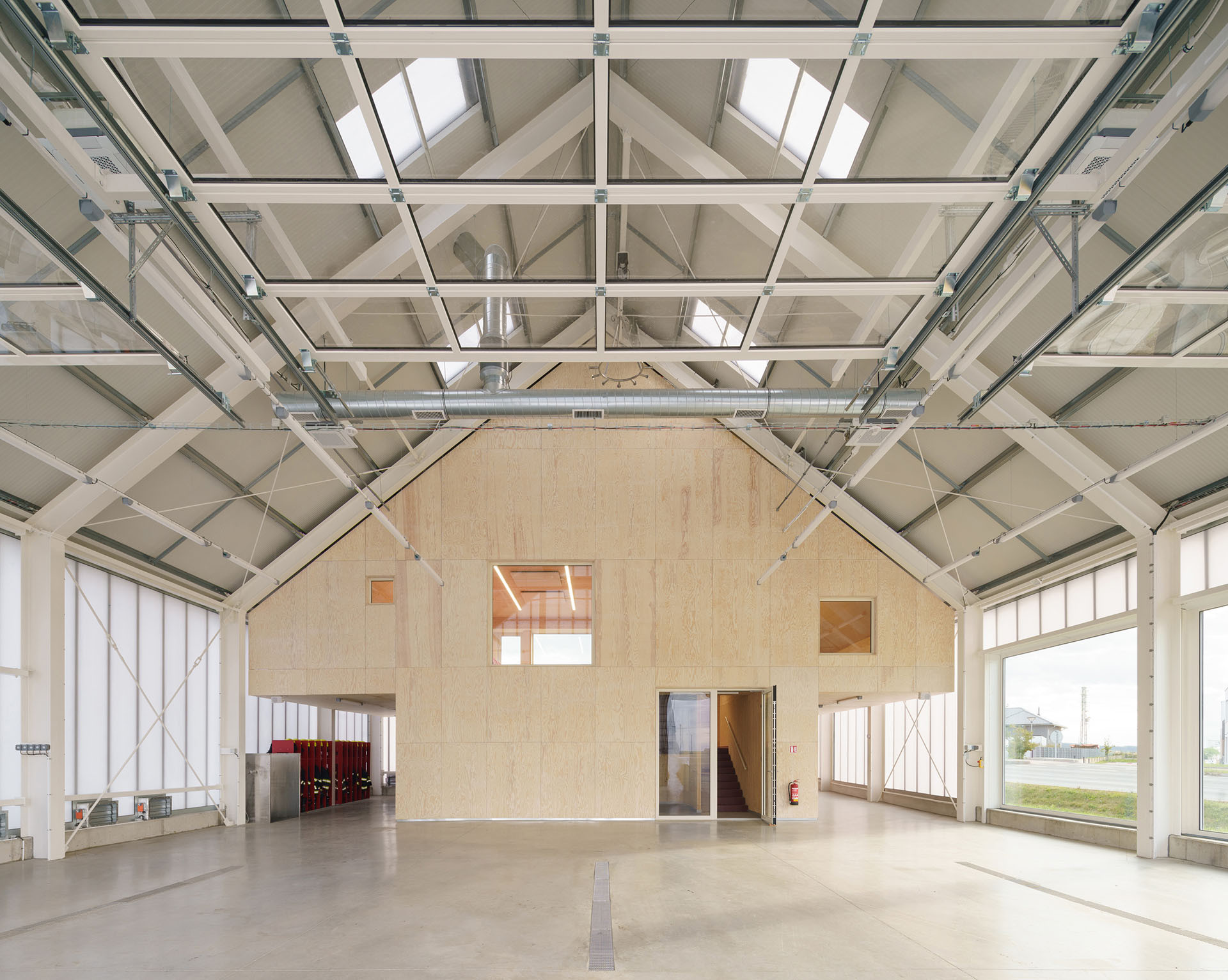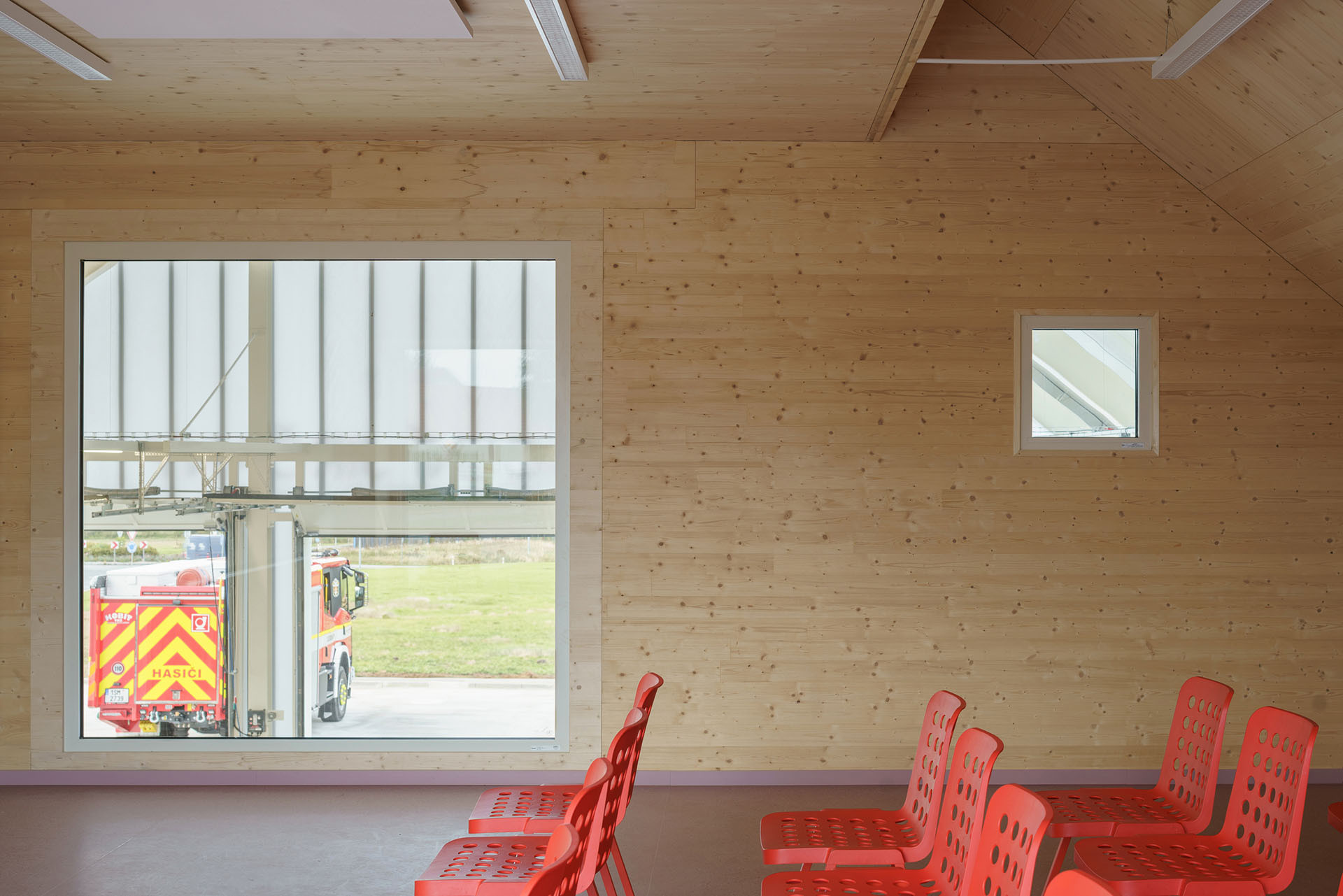 Uvnitř velké budovy se nachází ještě menší vestavba: „K lehké a transparentní obálce hasičárny představuje pevný a kompaktní vestavek její protiváhu. Vodorovné i svislé konstrukce vestavku jsou z CLT panelů. Z interiérové strany jsou CLT panely přiznané, z vnější strany, směrem do garáže, jsou zatepleny dřevovláknitými deskami a obloženy borovicovou překližkou,“ popisují architekti v autorské zprávě.