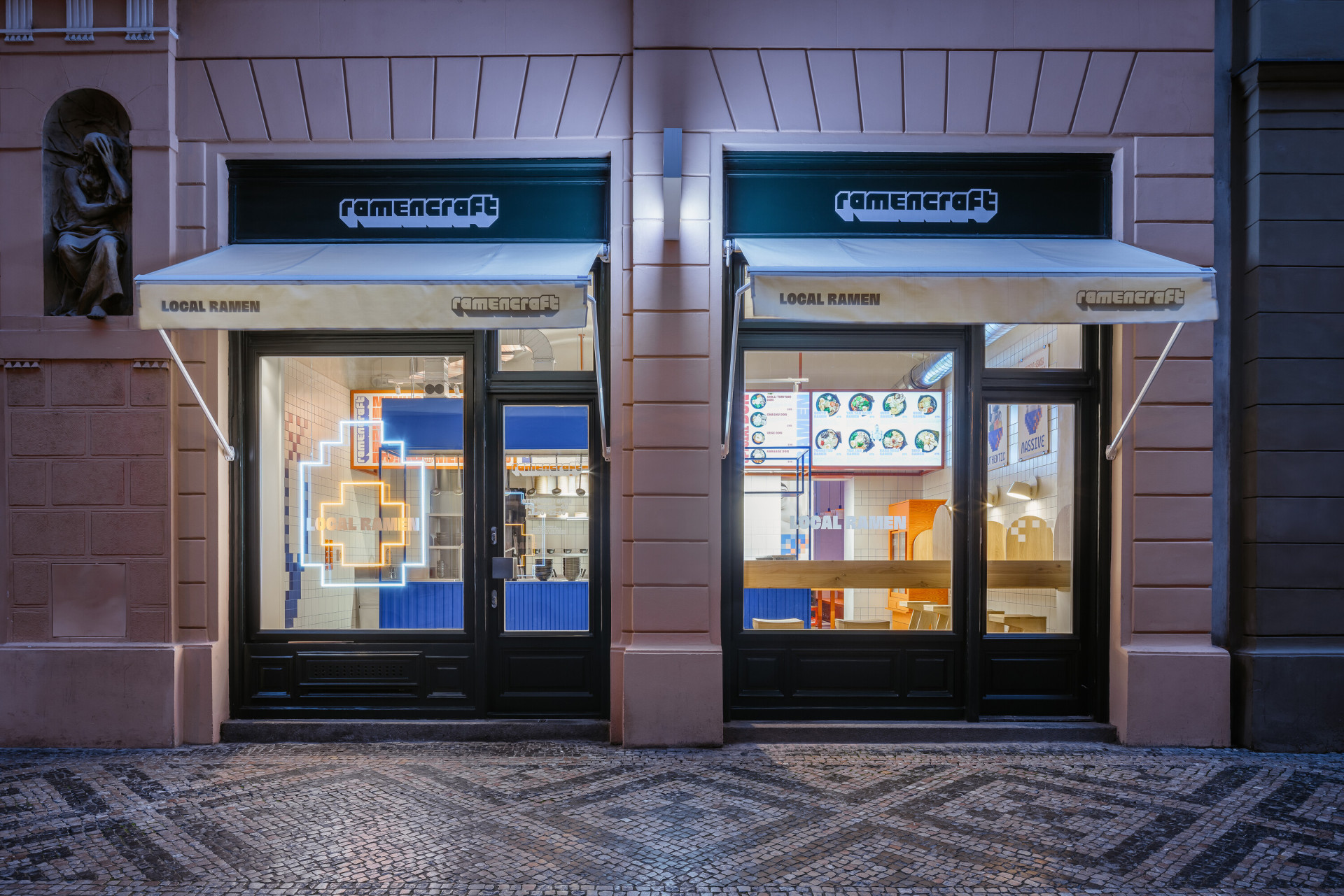 „Restaurace v srdci Prahy přináší jedinečné spojení japonské kultury, herního světa 8bitové grafiky a populární kultury do architektonického designu,“ píší ve své autorské zprávě SOA architekti. „Craft“ z názvu nového bistra lze volně vyložit jako „výroba“ – je to tedy restaurace, kde se vyrábí ramen. Vidět je to tady v přímém přenosu, kuchyně je otevřená, od zbytku restaurace oddělená jen plexisklem.