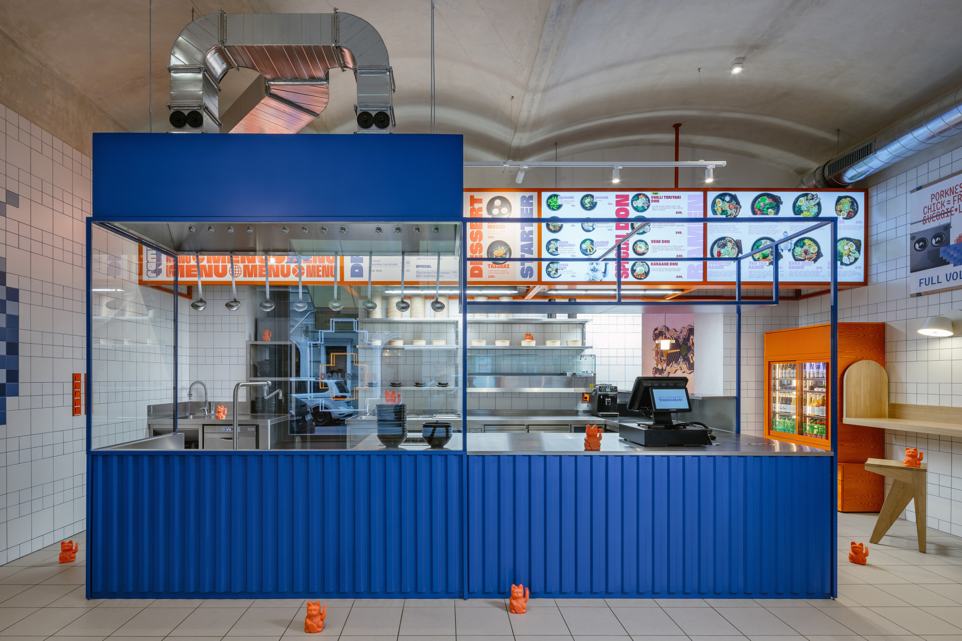 S kostičkami se v interiéru pracuje hlavně ve 2D formátu. Stěny pokrývají bílé obkladačky s modrými a červenými spárami, to jsou dvě hlavní barvy Ramencraftu. V barevné mozaice je na stěně ztvárněná tzv. „Czezilla“, tedy z obkladaček poskládaná „Godzilla“, která je ale záměrně roztomilejší než ta filmová. Navrhl ji grafický designér Tomáš Eisner a architekti jí vznešeně říkají „zosobnění českého přístupu k japonskému kulturnímu fenoménu“.