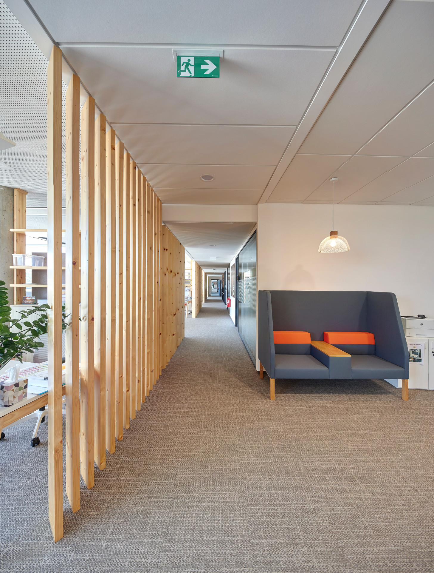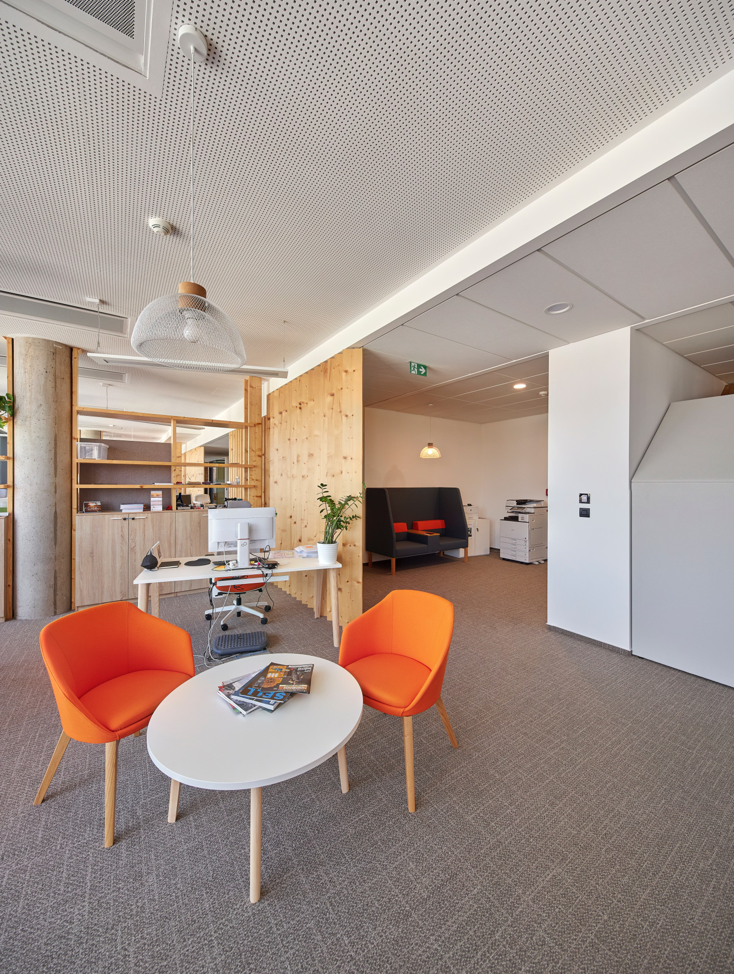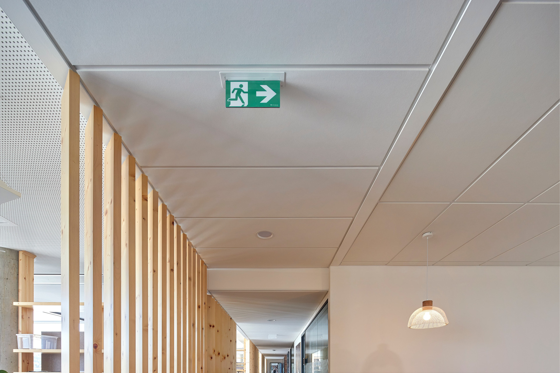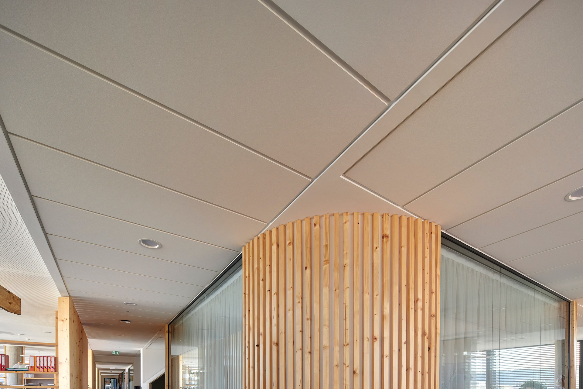 Dokonalou prostorovou akustiku zajišťují akustické perforované podhledy Rigitone. Maximální standard vzduchové neprůzvučnosti zajišťují kromě desek Habito® H i Modré akustické desky s technologií Activ´ Air®, které vedle izolace zvuku zvládnou také rozkládat emise formaldehydu. Uživatelé kanceláří tedy mají jak potřebný klid na práci, tak čisté a zdravé prostředí.