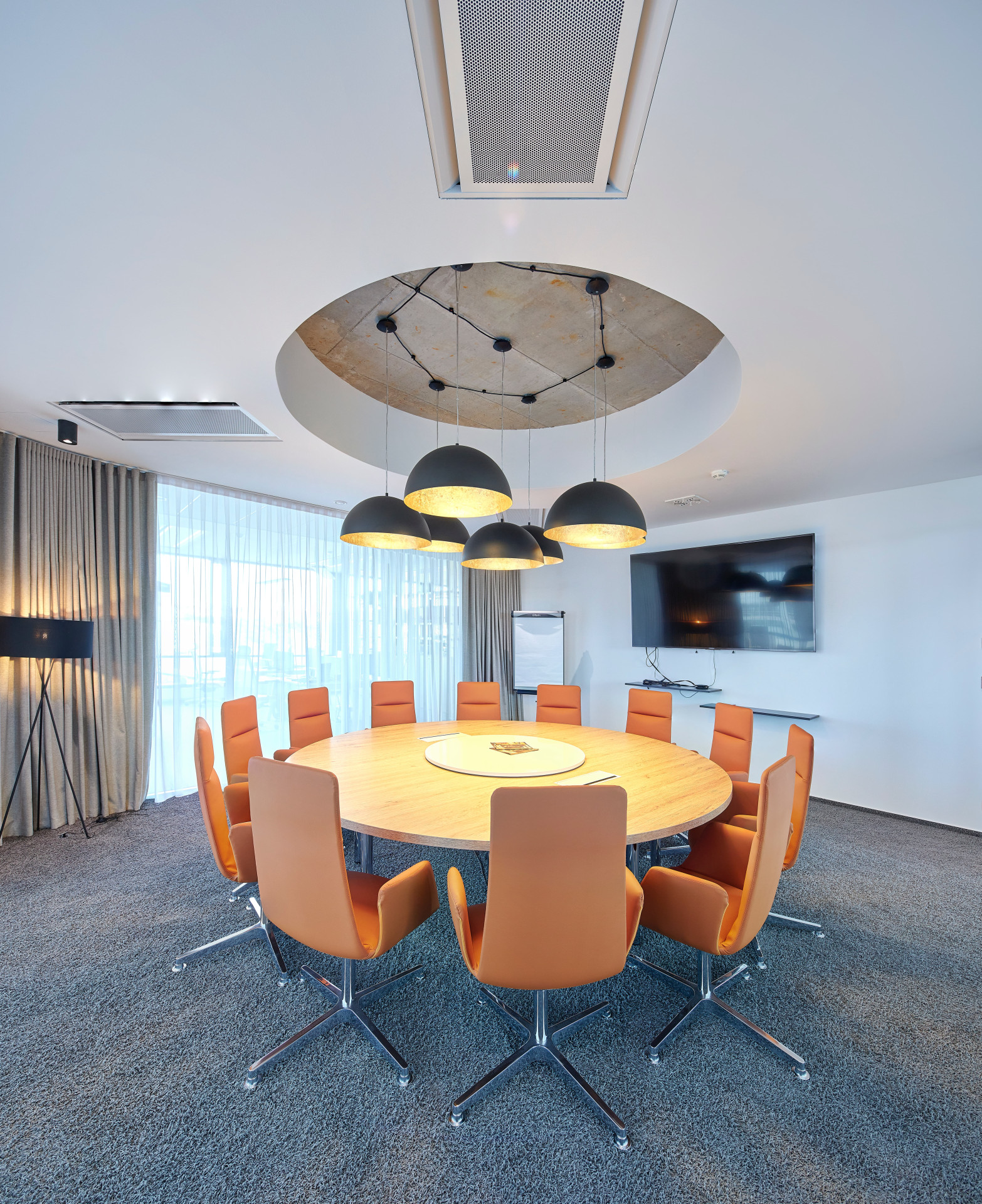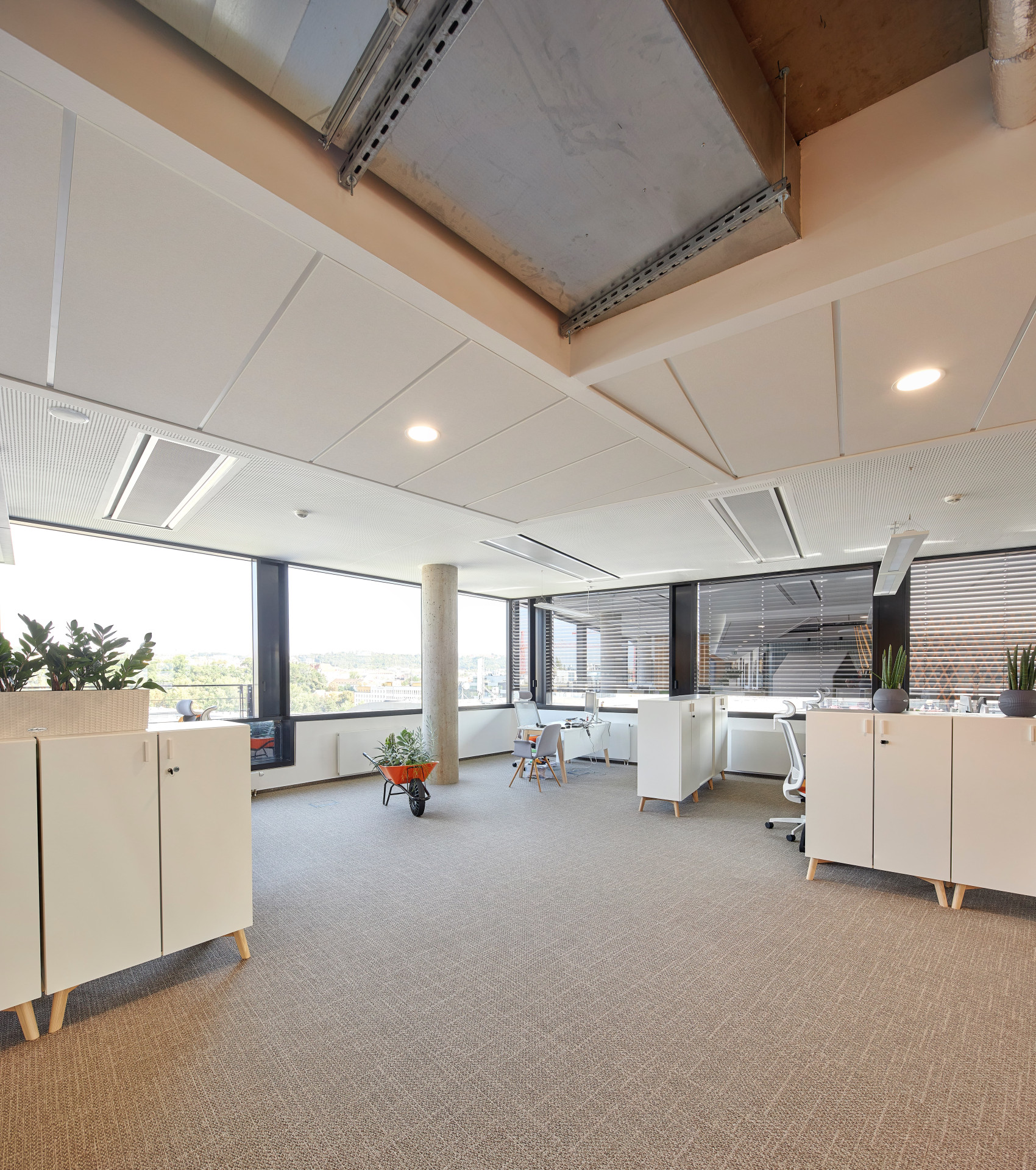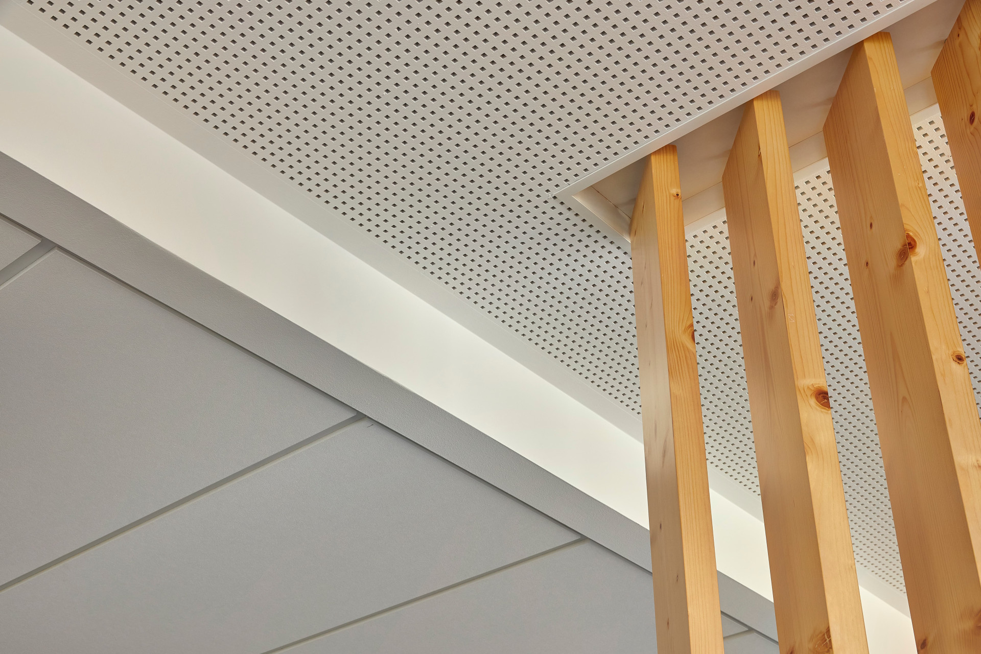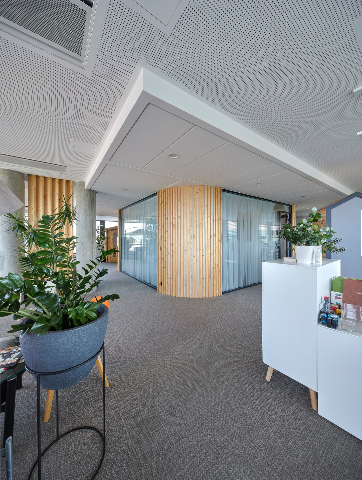 Dokonalou prostorovou akustiku zajišťují akustické perforované podhledy Rigitone. Maximální standard vzduchové neprůzvučnosti zajišťují kromě desek Habito® H i Modré akustické desky s technologií Activ´ Air®, které vedle izolace zvuku zvládnou také rozkládat emise formaldehydu. Uživatelé kanceláří tedy mají jak potřebný klid na práci, tak čisté a zdravé prostředí.