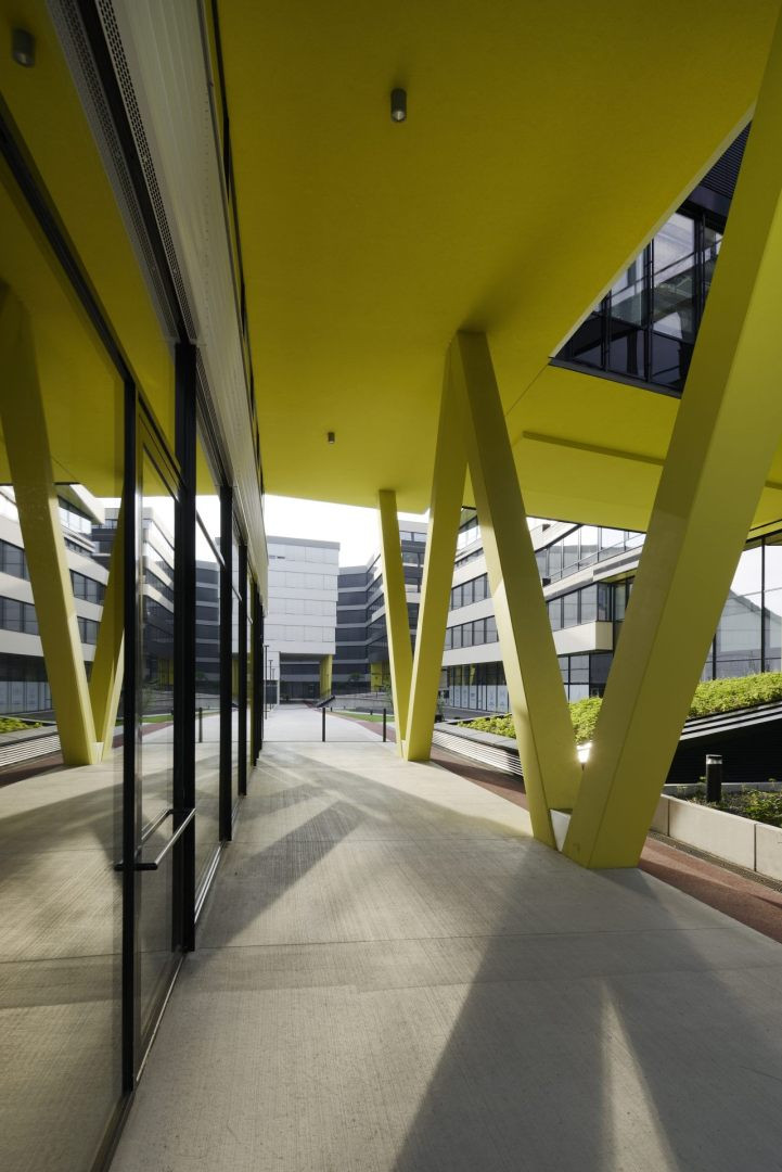 Díky fasádě složené z průběžných horizontálních pásů v černobílé kombinaci působí soubor sjednoceně. Stavba zaujme také svou zelenou střechou, která se směrem k Vltavě snižuje, a vytváří tak soukromé terasy dostupné nájemníkům. Spodní vykonzolované části přímo nad parterem kryjí zavěšené podhledy ze žlutého plechu, které do realizace vnáší živou barvu.