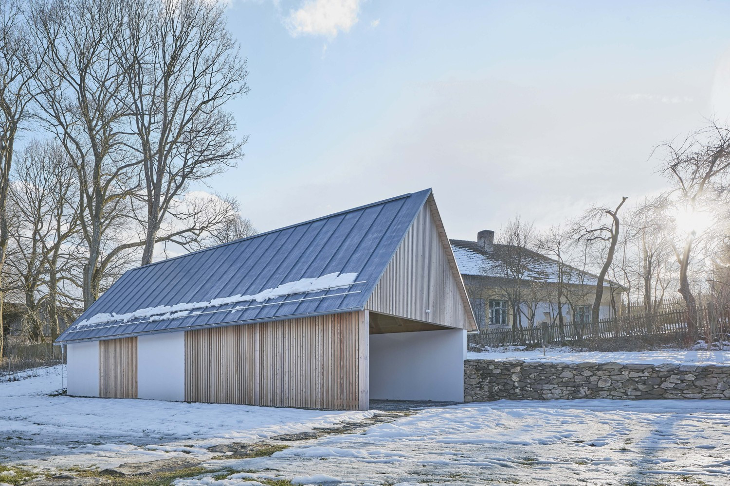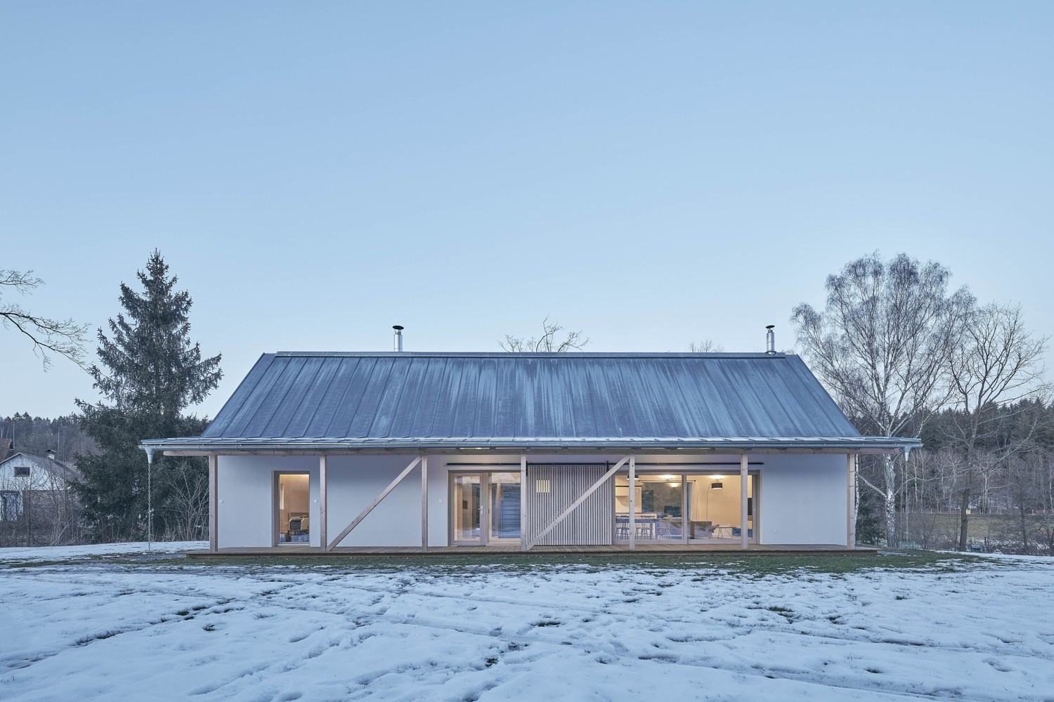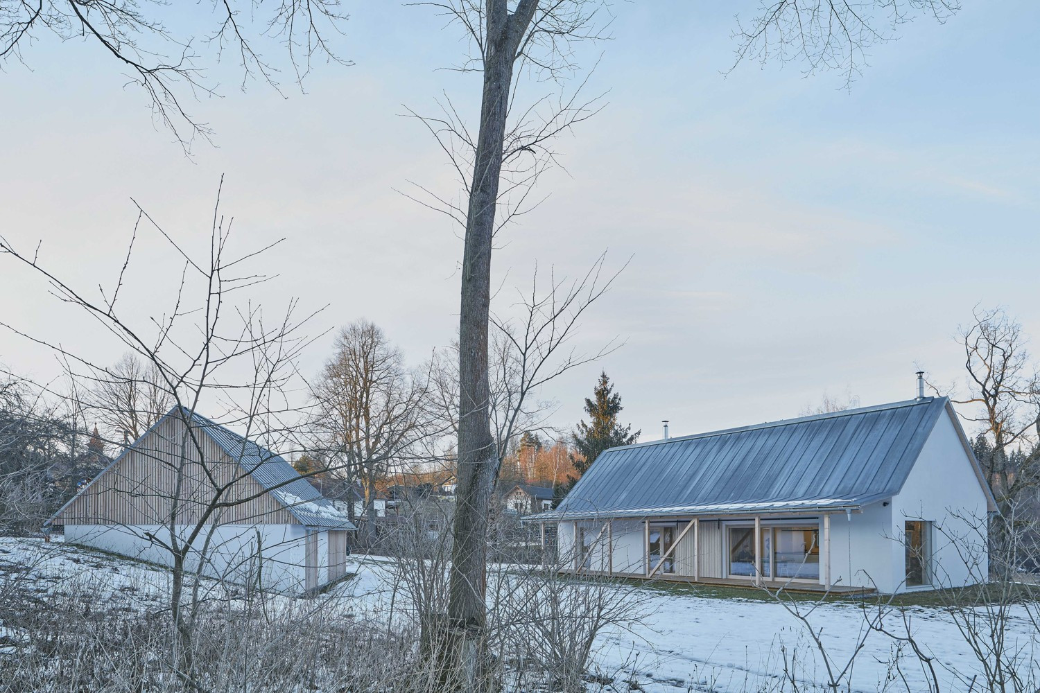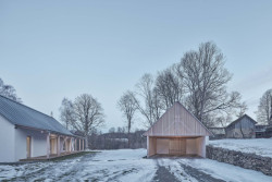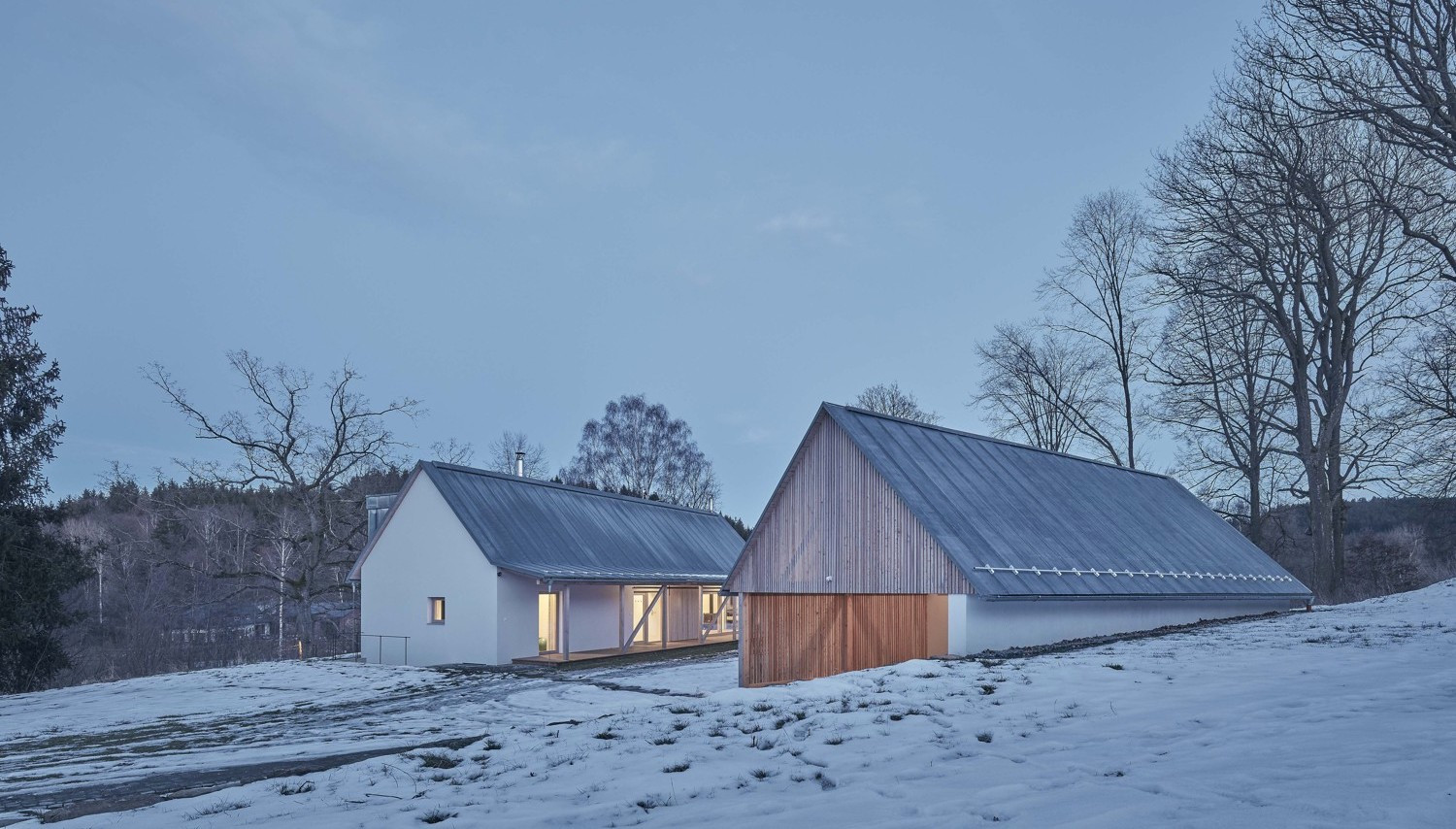 V malé obci na Vysočině vznikly dva hmotově příbuzné objekty. Dvoupodlažní stavba slouží bydlení, sousední stodola pak funguje jako garáž a skladovací prostor. Architekti Pavel Machar a Radek Teichman navrhli dům se stodolou tak, aby svým charakterem korespondovaly s okolním venkovským prostředím. Obě stavby navíc vycházejí z půdorysné stopy bývalého statku.