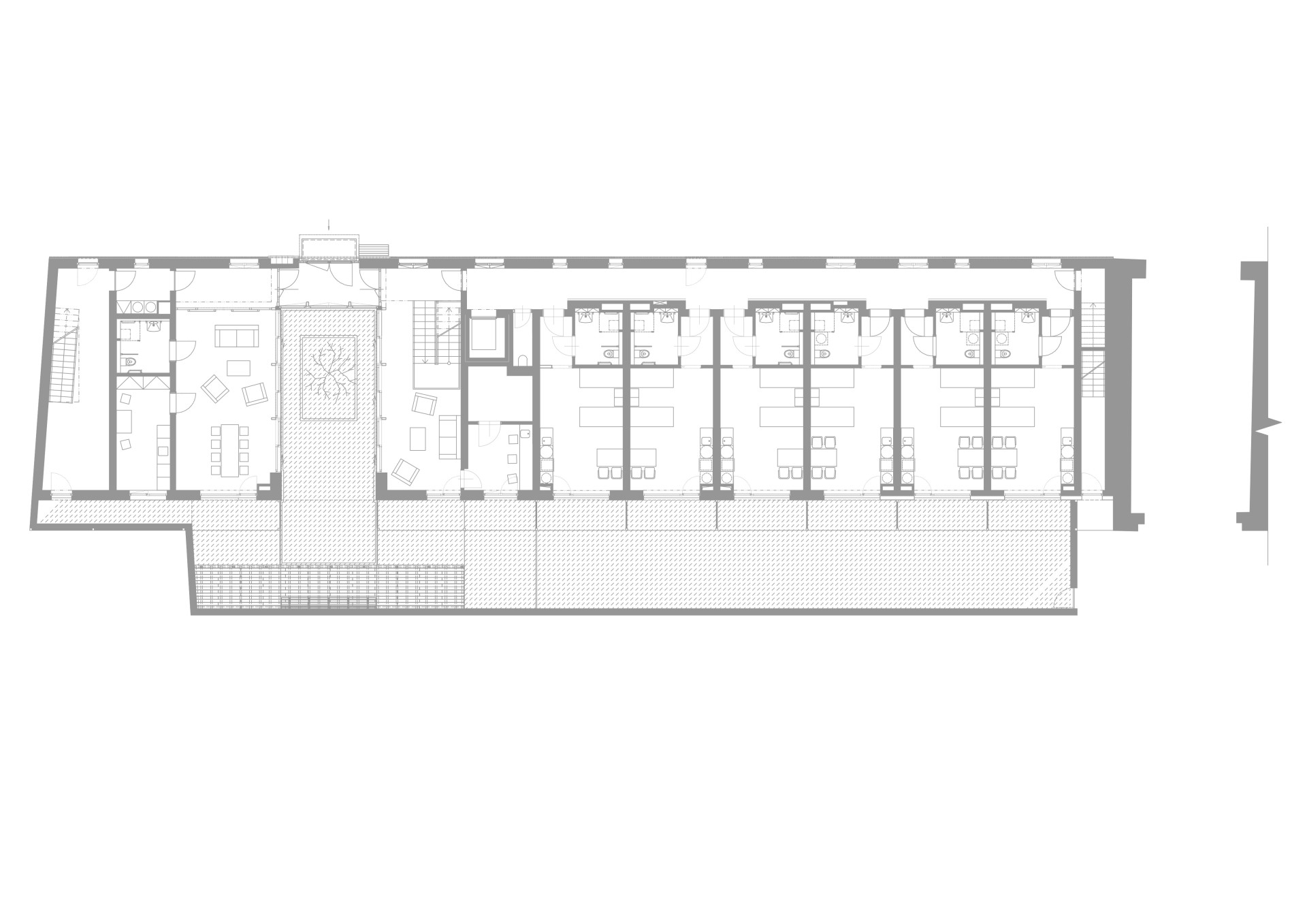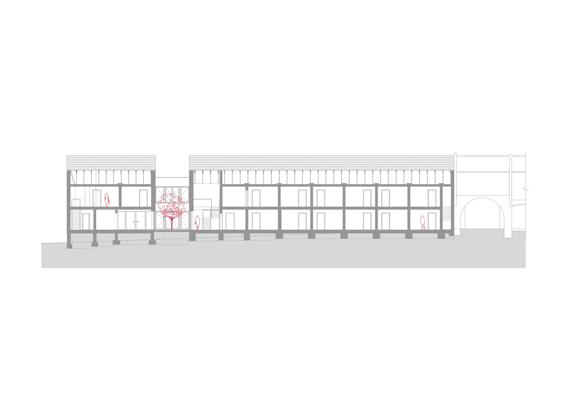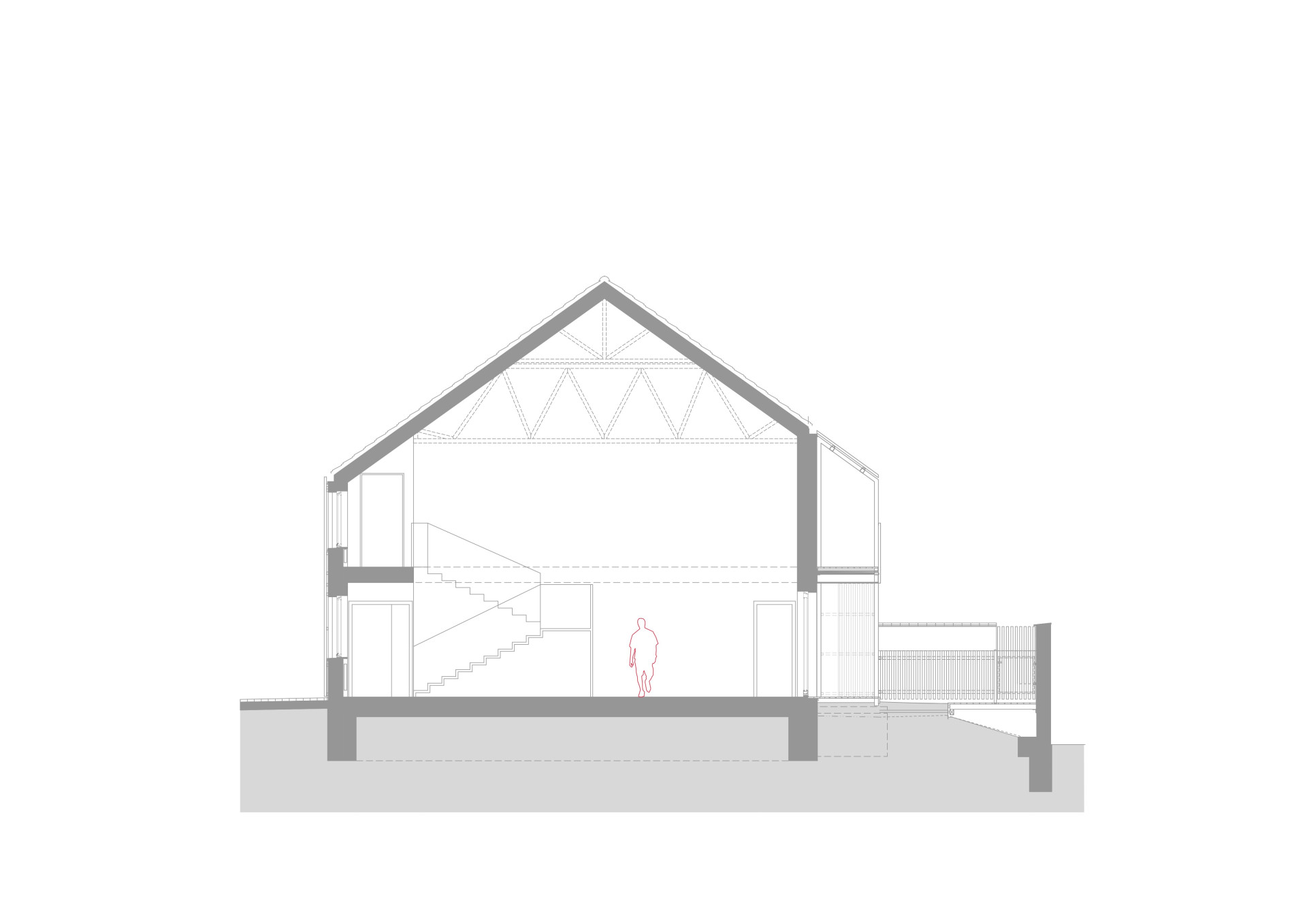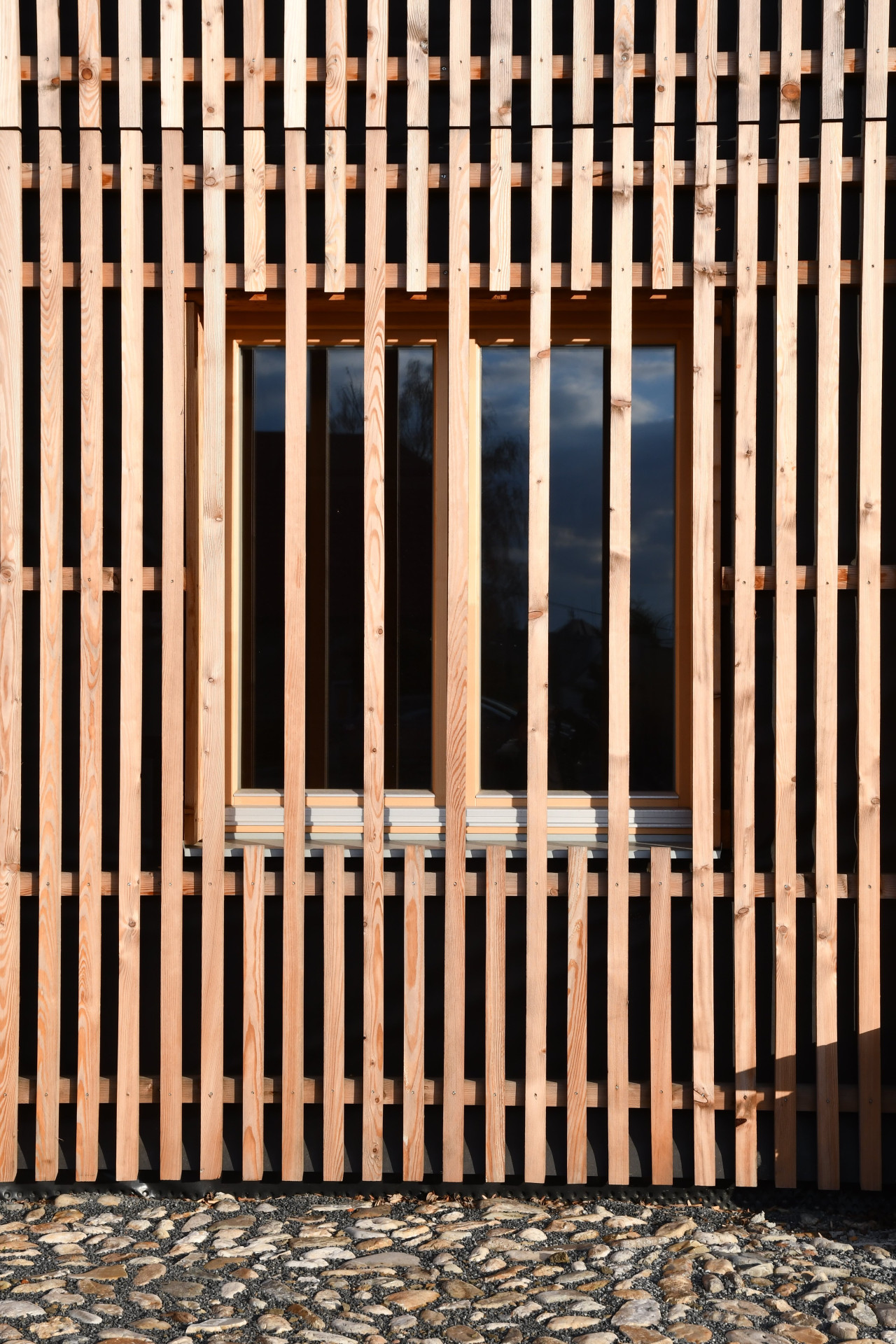 Novostavba je podlouhlá, završuje ji sedlová střecha, fasádní plášť je z modřínových latí, které směrem do ulice přecházejí i přes okna. Architekti je zde tak navrhli kvůli stínění chodby a „scelení objemu“, výsledek je přísným archetypem, architekturu stodol připomíná taky, ačkoliv zde z té původní nic nezůstalo.