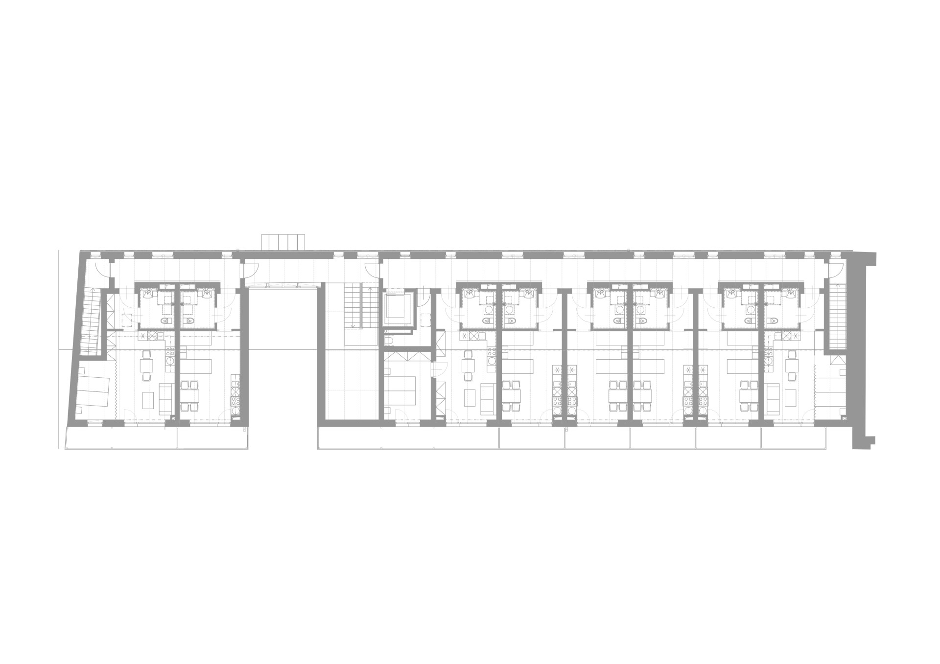 Stavba se otevírá do čtvercového dvora, kde stojí taky památkově chráněná sýpka. Směřují k ní zavěšené balkony a soukromé zahrádky. Balkon nebo zahrádku a také velká okna má každý seniorský byt. Jednotek je v domě 14, většina jednopokojových. Každá má svou vlastní kuchyňku, koupelnu s wc a prostor pro postel nebo postele, bydlet zde mohou jednotlivci nebo dvojice.