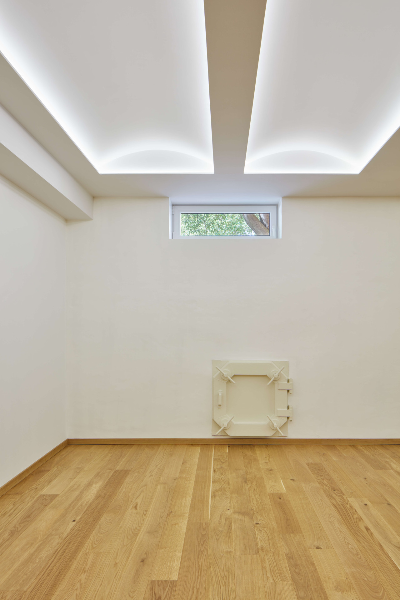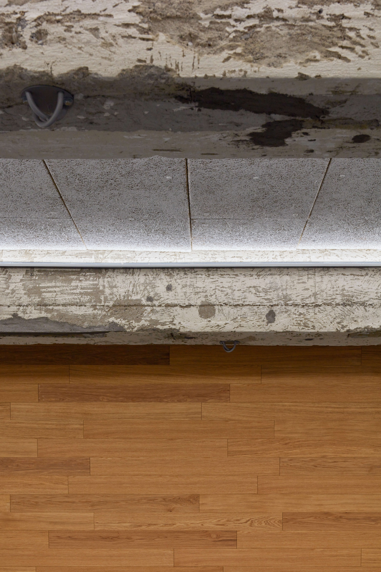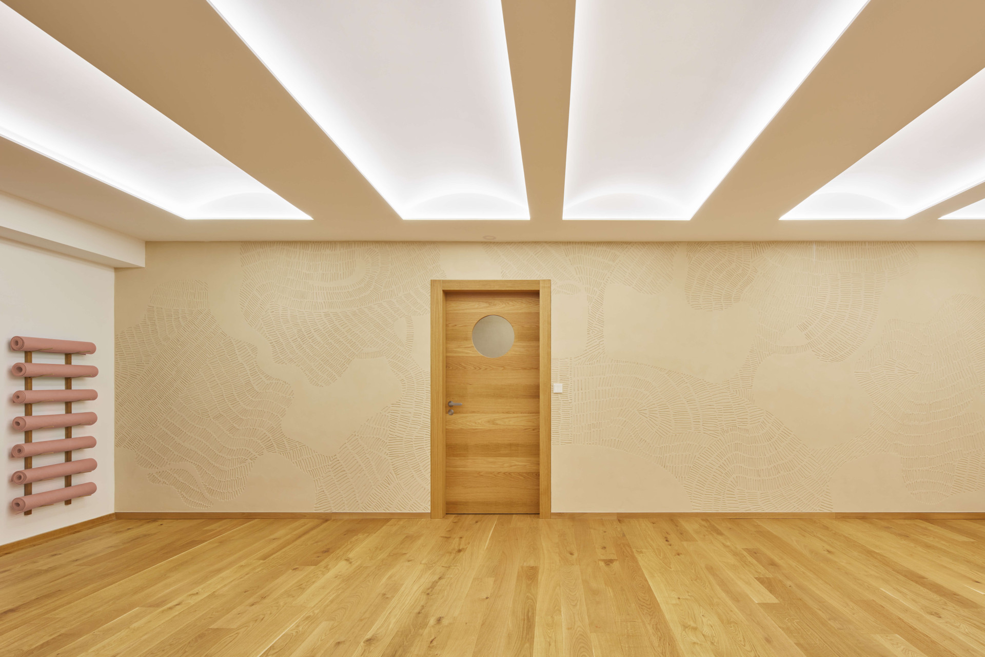 Malý sál je oproti tomu velkému útulnější, pracovalo se v něm s nepřímým osvětlením falešných kleneb na stropě, které cvičící neoslňuje v žádné poloze, a taky s přírodními materiály. Třeba s hliněnou omítkou, do které je vyškrabaný obraz.