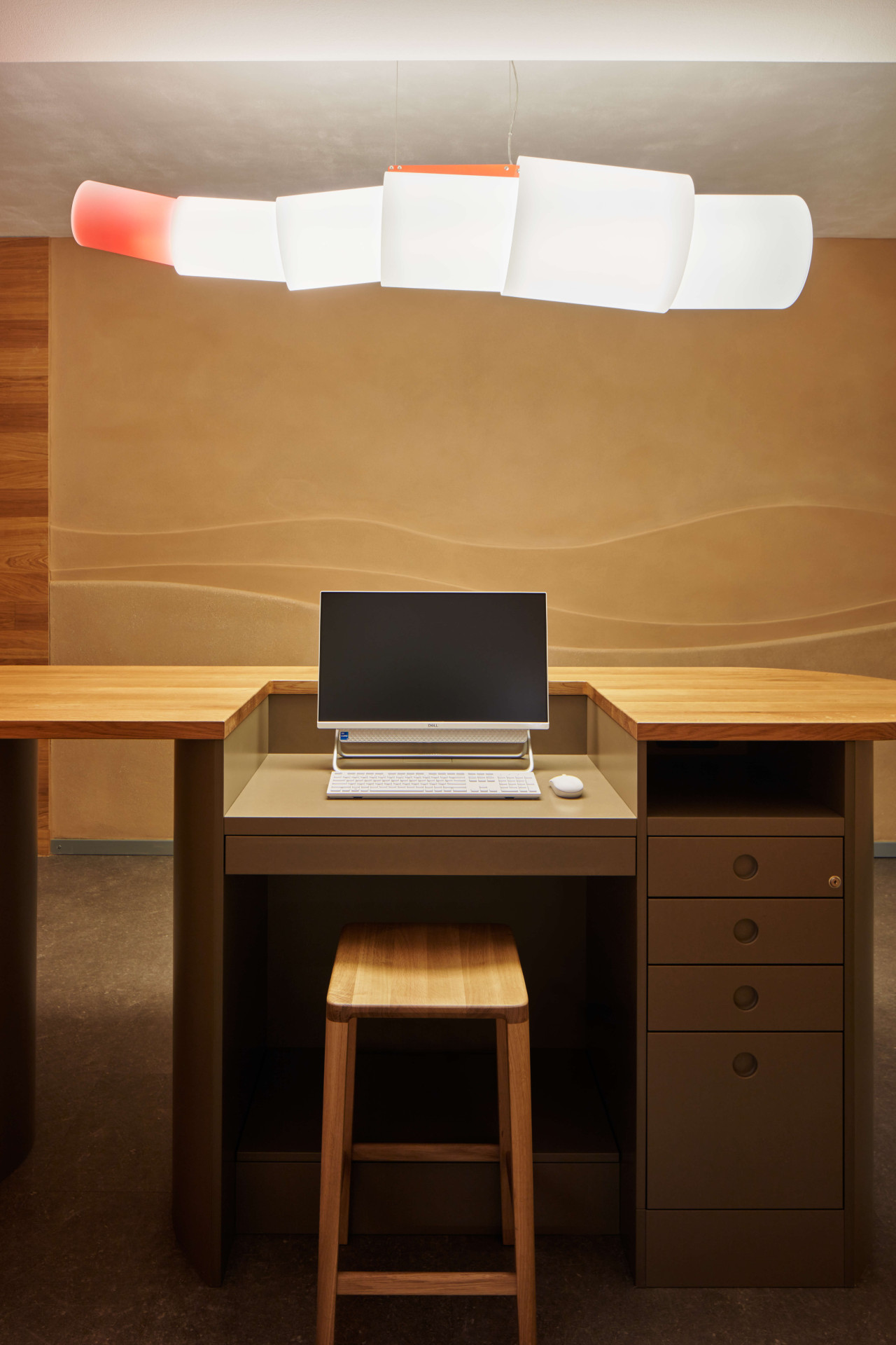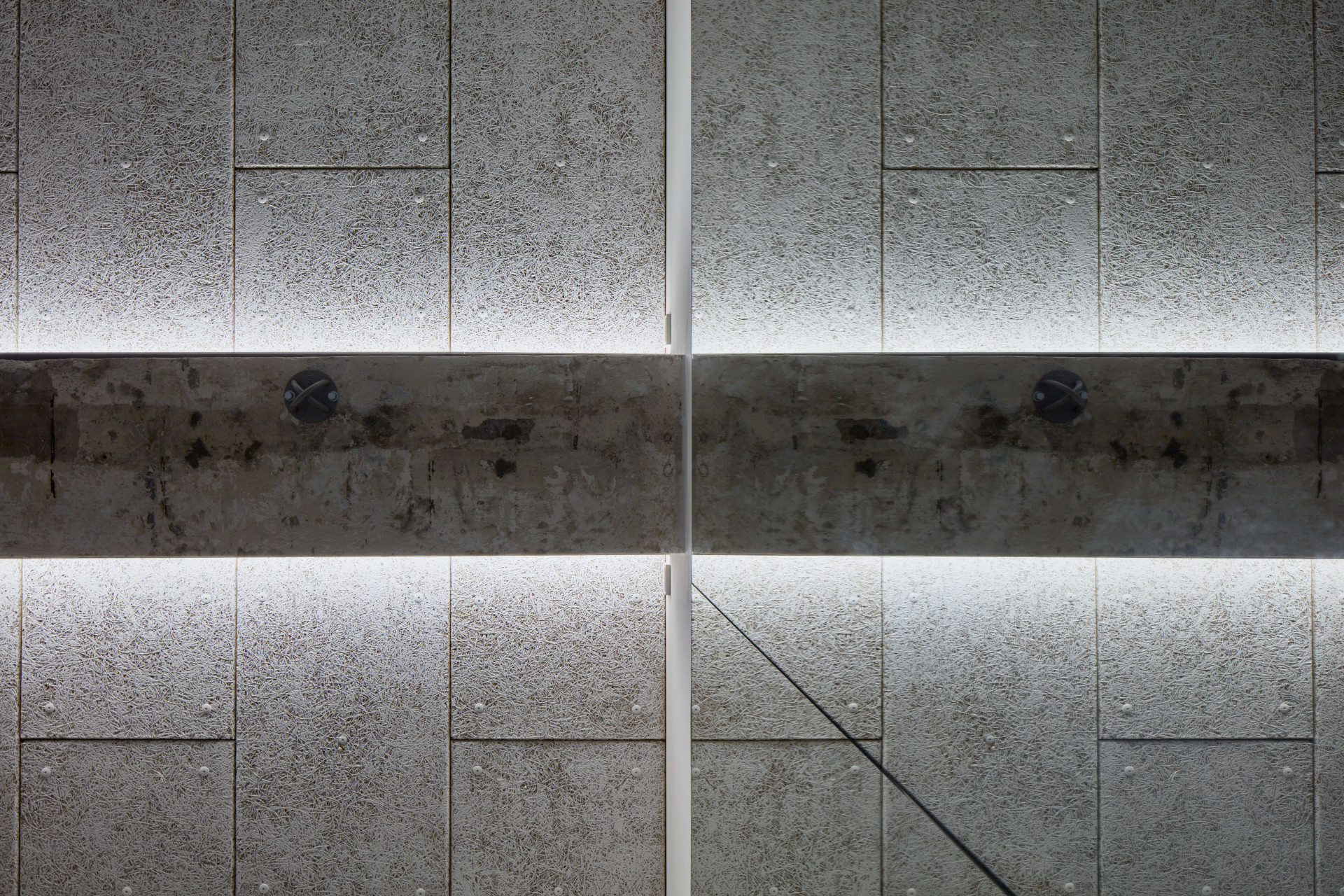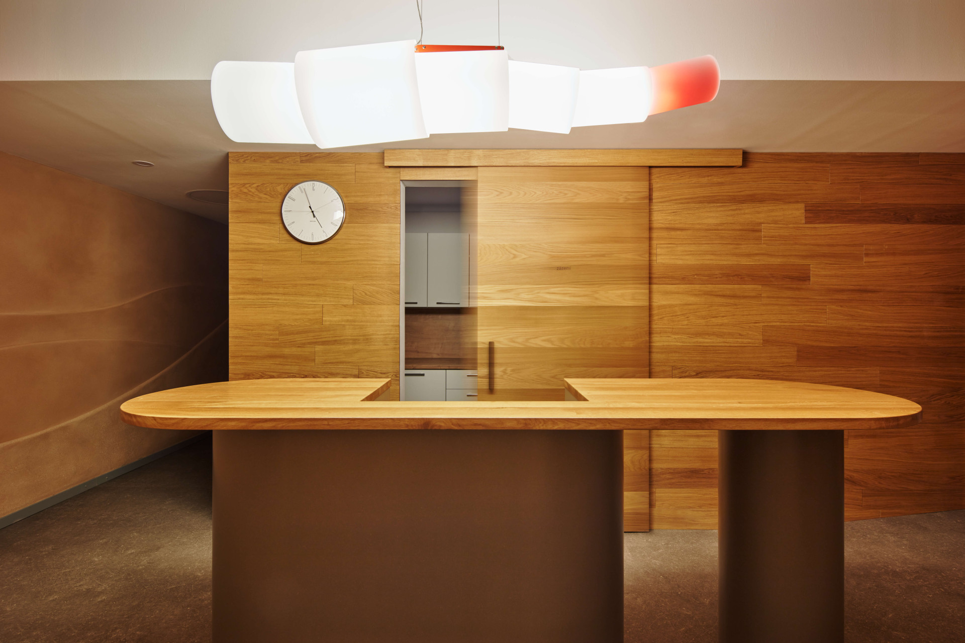 Malý sál je oproti tomu velkému útulnější, pracovalo se v něm s nepřímým osvětlením falešných kleneb na stropě, které cvičící neoslňuje v žádné poloze, a taky s přírodními materiály. Třeba s hliněnou omítkou, do které je vyškrabaný obraz.