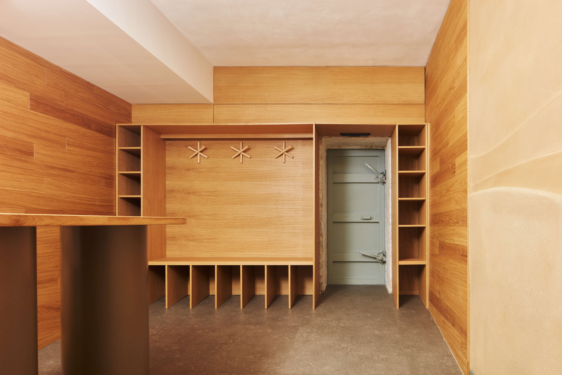 Tentýž materiál je taky na stěnách i skříních – dřevo do jógových studií patří. Jeho teplé odstíny lahodí očím a struktura je příjemná na dotek. Pod podlahou tady navíc vede podlahové topení, od nohou tedy zima nebude.