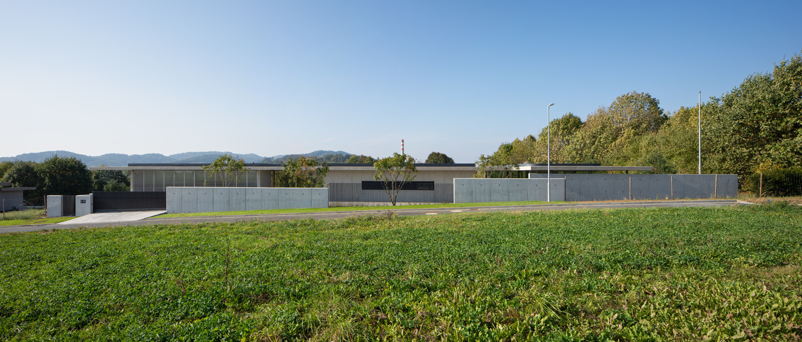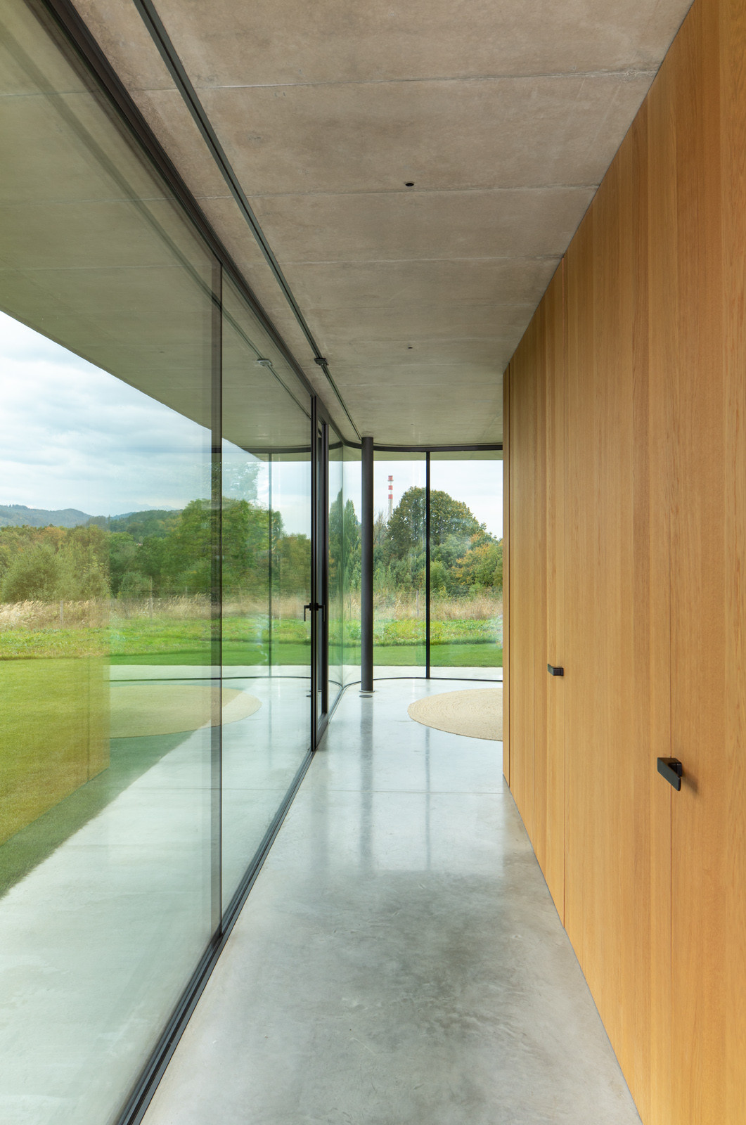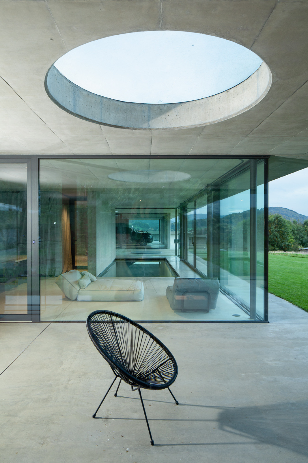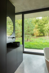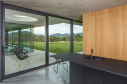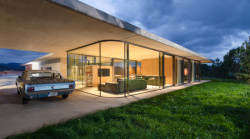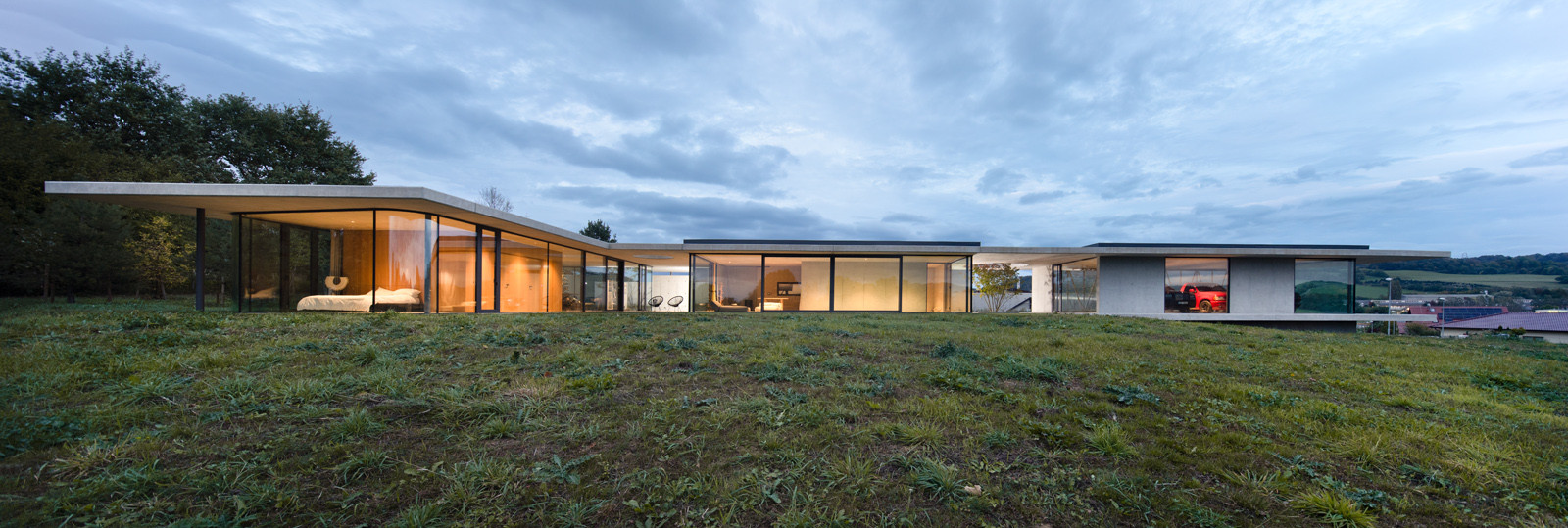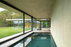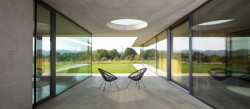 Tři prosklené pavilony stojí zády k ulici. Majiteli domu poskytují soukromí a výhledy především do zahrady a okolní přírody. Těžký chladný beton je zde v kontrastu s lehkou transparentní konstrukcí, i přesto ale dům působí hřejivým dojmem.