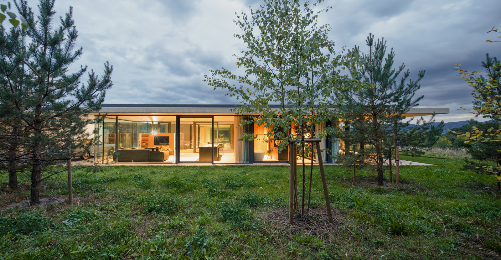 Každý z pavilonů má jinou funkci. První z nich je téměř celý prosklený a slouží pro bydlení. Velkorysý obytný prostor spojený s kuchyní přechází plynule do ložnice s výhledem do okolní krajiny. „Jen o pár kroků vedle čeká nenápadná sauna, vnitřní bazén a domácí posilovna. Sókratés by to nazval pavilonem pro péči o duši. Poslední plán je královstvím svého pána. Majitel domu je nadšenec do aut a do lodí, a tak bylo zapotřebí vytvořit stáj i pro tyto koníčky, na které by byla škoda nevidět,“ popisují druhou a třetí část domu architekti.